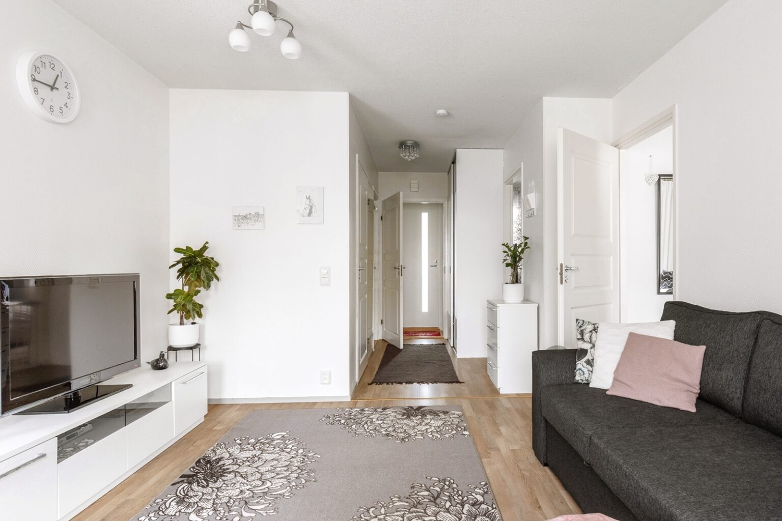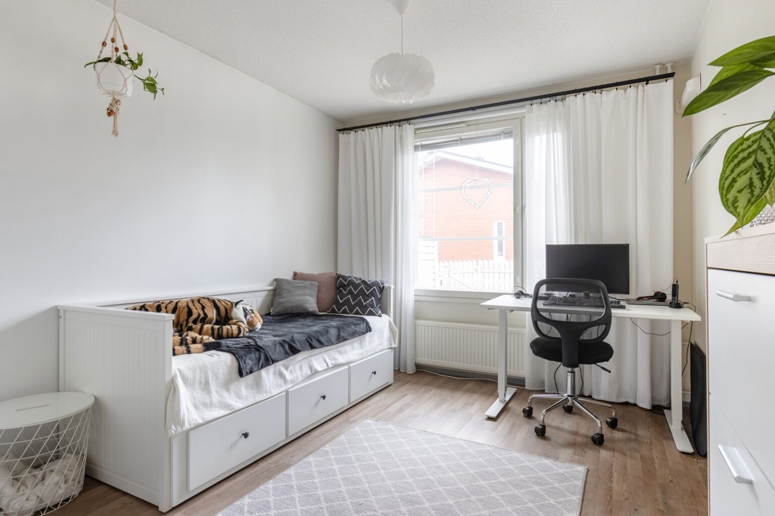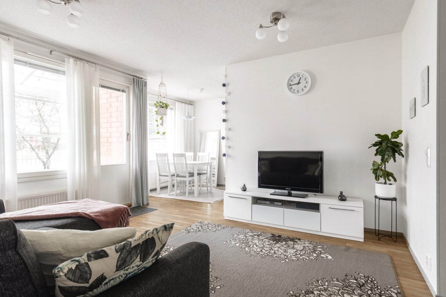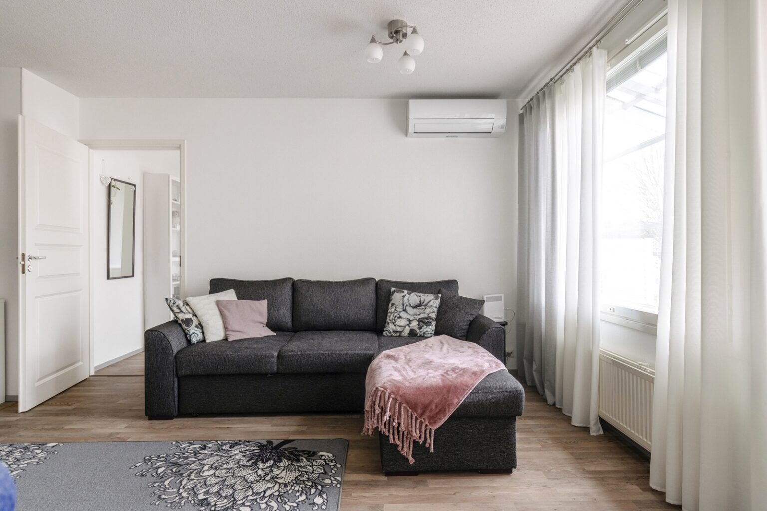 Olohuoneesta löytyy ilmalämpöpumppu viilennystä tuomaan kesähelteille.