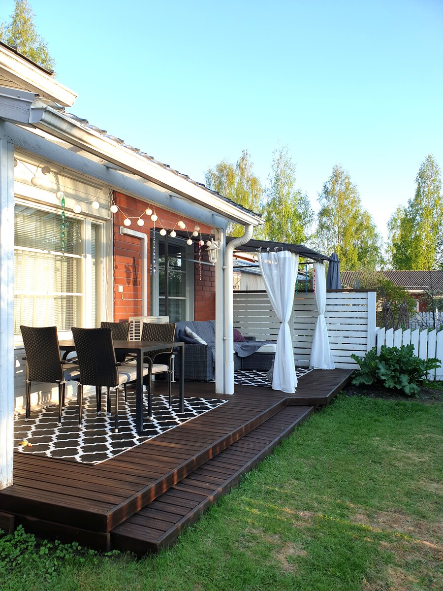 Kodista löytyy kaksi hyvänkokoista makuuhuonetta, erillinen WC, kodinhoitotila/-huone, kylpyhuone, sauna, keittiö ja kivan valoisa olohuone, josta on käynti länteen päin avautuvalle piha-alueelle.