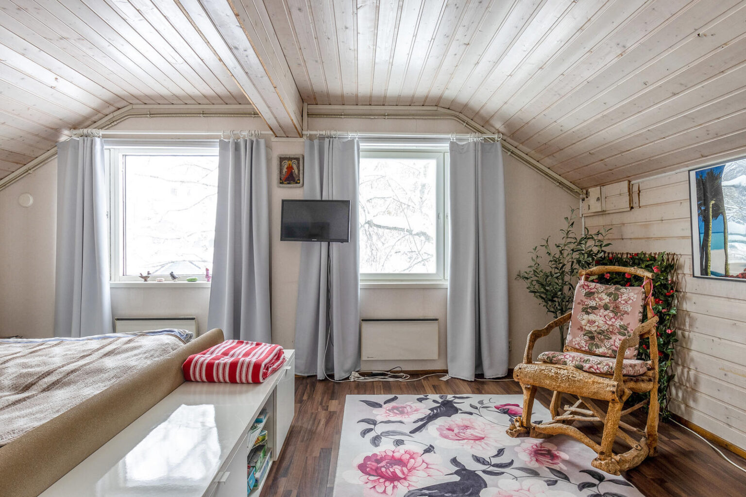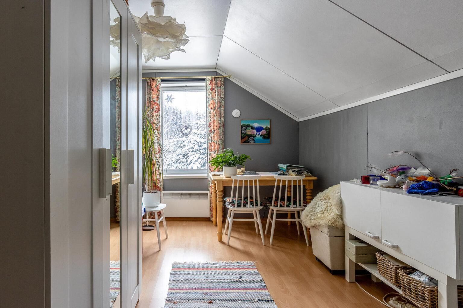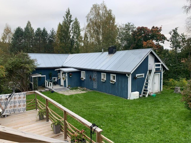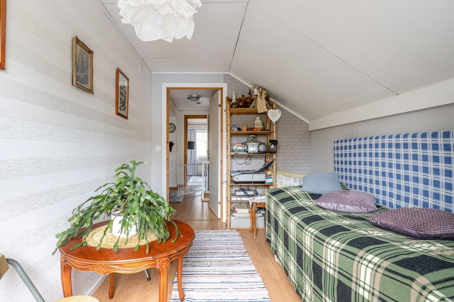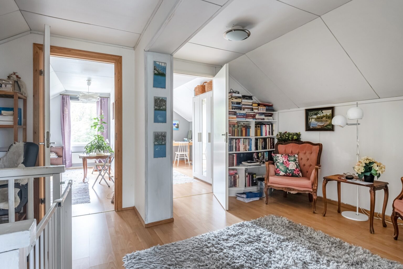 Asuinhuoneisto on osin kahdessa tasossa. Yläkerrassa on kolme makuuhuonetta.