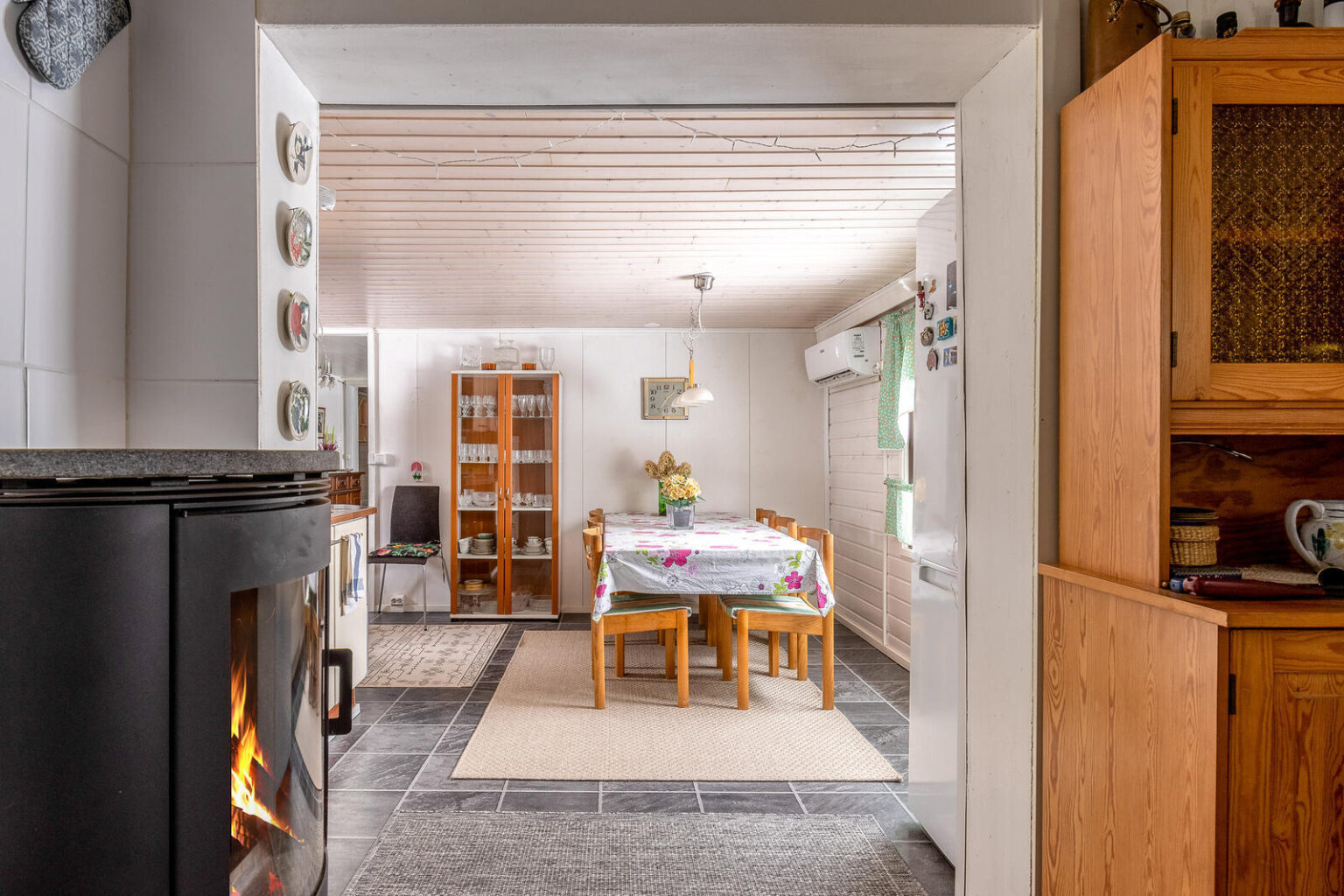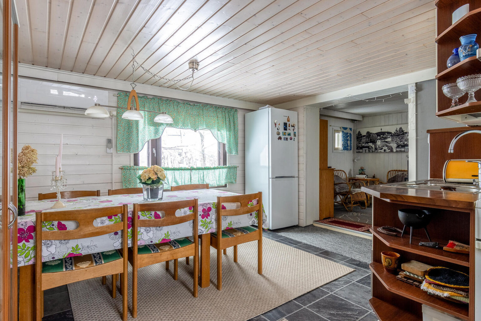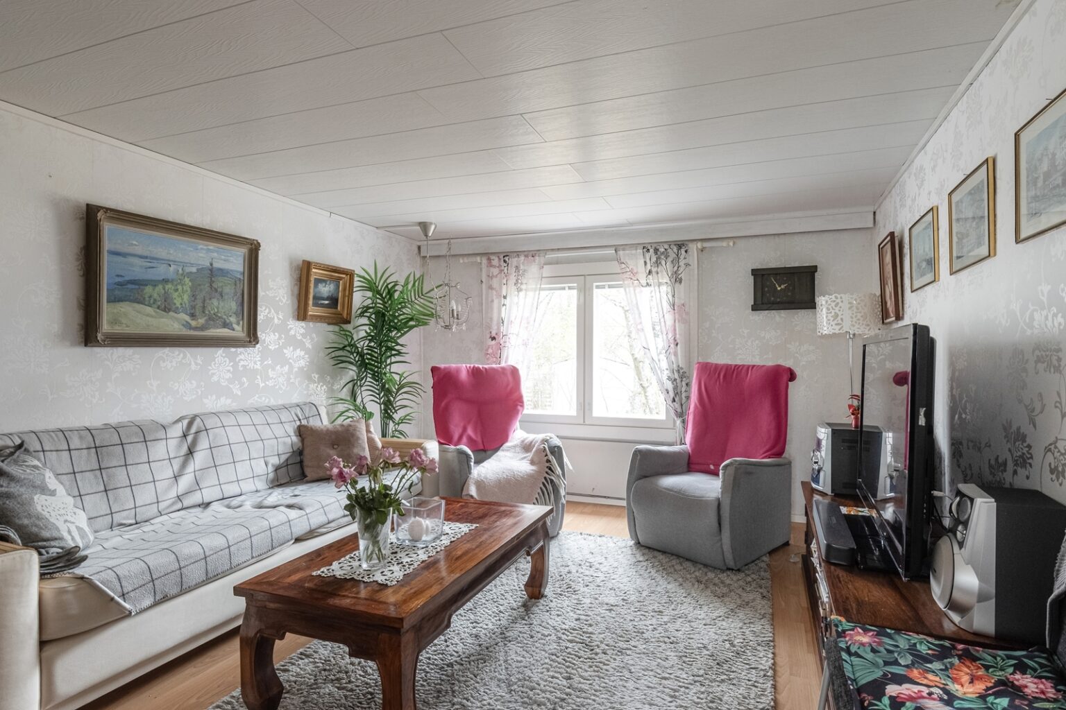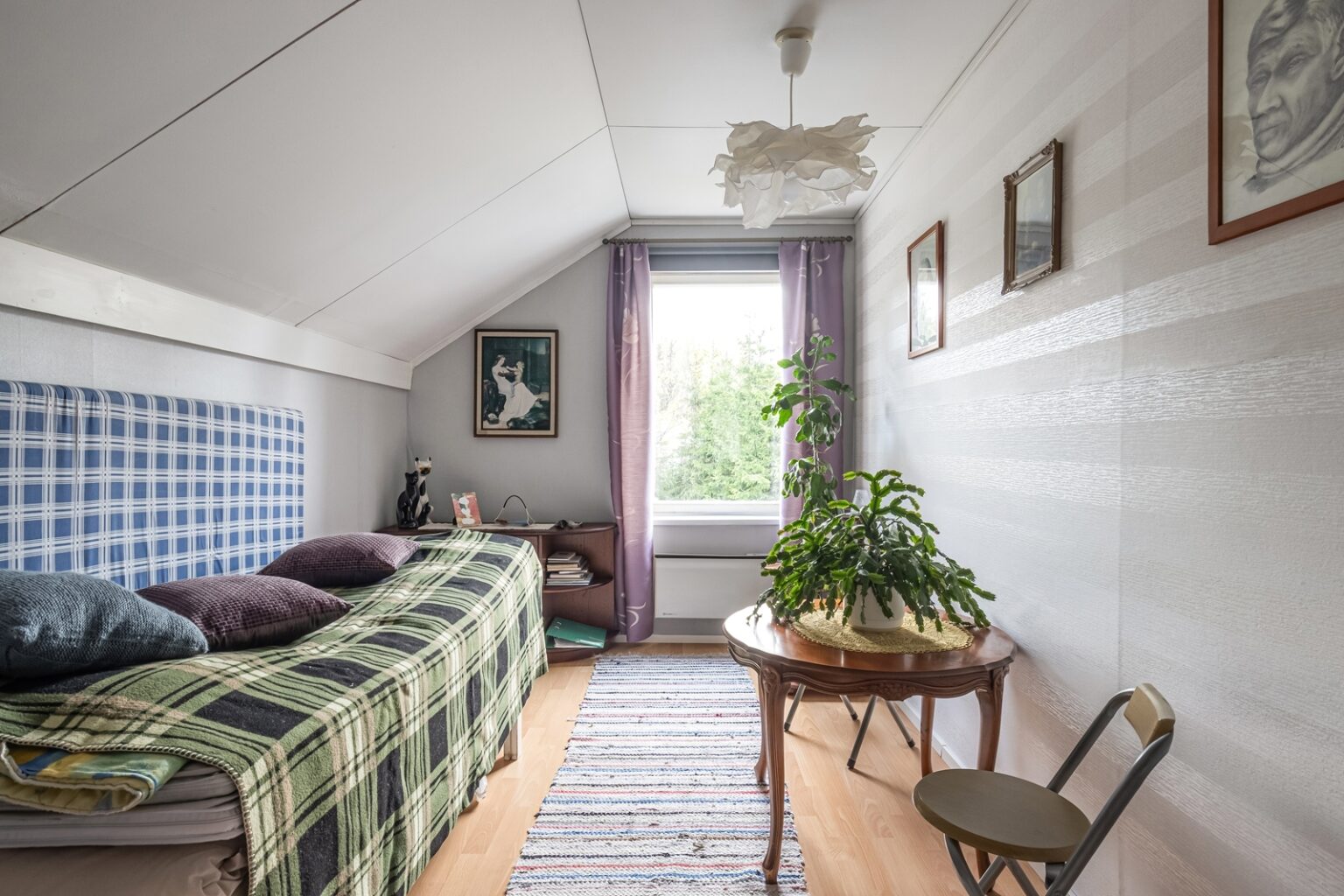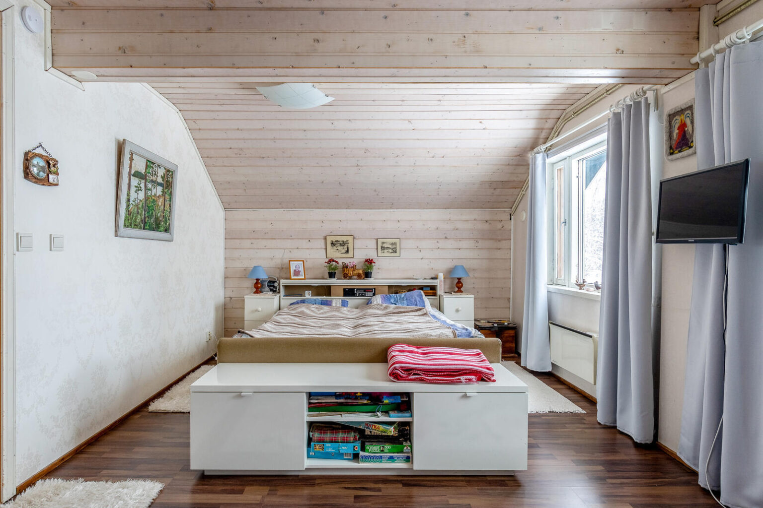 Asuinhuoneisto on osin kahdessa tasossa. Yläkerrassa on kolme makuuhuonetta.