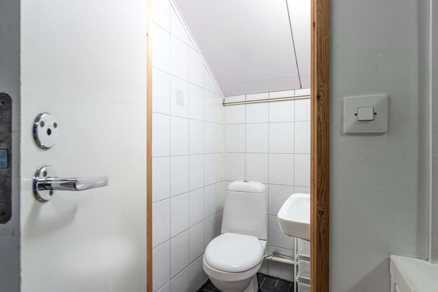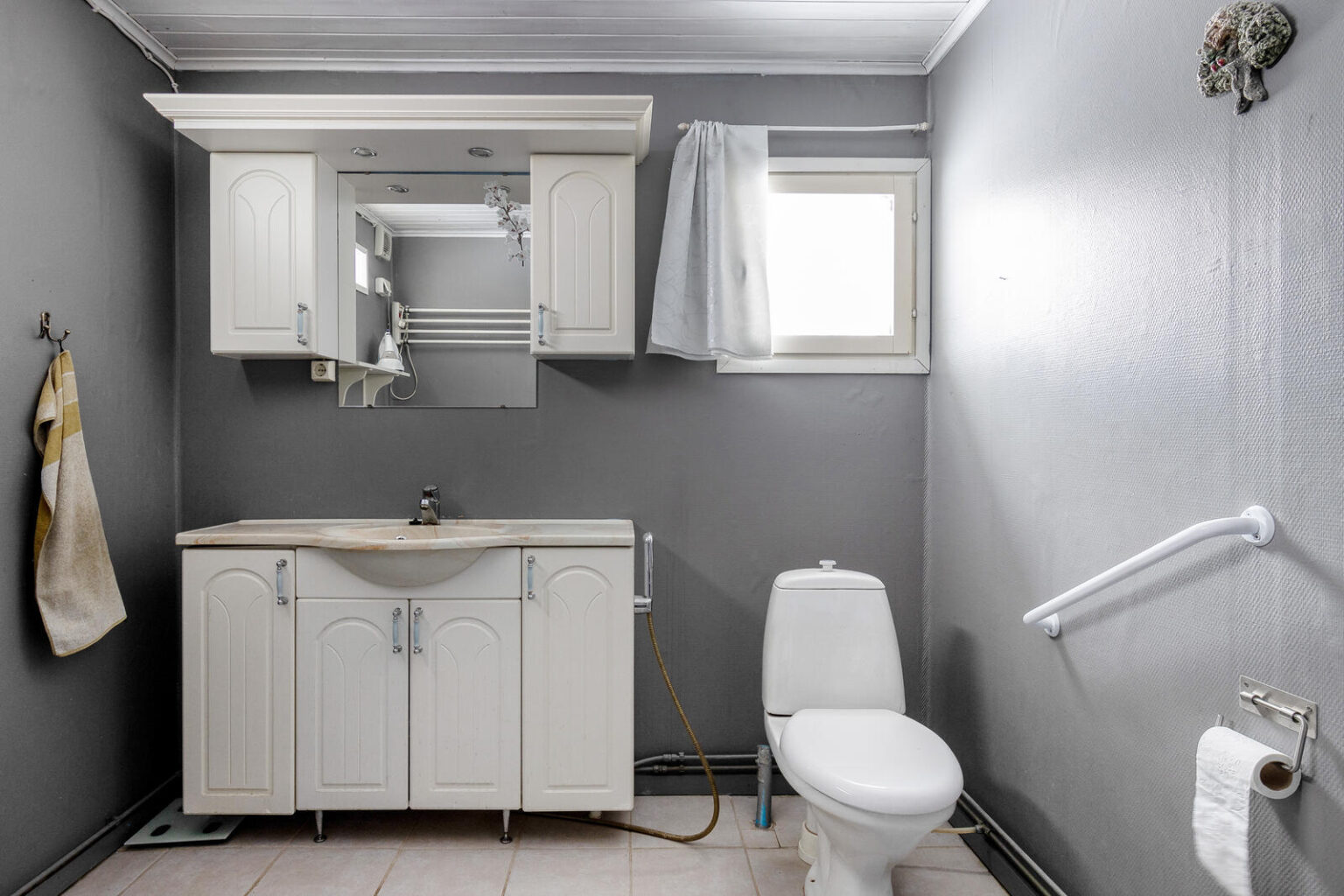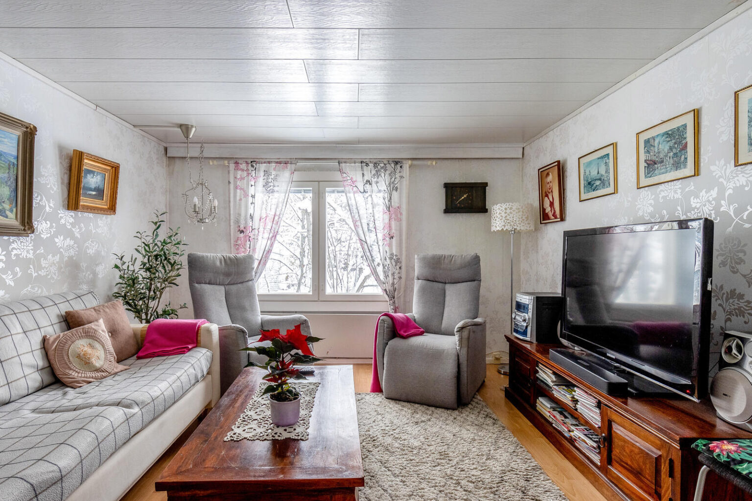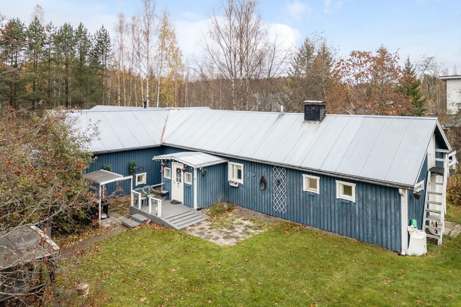 Asuinhuoneisto on osin kahdessa tasossa. Yläkerrassa on kolme makuuhuonetta.