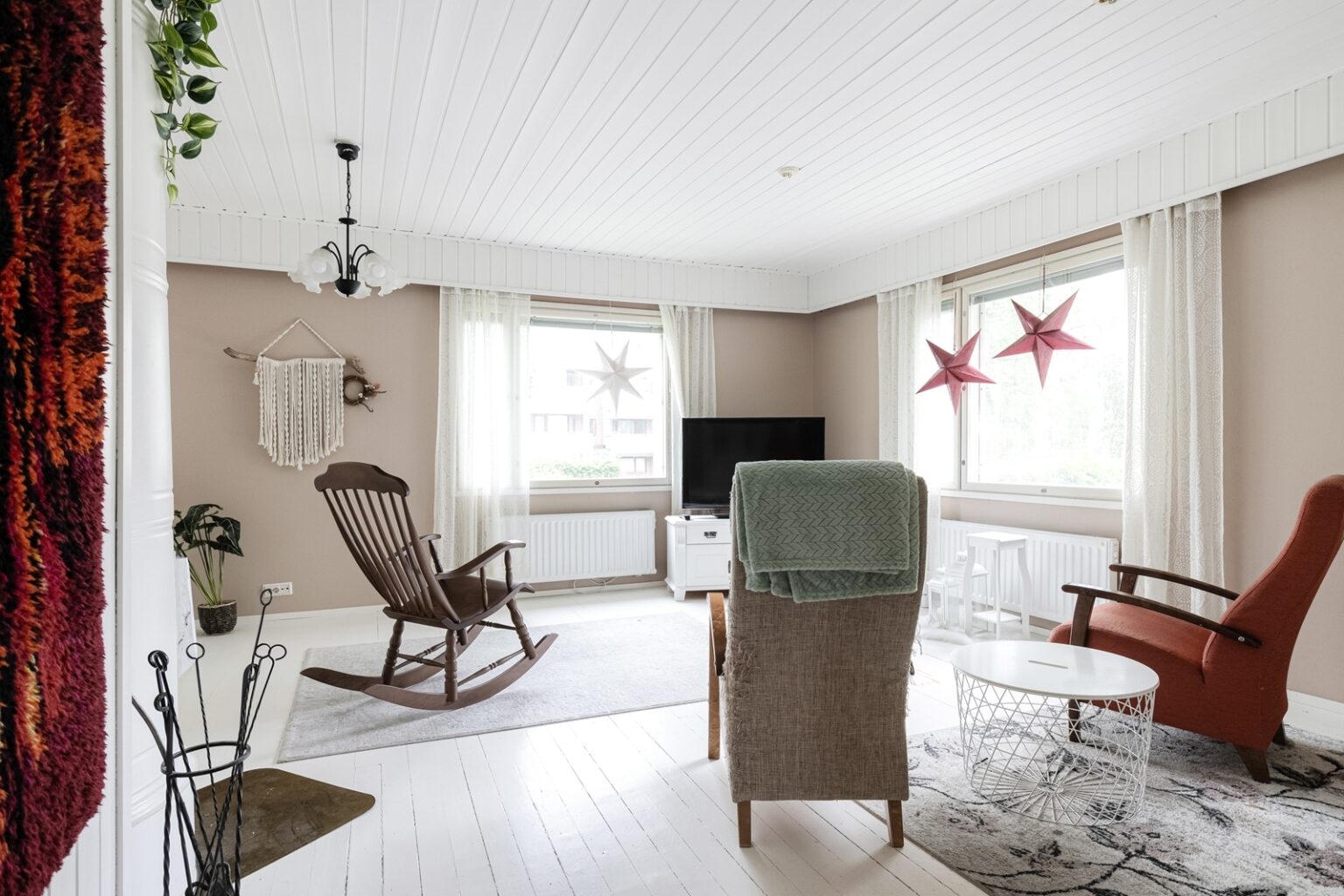 Valoisa olohuone, jossa on tilaa rentoutua perheen ja ystävien kanssa.