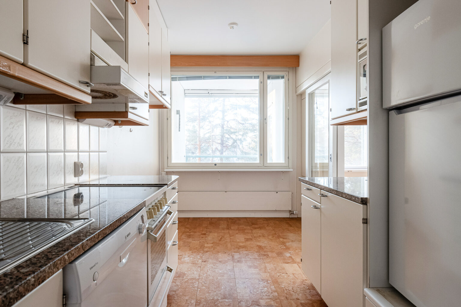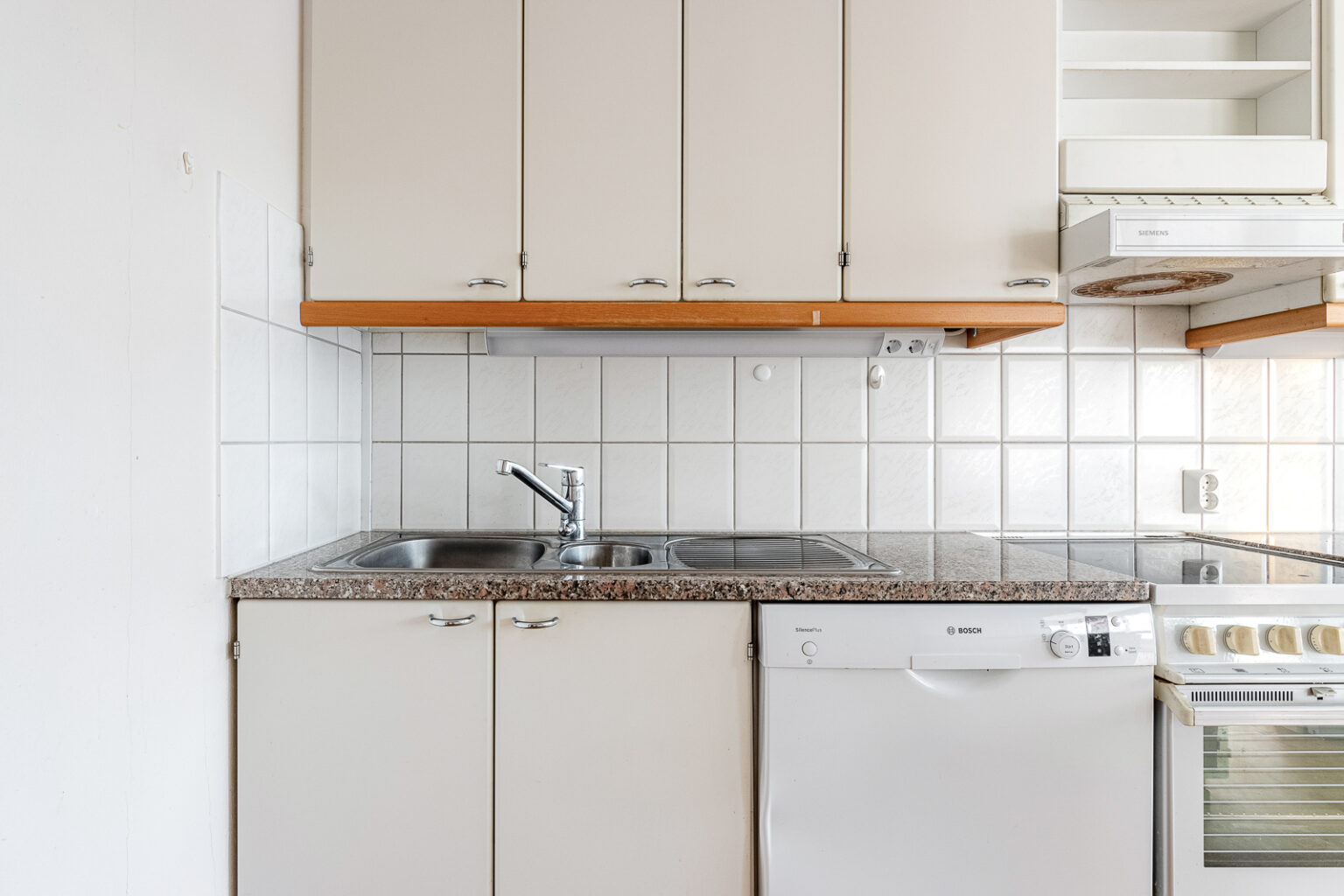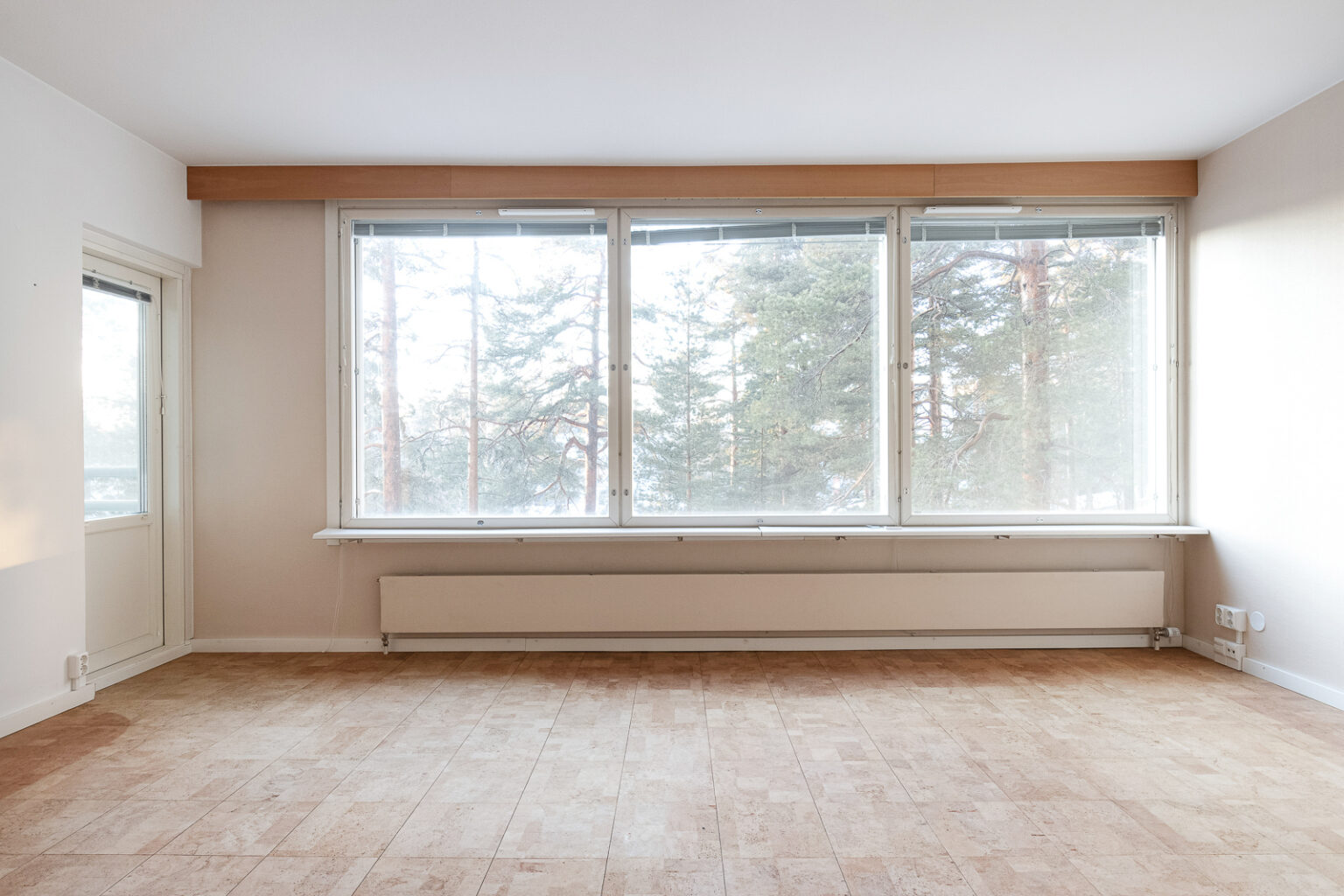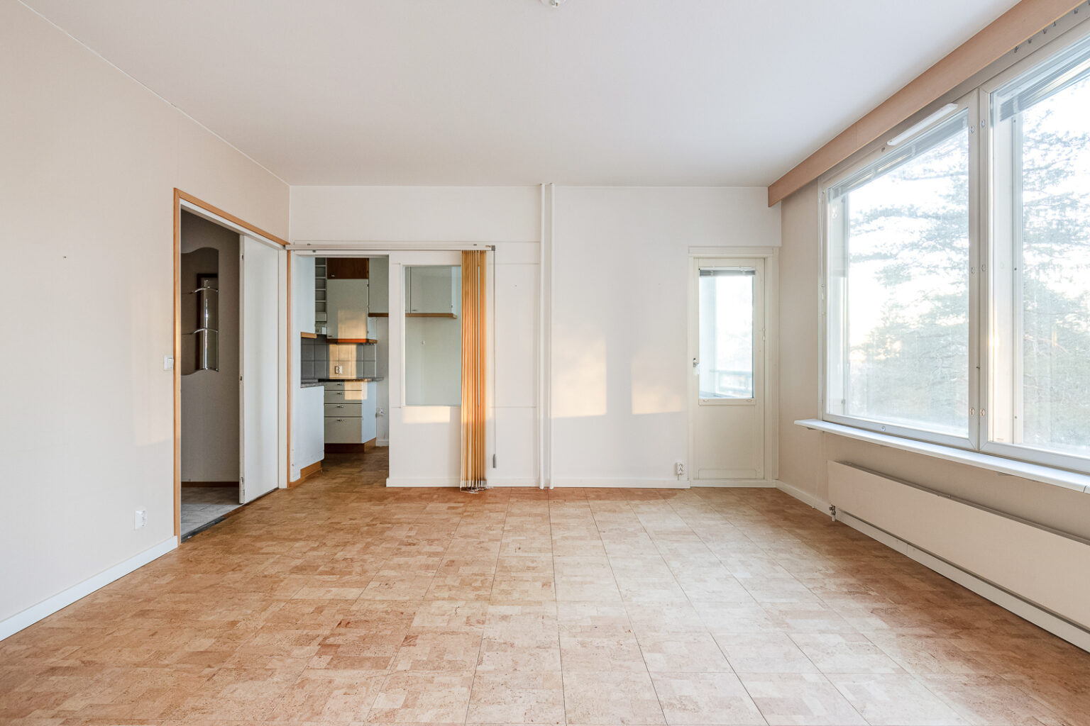 Keittiö ja kylpyhuone on remontoitu aiemmin, ja kokonaisuus on siistikuntoinen ja hyvin toimiva. Olohuoneen isot ikkunat tekevät tilasta poikkeuksellisen valoisan. Makuuhuoneessa on reilusti säilytystilaa kaapistollisen seinän ansiosta.