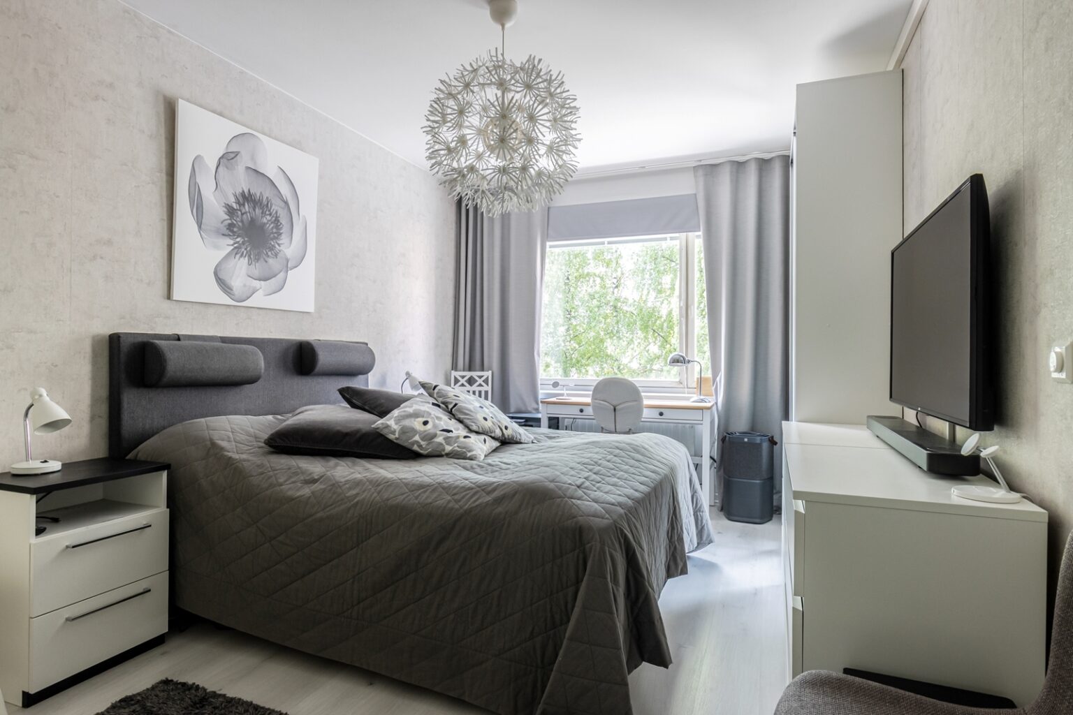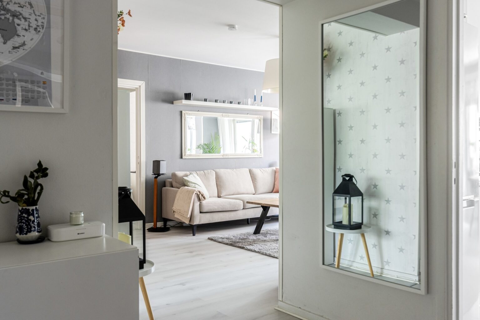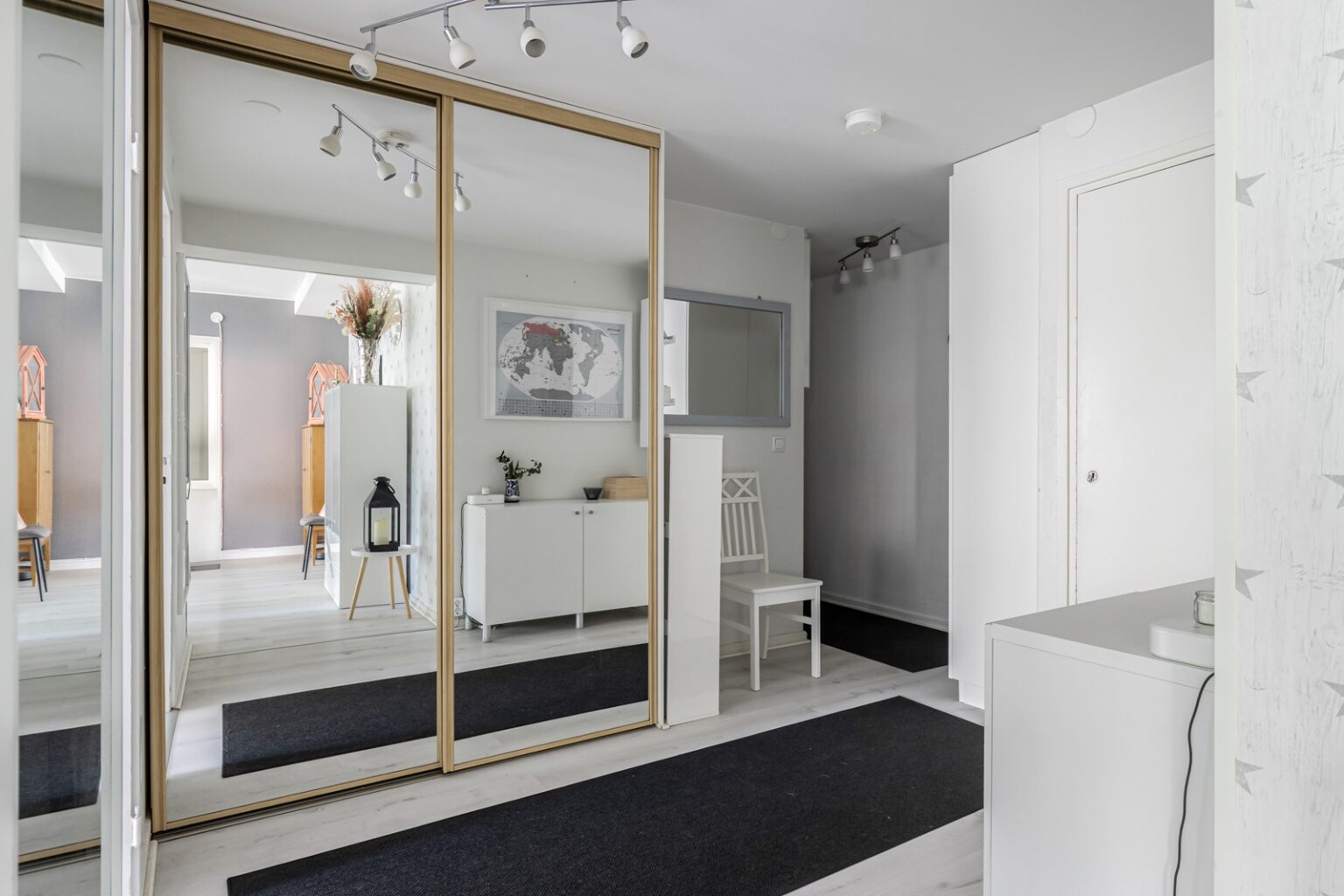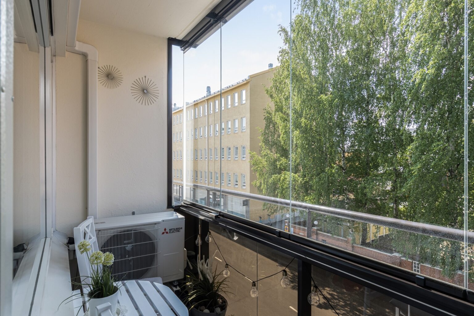 Kolmannen kerroksen asunnossa on hyvin tilaa, sillä neliöitä on kaksioksi runsaasti (68,5 m2). Kiva lasitettu parveke ja kesällä viilennyksen avuksi on ilmalämpöpumppu.