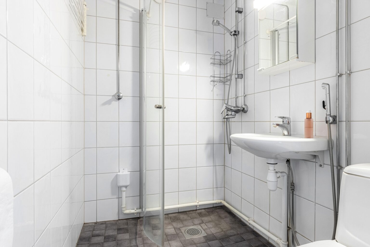 Kylpyhuone on uusittu ja siellä on hyvin tilaa myös pyykinpesukoneelle, mikä tuo arkeen sujuvuutta ja mukavuutta.