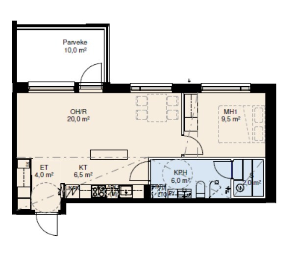 – toimivapohjaisia kaksioita sekä ylimmän kerroksen 74 m²:n kolmio.