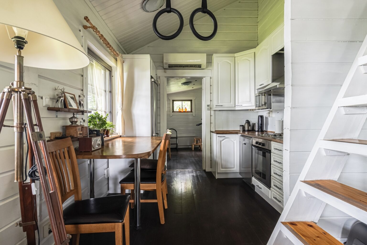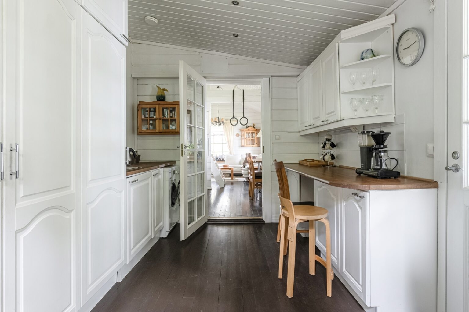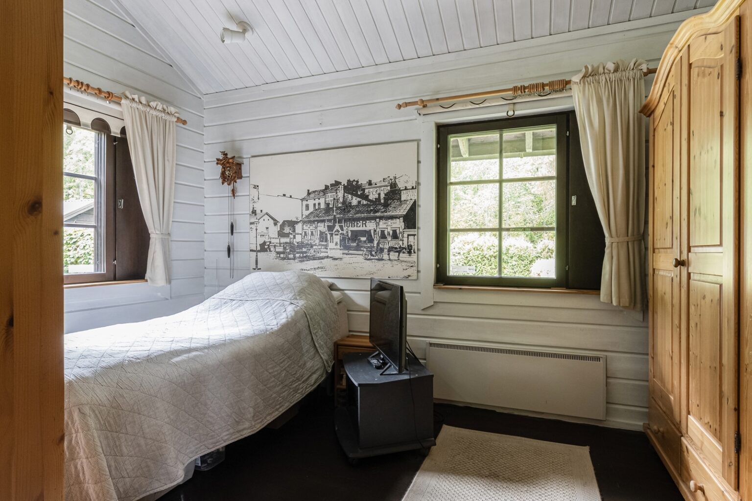 Hirsirakenteinen päärakennus, jossa on 2 makuuhuonetta, olohuone ja ruokailutila, keittiö ja apukeittiö, sauna/pesuhuonetilat, wc ja noin 23 m2:n yläkerta/parvi. Olohuoneessa on tunnelmallinen varaava takka ja leivinuuni ja lisäksi on ilmalämpöpumppu. Saunassa on puukiuas.