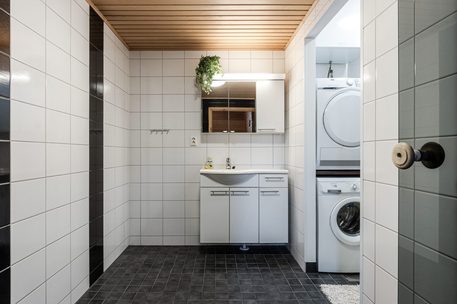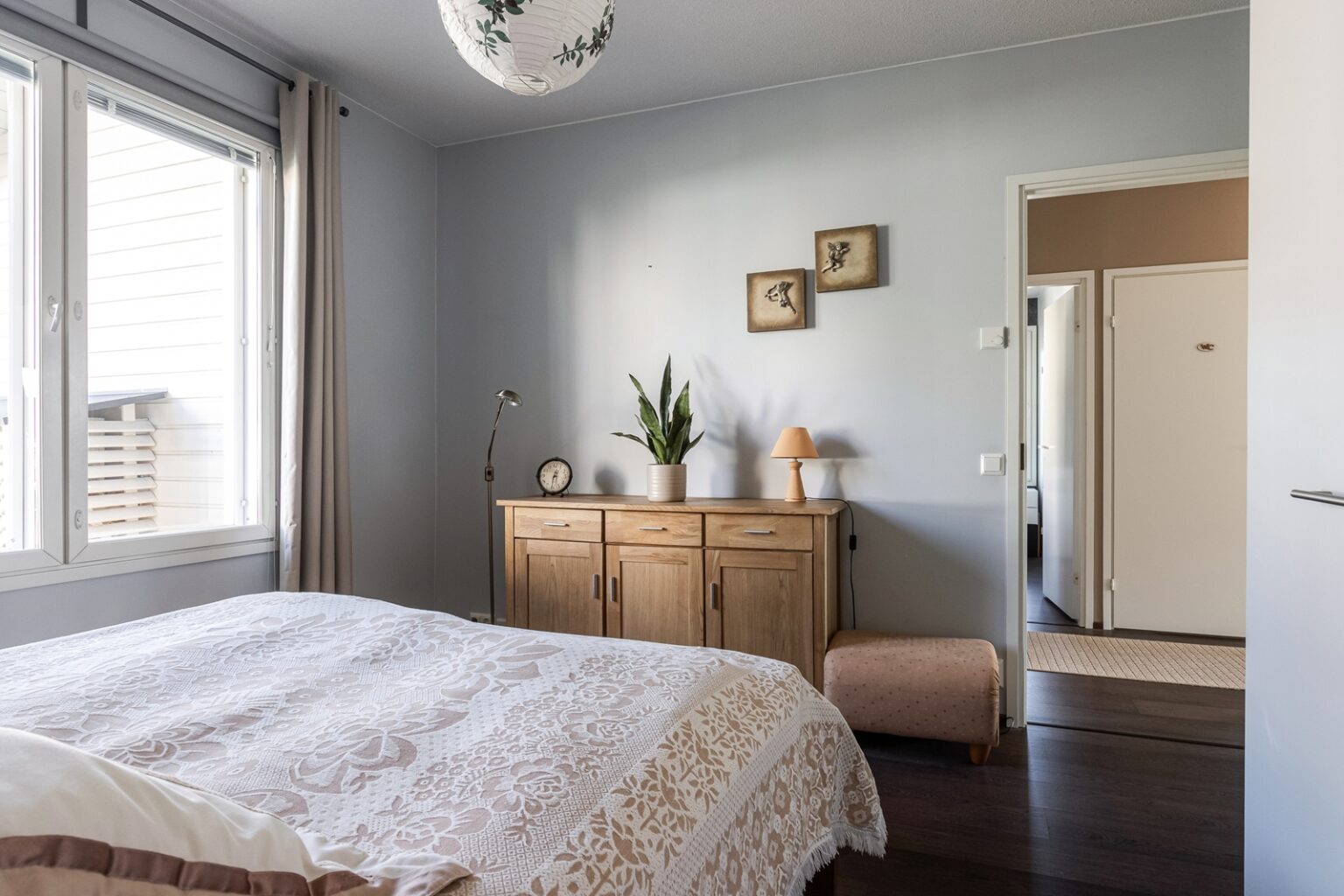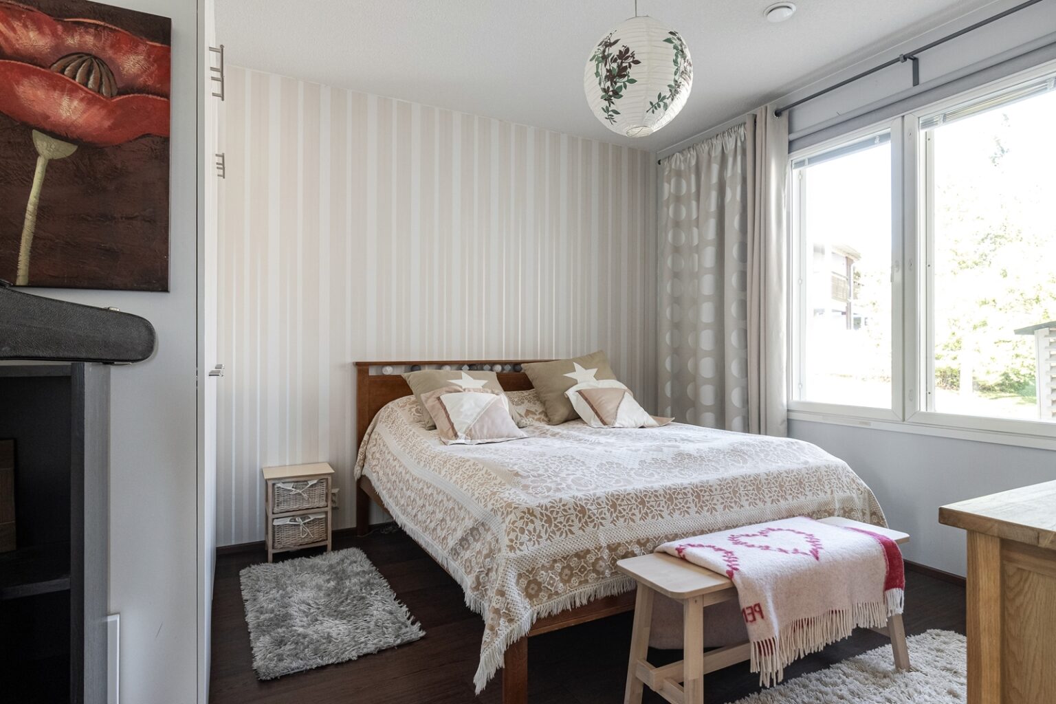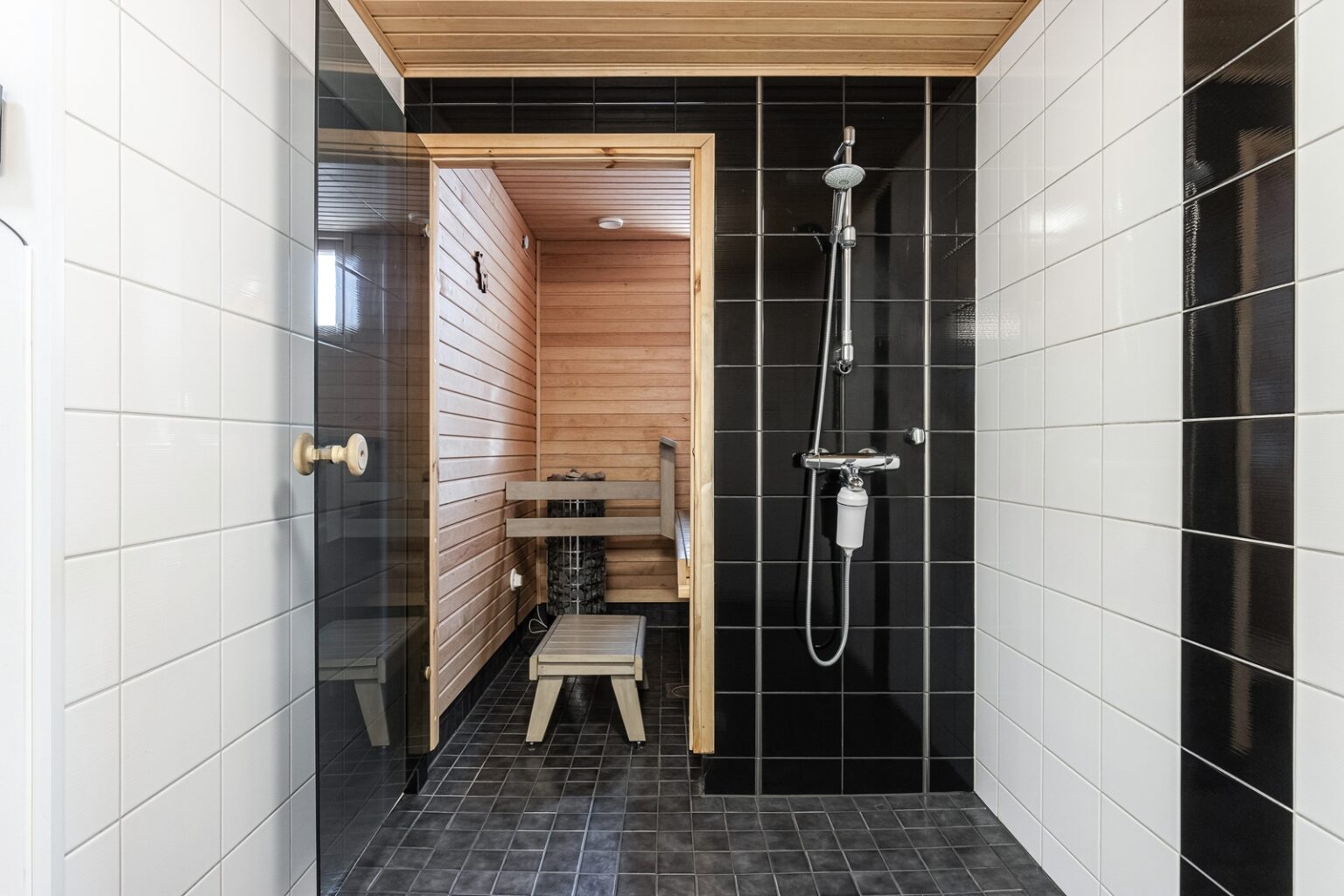 Huoneistossa on kaksi hyvän kokoista makuuhuonetta, joista toisessa on oma vaatehuone. Lisäksi kodissa on erillinen wc, kodinhoitotila, tilava pesuhuone sekä oma sauna. Asumisen helppoutta lisää 1-tasoisuus.