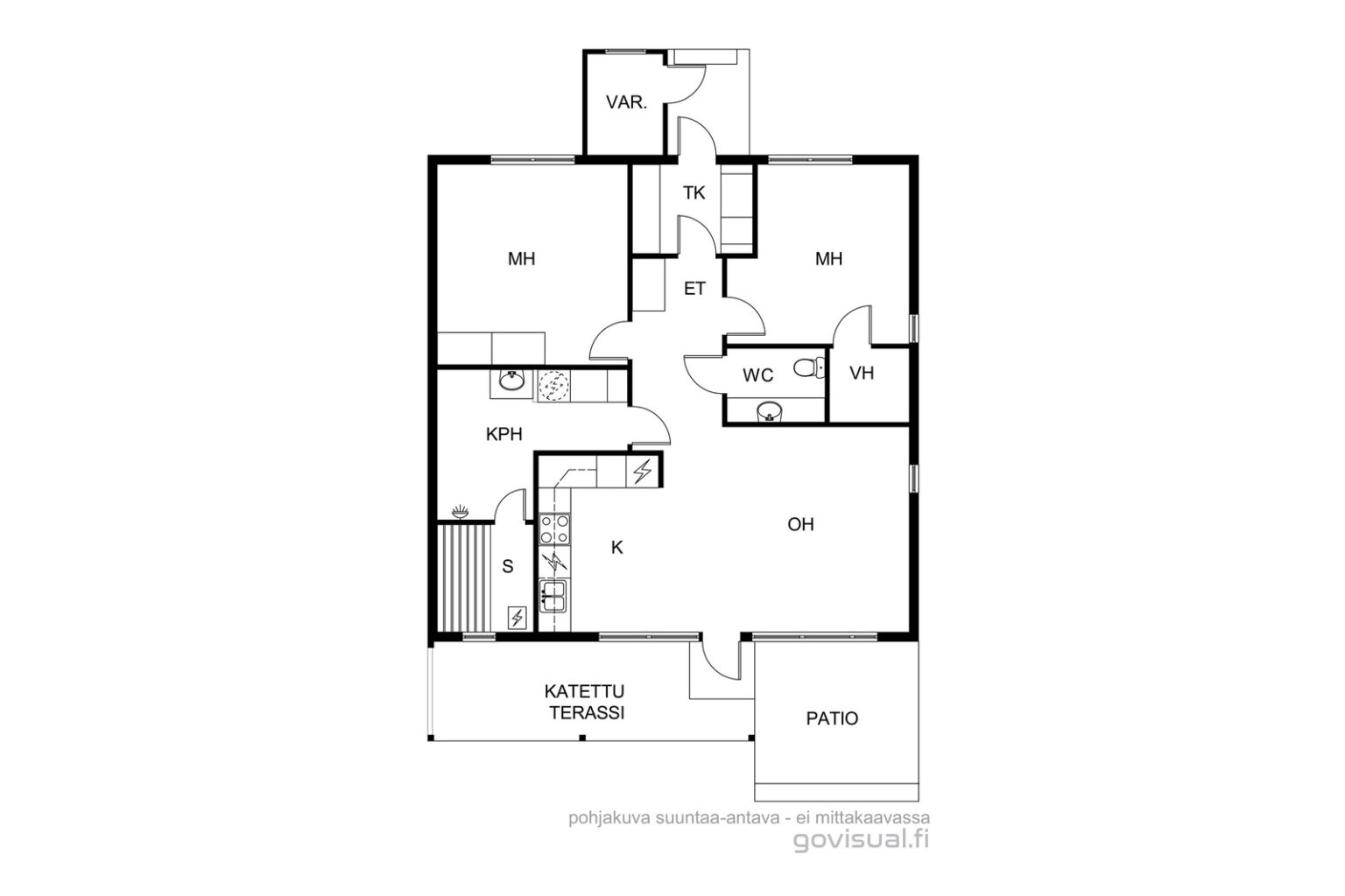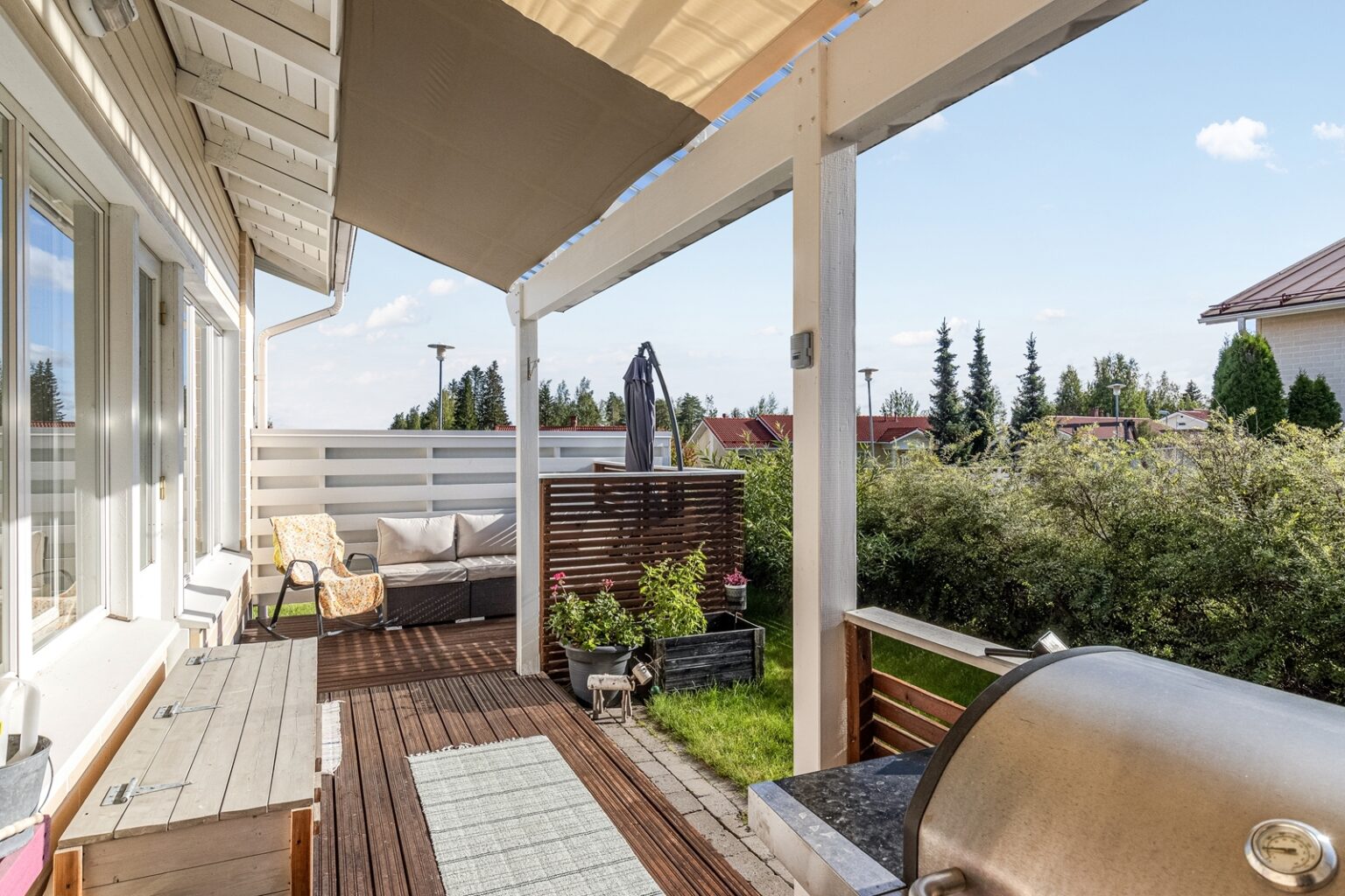 Olohuone ja keittiö muodostavat avaran yhtenäisen tilan, jota korotettu sisäkatto korostaa upeasti. Olohuoneesta on käynti katetulle terassille ja suojaisalle piha-alueelle täydellinen paikka rentoutua ja nauttia ulkoilmasta.