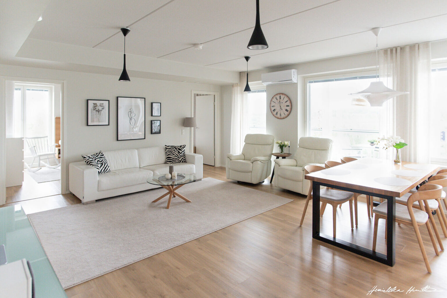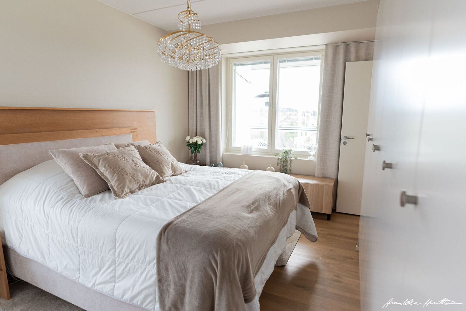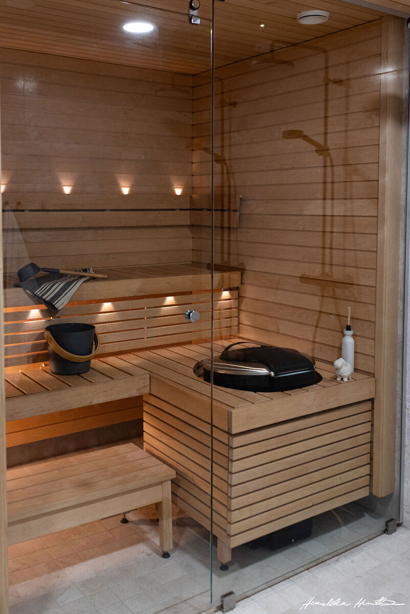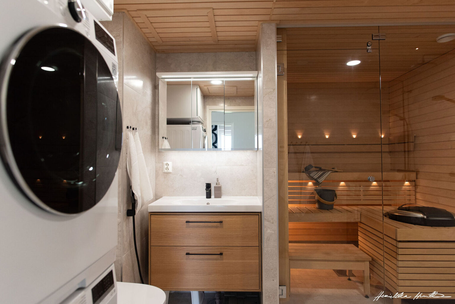 Oh + keittiö, + kaksi reilunkokoista mh: kahdesta pienemmästä makuuhuoneesta tehty rakennusvaiheessa iso mh, toinen vieras- /työhuone + vh, kph, wc. Viessmann ilmalämpöpumppu, integroidut Bosch-kodinkoneet; mikro, jk+pk+apk. Upeat kivitasot, jossa pistorasiat tason päälle asennettu, Alucobest-välitila, Gunmetal-hana keittiössä, muuten mustat Oraksen hanat / 2 suihkua. Mh:ssa Kashmir-kaapistot ja vetolaatikot liukukiskoilla. Kph: 800 mm allaslaatikosto, Harvia 6 kW Aina valmis -kiuas ja saunassa kuituvalot. Pukkilan Stone Age -laatat. Kaikissa huoneissa himmentimet + 3000 kelvinin valaistus kiinteissä valoissa. Työpisteessä LED-erillisvalaistus. Koko asunnon seinämaaleissa energisoiva ja rauhallinen sävy.