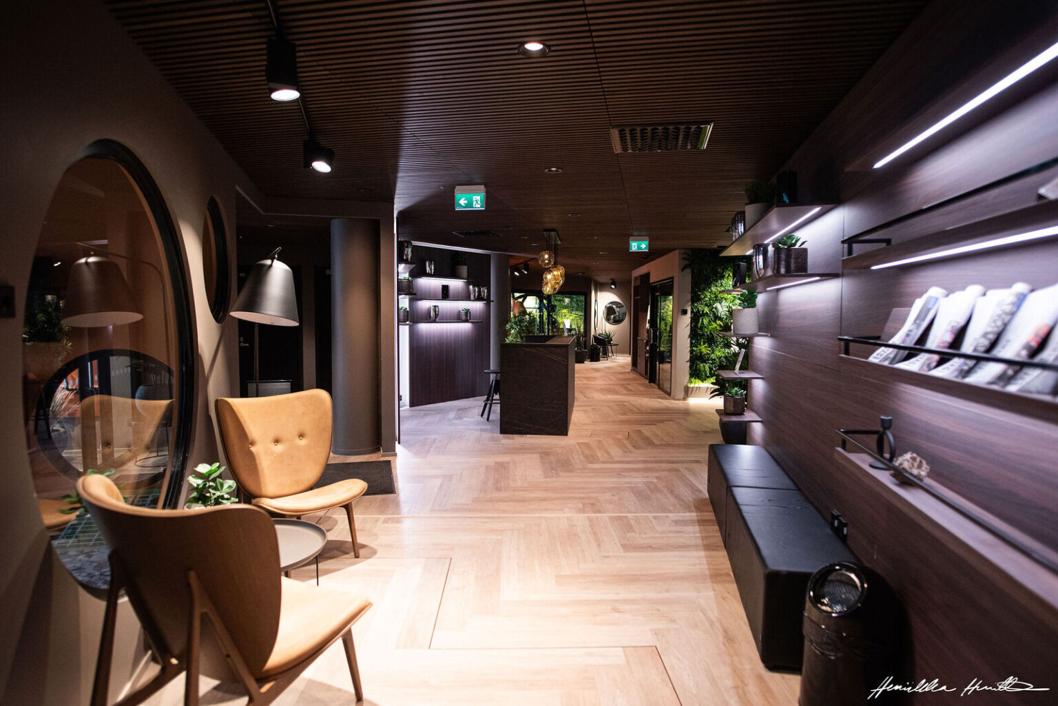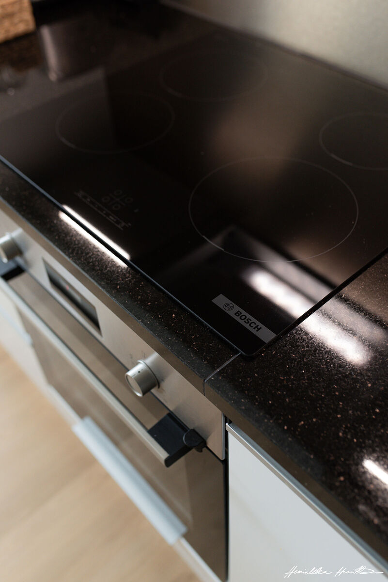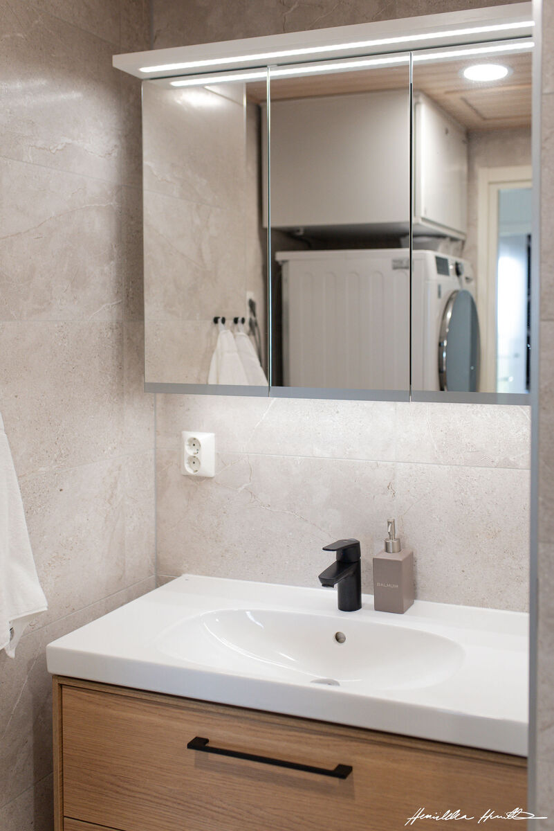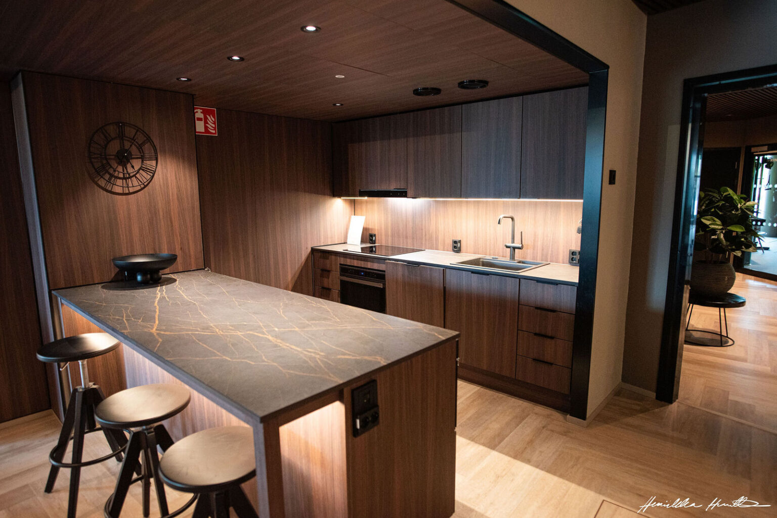 Oh + keittiö, + kaksi reilunkokoista mh: kahdesta pienemmästä makuuhuoneesta tehty rakennusvaiheessa iso mh, toinen vieras- /työhuone + vh, kph, wc. Viessmann ilmalämpöpumppu, integroidut Bosch-kodinkoneet; mikro, jk+pk+apk. Upeat kivitasot, jossa pistorasiat tason päälle asennettu, Alucobest-välitila, Gunmetal-hana keittiössä, muuten mustat Oraksen hanat / 2 suihkua. Mh:ssa Kashmir-kaapistot ja vetolaatikot liukukiskoilla. Kph: 800 mm allaslaatikosto, Harvia 6 kW Aina valmis -kiuas ja saunassa kuituvalot. Pukkilan Stone Age -laatat. Kaikissa huoneissa himmentimet + 3000 kelvinin valaistus kiinteissä valoissa. Työpisteessä LED-erillisvalaistus. Koko asunnon seinämaaleissa energisoiva ja rauhallinen sävy.