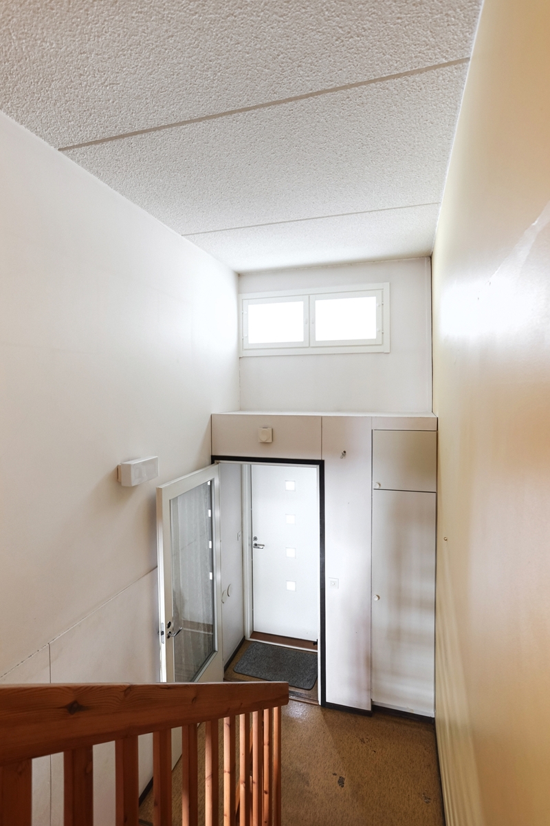 Yläkerrassa on pesuhuoneen ja saunan lisäksi kaksi makuuhuonetta, joista toisesta on käynti parvekkeelle. Alakerrassa on keittiö ja olohuone. Olohuoneesta on käynti aidatulle takapihalle.