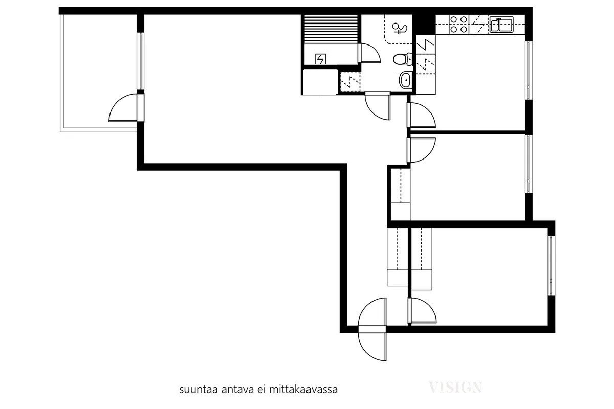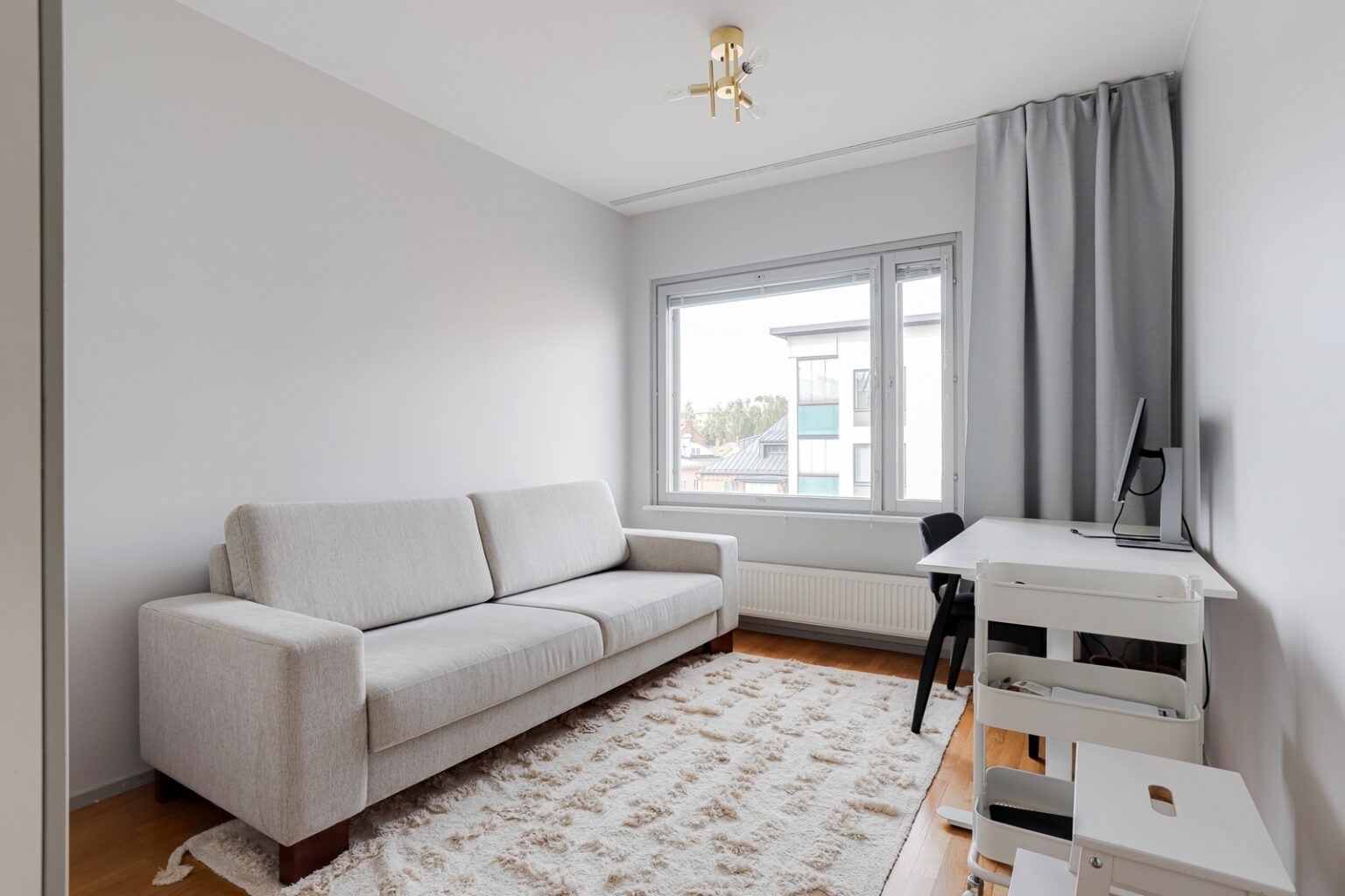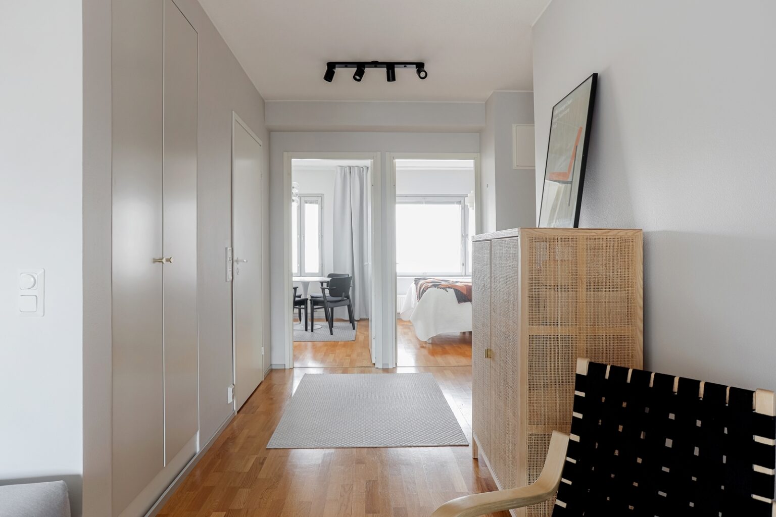 Kaksi makuuhuonetta ovat kaupungin puolella ja olohuone on sisäpihan puolelle. Olohuone on tilava, ja sinne mahtuu tarvittaessa toinen ruokailuryhmä. Olohuoneesta on käynti lasitetulle parvekkeelle. Huoneistossa on myös tyylikkäät uusitut sauna- ja pesuhuonetilat.
