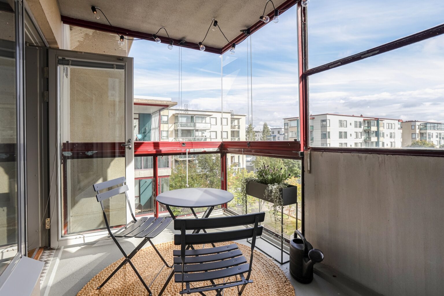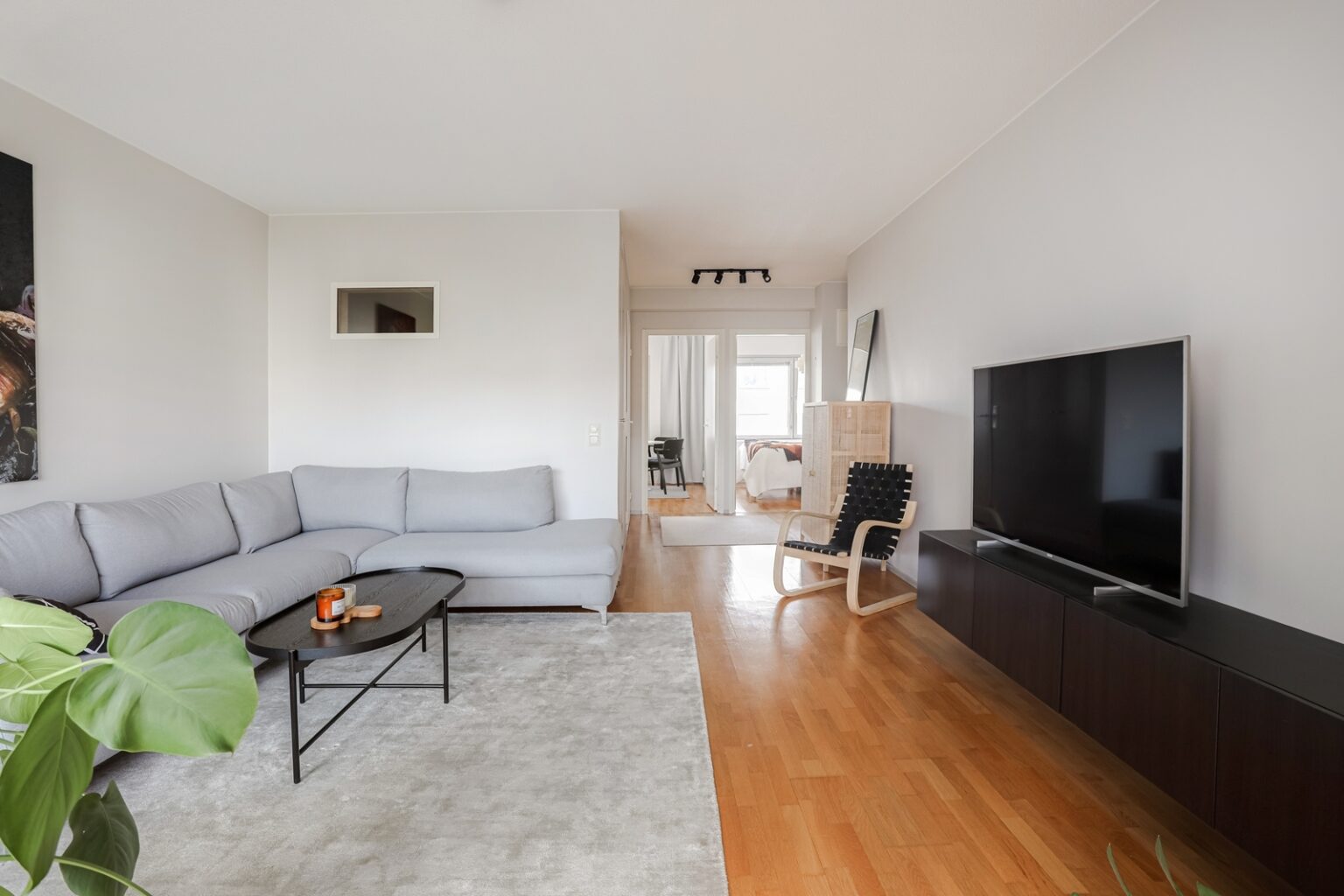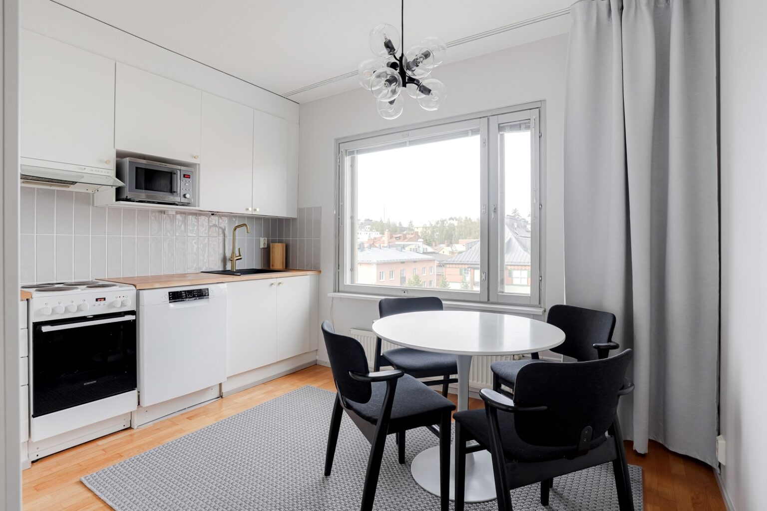 Kaksi makuuhuonetta ovat kaupungin puolella ja olohuone on sisäpihan puolelle. Olohuone on tilava, ja sinne mahtuu tarvittaessa toinen ruokailuryhmä. Olohuoneesta on käynti lasitetulle parvekkeelle. Huoneistossa on myös tyylikkäät uusitut sauna- ja pesuhuonetilat.