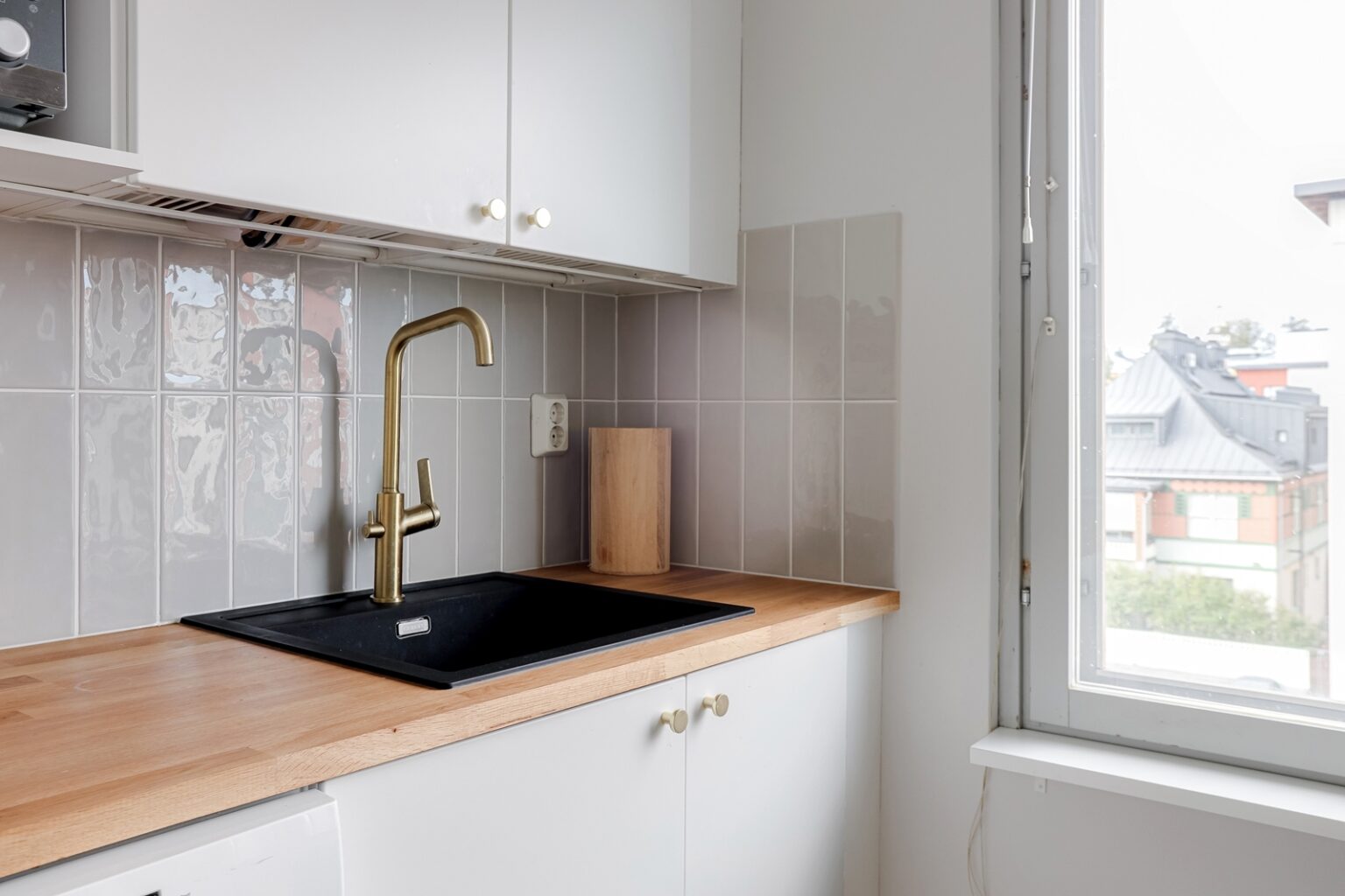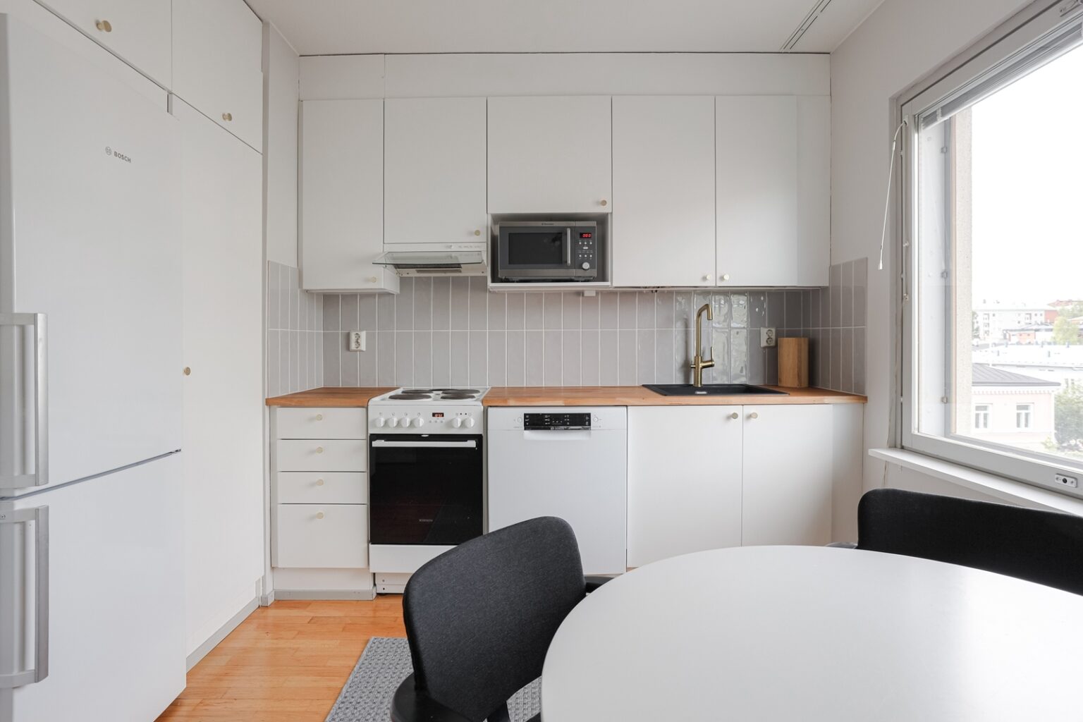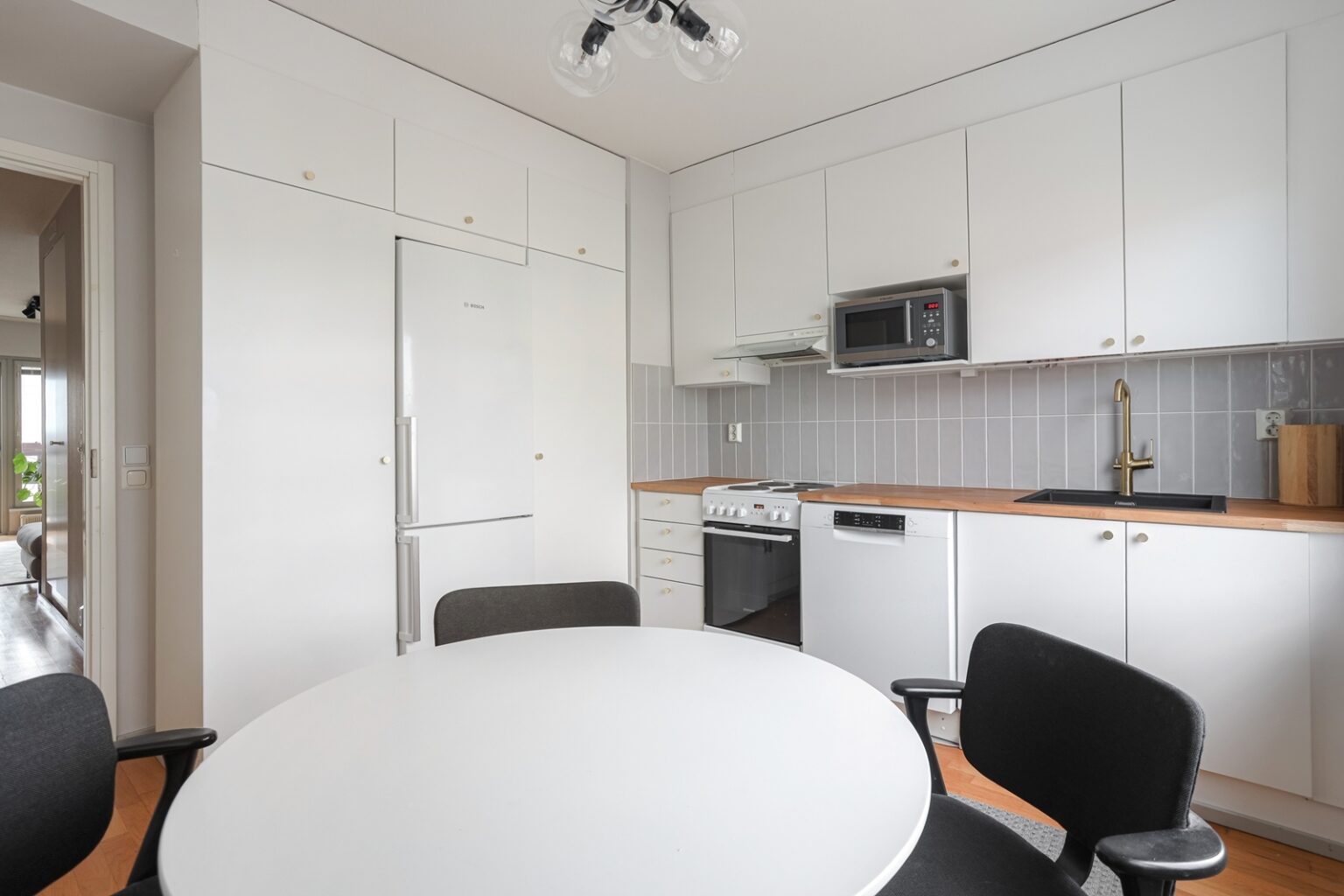 Huoneistossa on hyvänkokoinen erillinen keittiö. Keittiötä on päivitetty. Kaapistojen ovet, pöytätasot, taustalaatoitus on uusittu. Keittiössä on myös aamiaiskaappi.