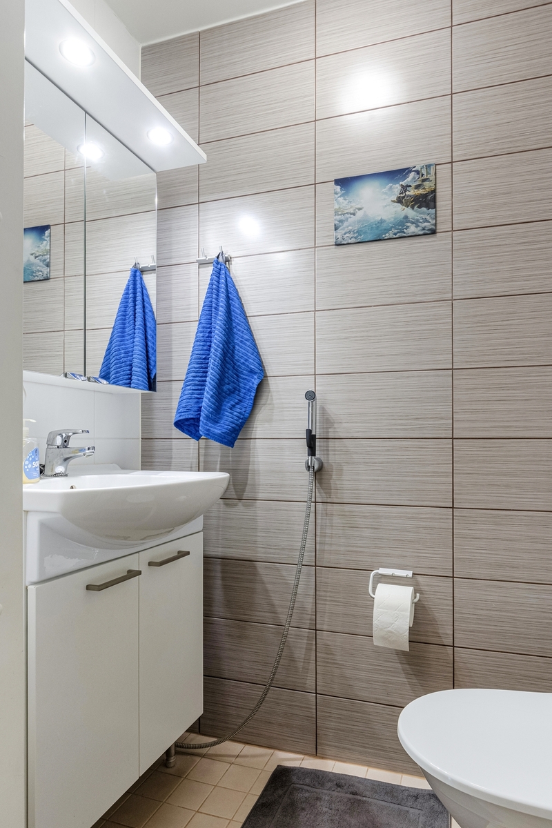 Hyvä tilankäyttö, tilava oh ja ruokailutila. Kph:ssa on toinen wc ja lisäksi huoneistossa on erillinen wc-tila. Vaatehuonekin löytyy. Tilava lasitettu parveke rantamaisemalla avautuu etelään ja länteen. Autolle myydään sähköauton latausasemalla (11 kW) varustettu katospaikka hintaan 7 000 euroa ja erillinen lämmin varasto hp. 2 500 euroa.