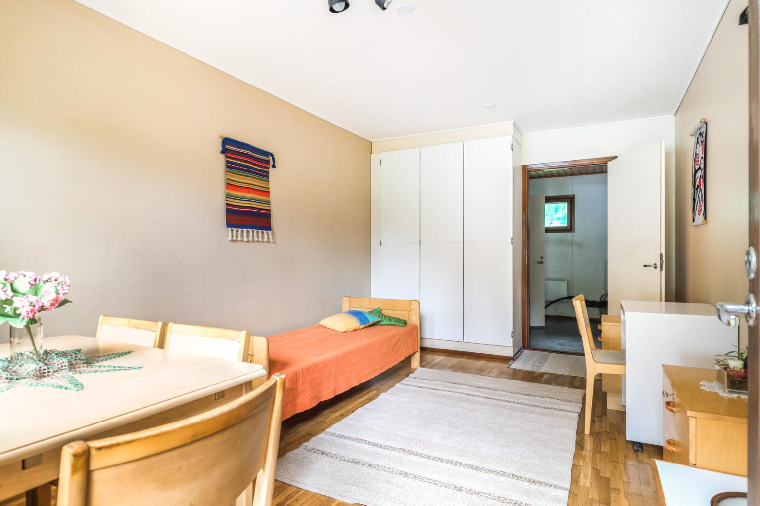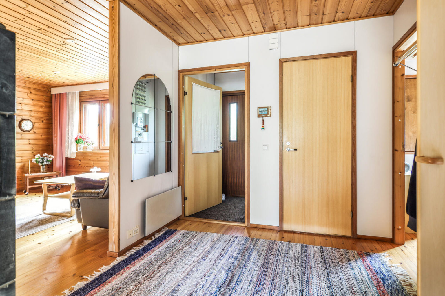 Asuintilat ovat yhdessä tasossa, lämmönlähteenä on Tulikiven leivinuuni ja sähköpatterit, kylpyhuoneessa on lattialämmitys. Kaksi makuuhuonetta, olohuone, keittiö, kodinhoitohuonetila sekä sauna/pesuhuonetilat. Talon toisessa päädyssä on työhuone omalla sisäänkäynnillä ja lisäksi varastotilaa.
