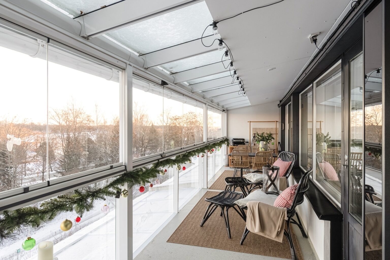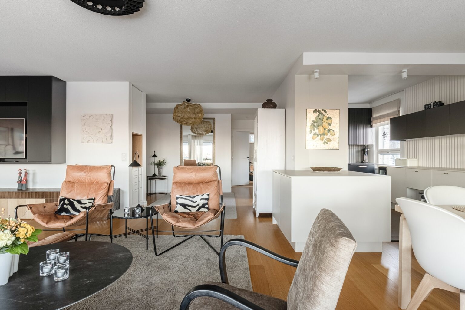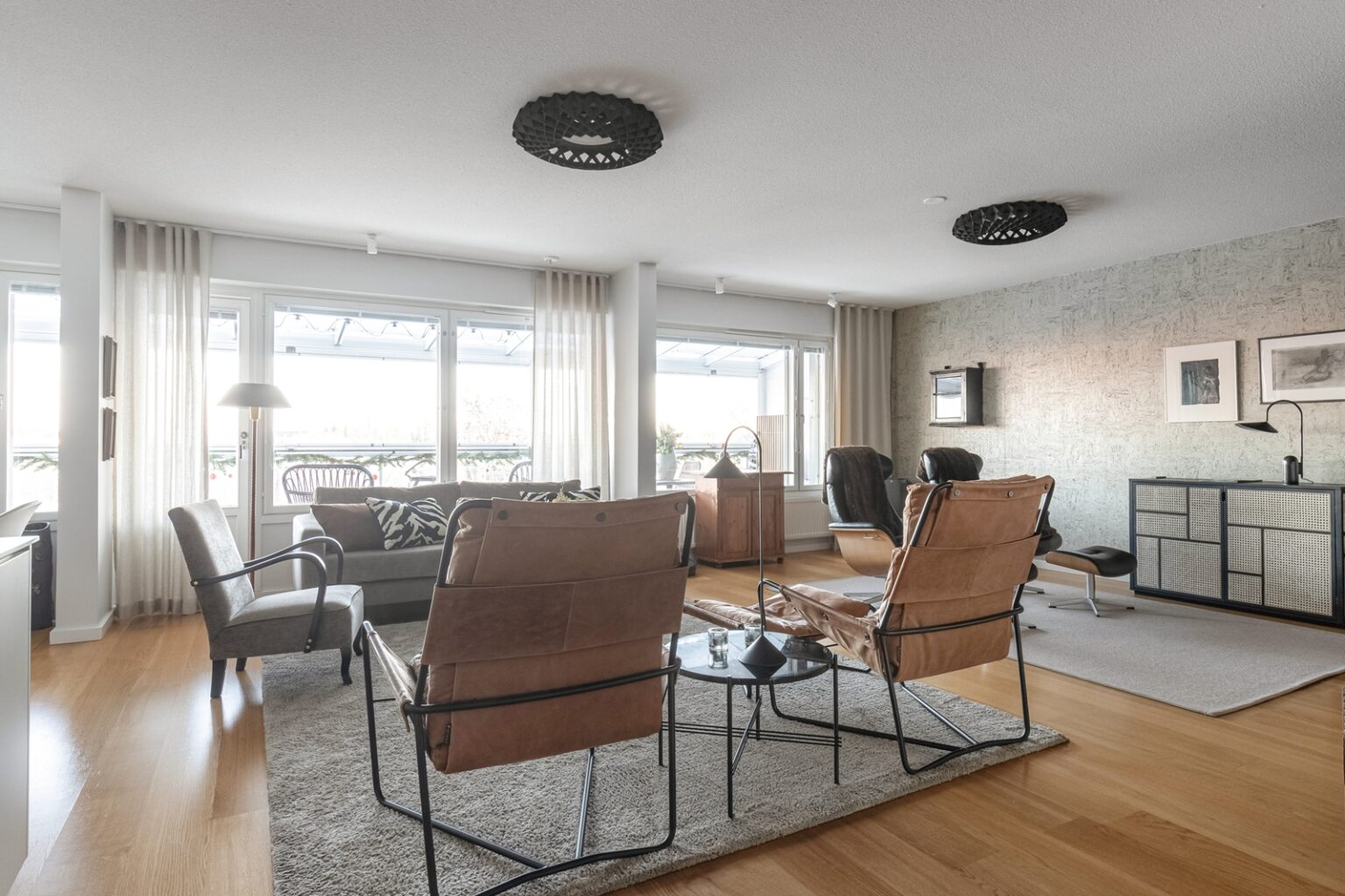 Huoneisto hurmaa avaruudellaan ja valoisuudellaan. Upea, tilava olohuone muodostaa kodin sydämen, ja huoneiston levyinen lasitettu terassiparveke avautuu kaupungin ylle tarjoten vaikuttavat näkymät aina ilta-aikaan saakka kaupunkisilhuetti on kerrassaan lumoava.