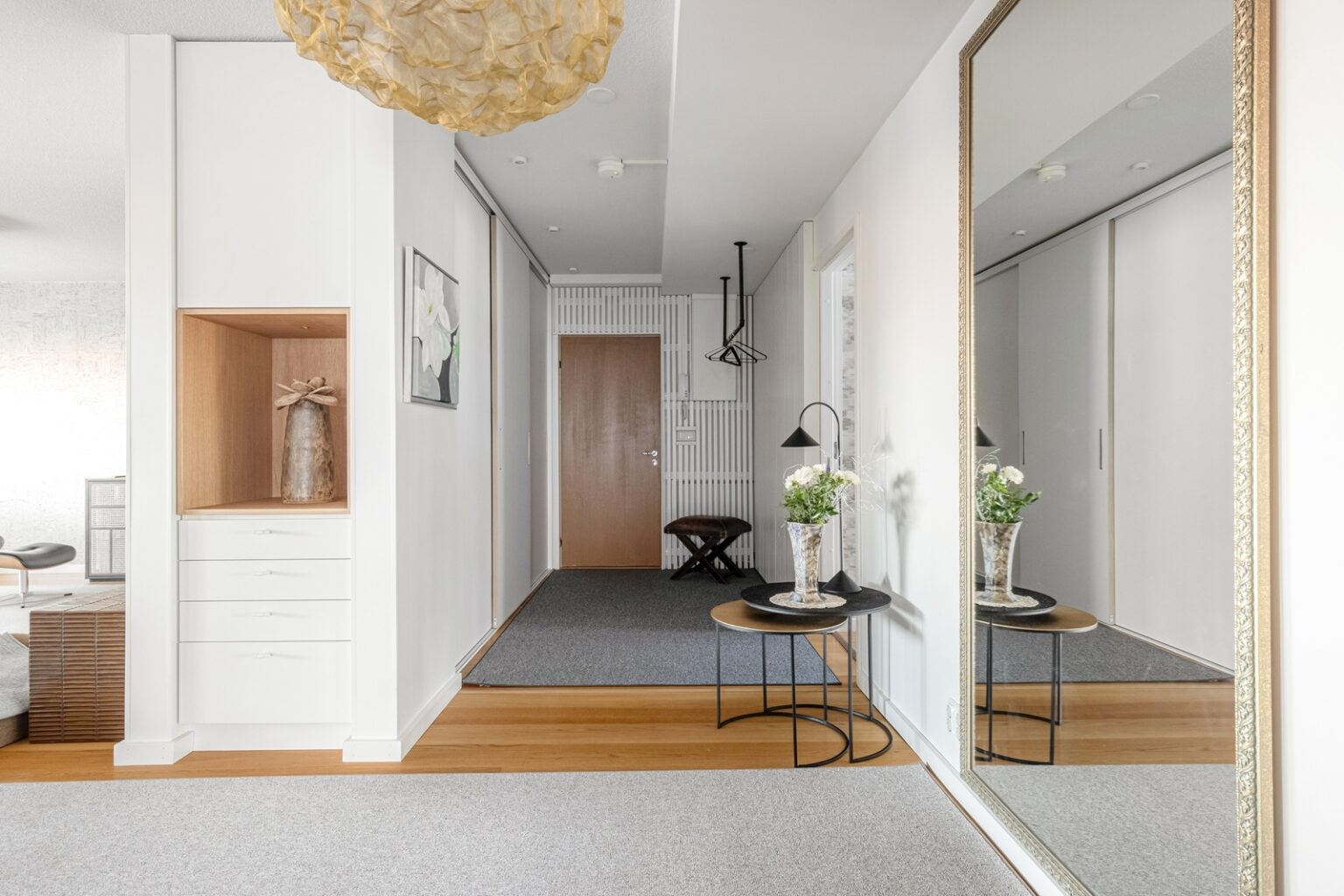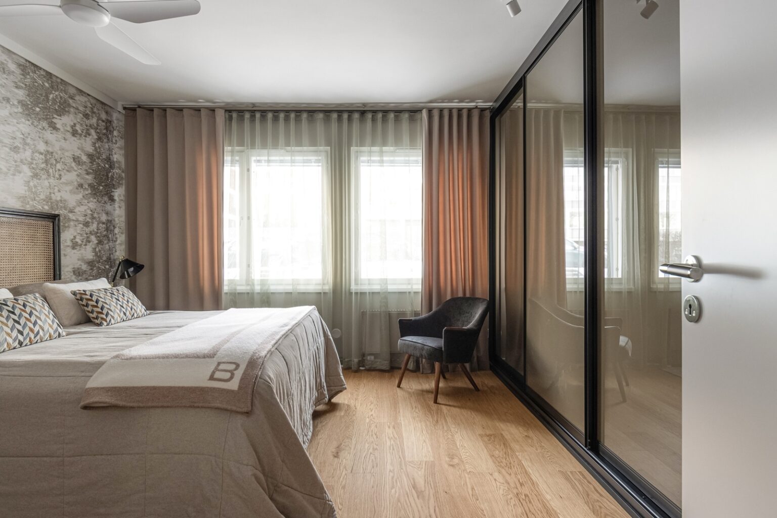 Tällä hetkellä huoneistossa on kaksi makuuhuonetta, mutta tilaratkaisuja on mahdollista muokata omien tarpeiden mukaan. Säilytystiloja on poikkeuksellisen hyvin, sillä käytössä on kaksi vaatehuonetta.