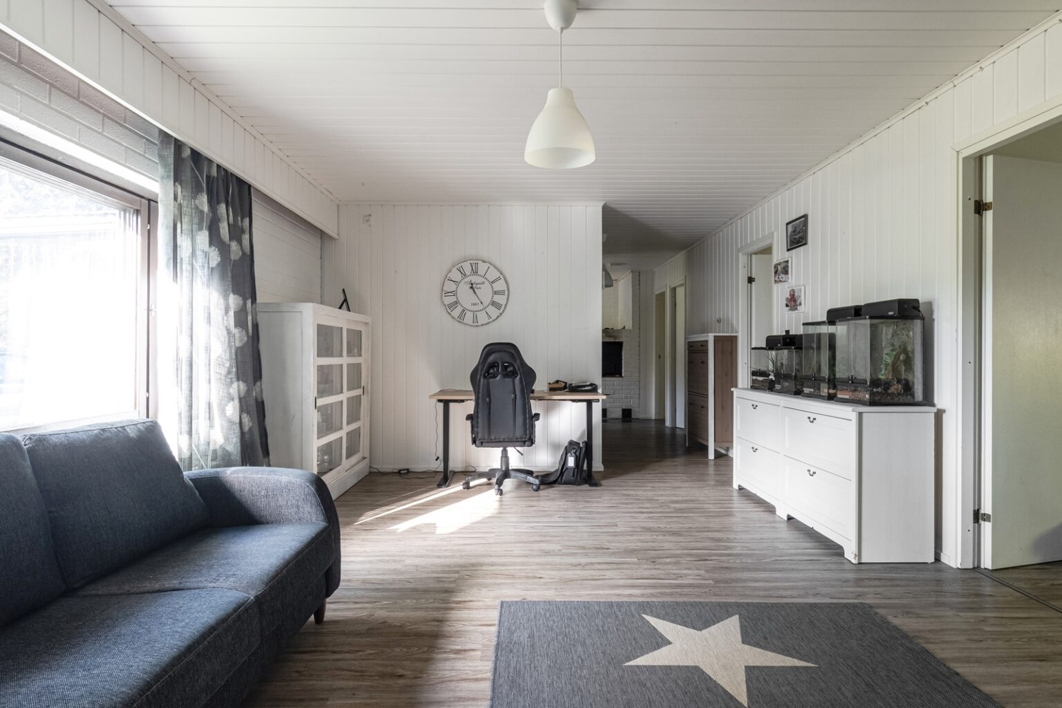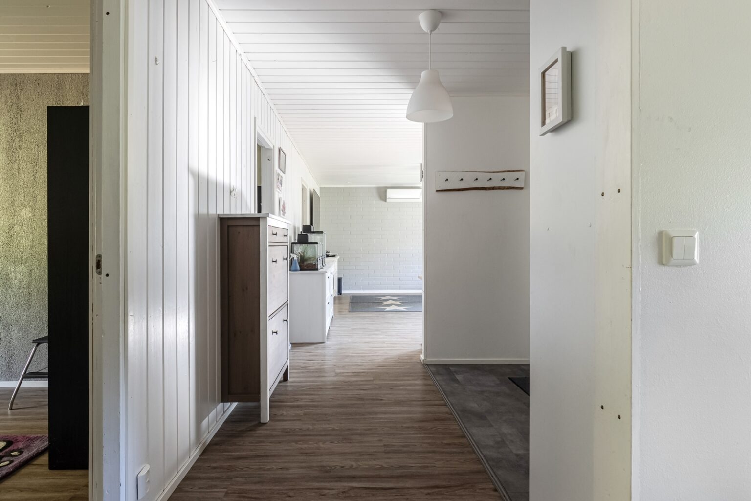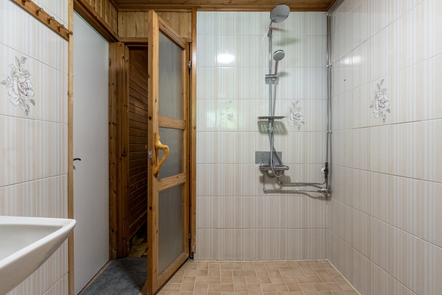 Asuminen on yhdessä tasossa: kolme makuuhuonetta, olohuone, kodikas keittiö, jossa tunnelmaa tuovat leivinuuni ja puuhella. Tilava kodinhoitohuone tarjoaa arjen sujuvuutta ja siitä on käynti suoraan ulos. Saunaosastolla viihtyy perinteisen puukiukaan lämmössä, ja pesuhuone on hyvänkokoinen.