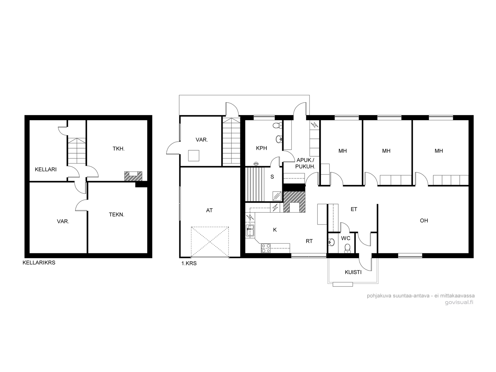 Alakerrasta löytyy runsaasti harrastetilaa, takkahuone, tekninen tila sekä varastotilaa. Talon päädyssä on lisäksi autotalli.