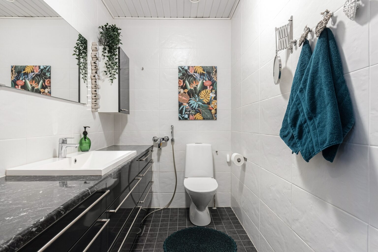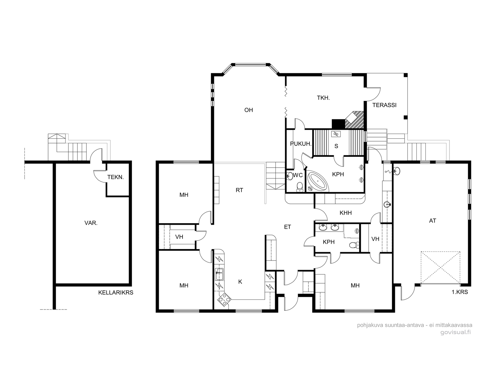 Arjen sujuvuutta lisää erinomainen kodinhoitohuone, josta on käynti suoraan ulos. Kylpyhuone- ja saunatilat sekä kaksi wc:tä palvelevat hyvin isommankin perheen tarpeita.