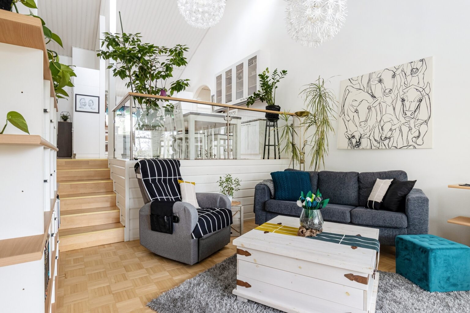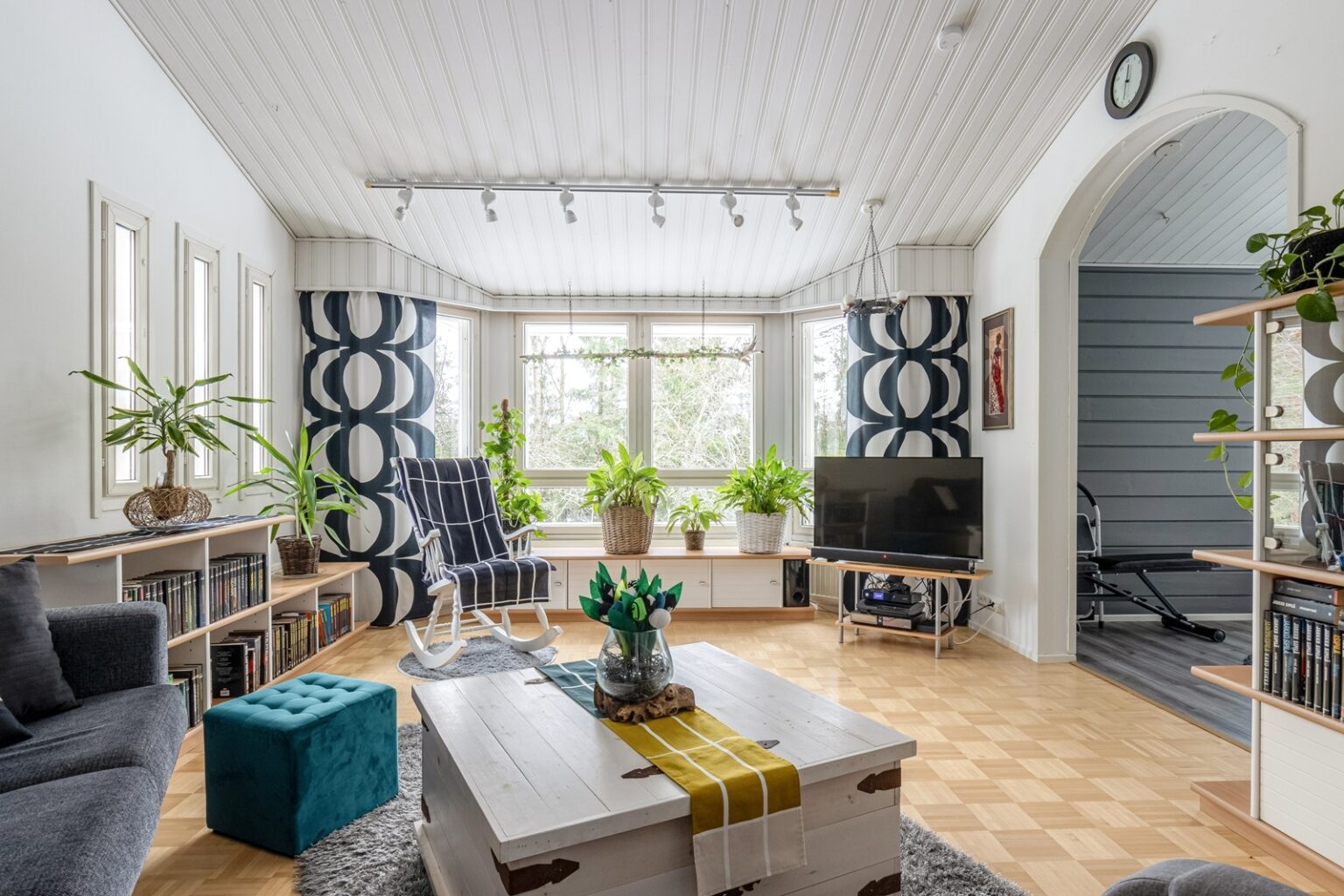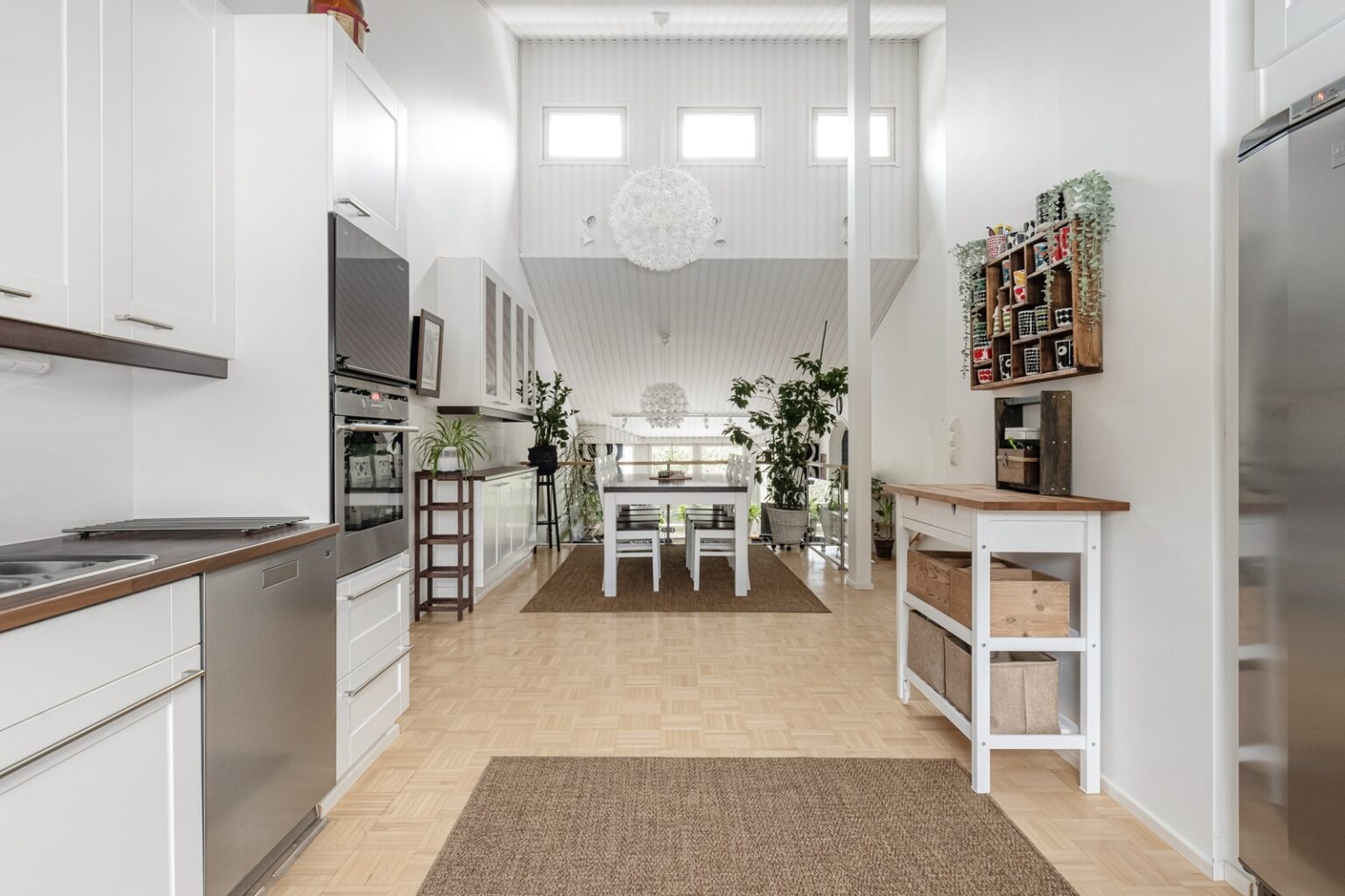 Tilava ja valoisa pohjaratkaisu koostuu kolmesta makuuhuoneesta, avarasta olohuoneesta, erillisestä ruokailutilasta sekä tunnelmallisesta takkahuoneesta. Korkea huonetila tuo kotiin ilmavuutta ja persoonallista ilmettä. Säilytystilaa on runsaasti, sillä käytössä on kaksi vaatehuonetta sekä erillinen varasto/harrastetila.