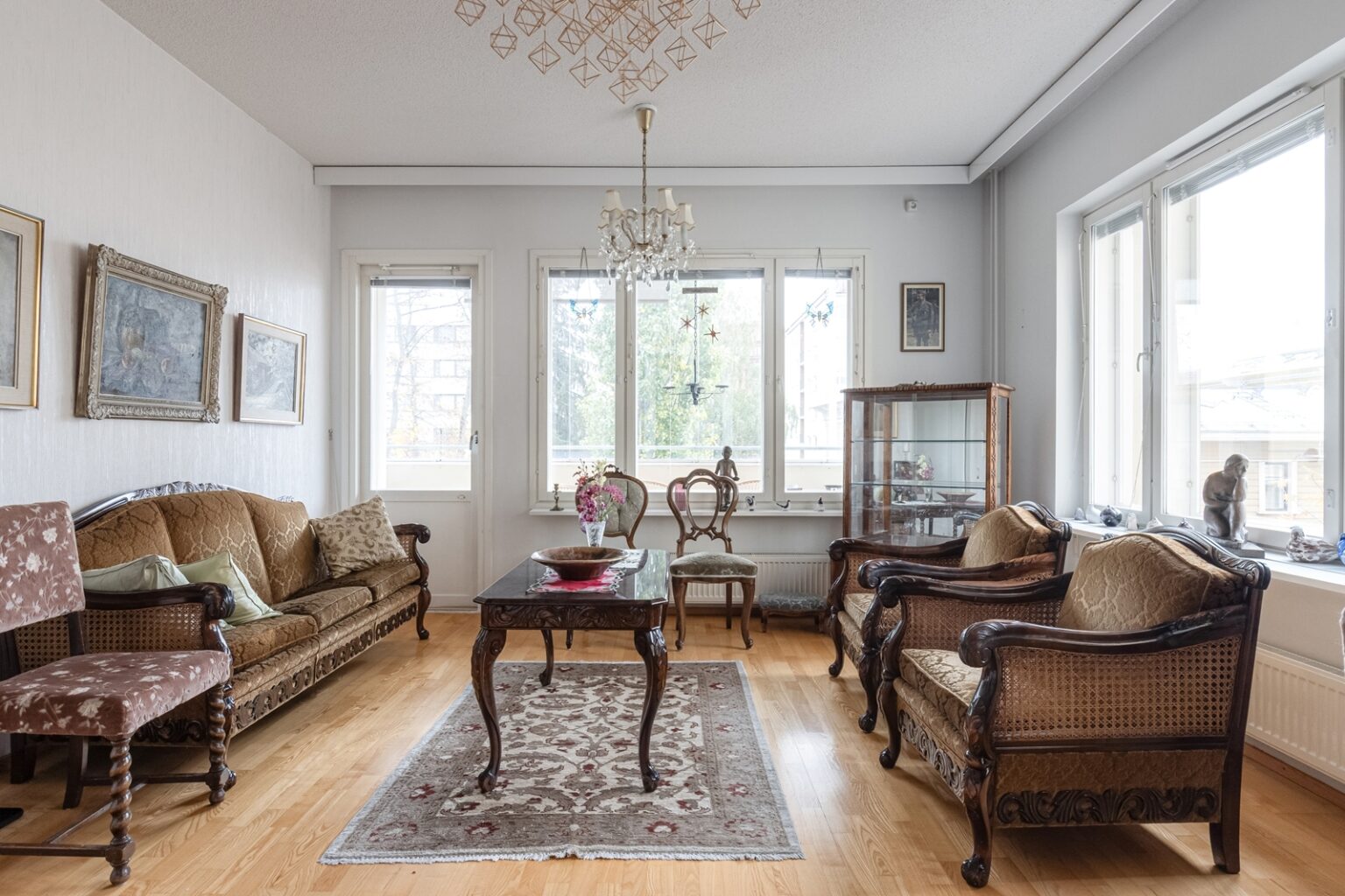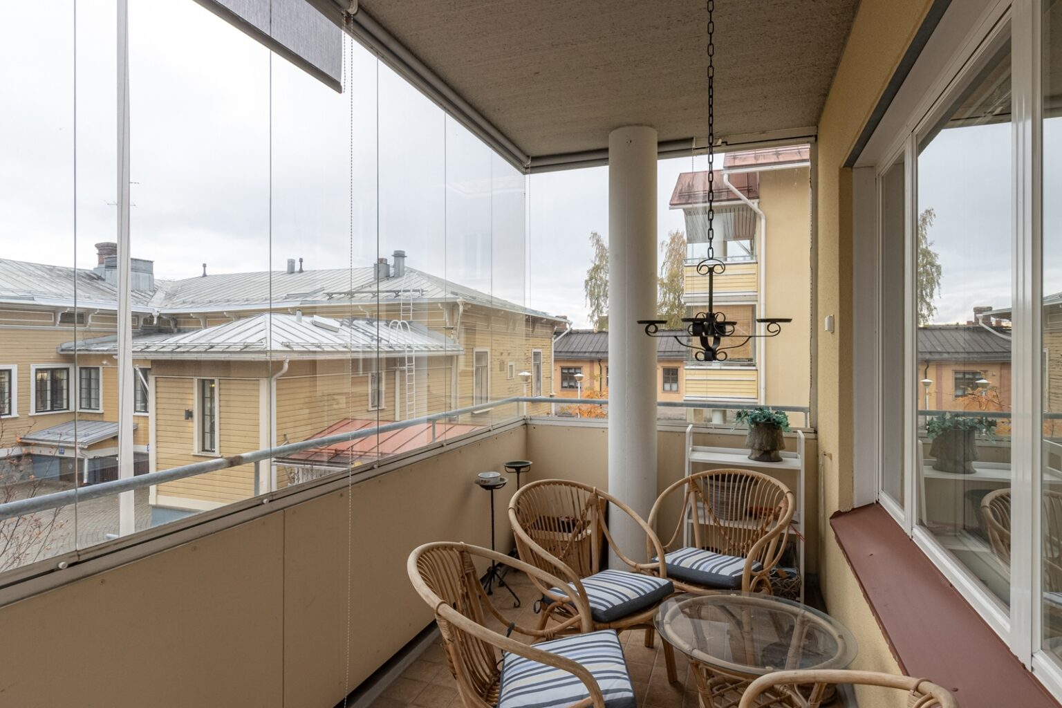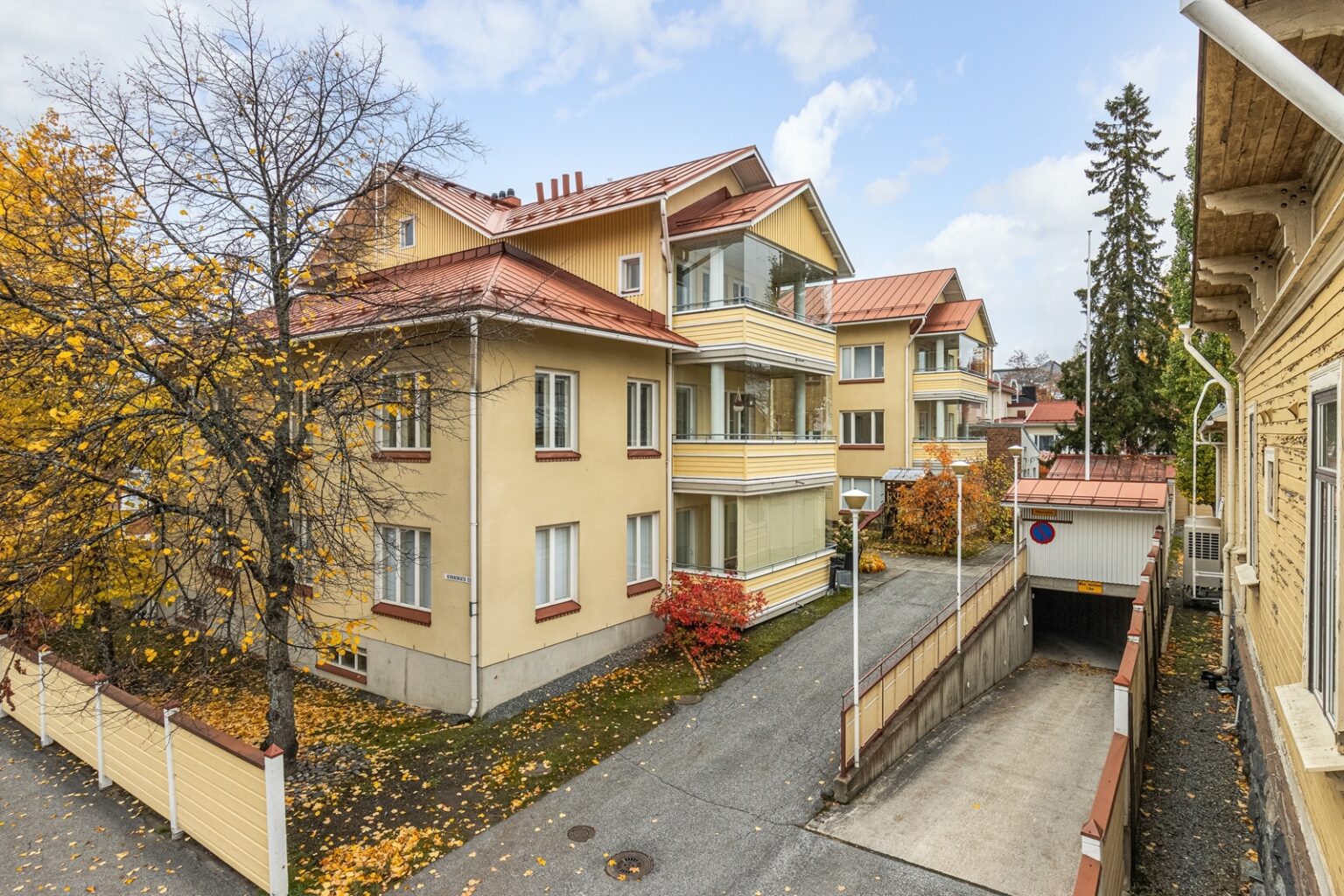 Kodin ikkunoista ja lasitetulta parvekkeelta on kivat näkymät esim. Kuopion Klubin pihalle. Asunnossa on kolme makuuhuonetta, keittiö, olohuone, kylpyhuone, sauna ja kaksi WC:tä (toinen kylpyhuoneen yhteydessä).