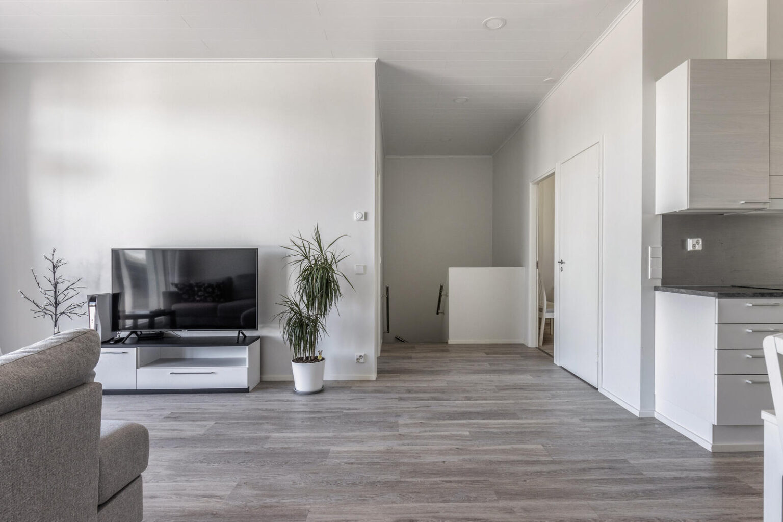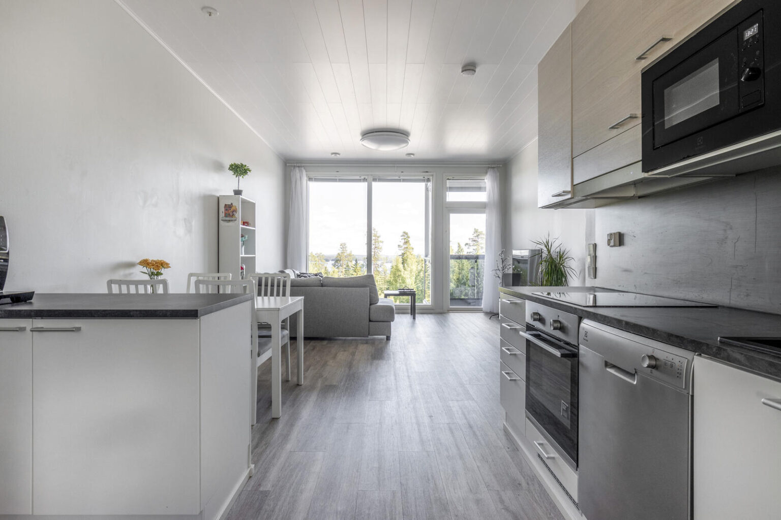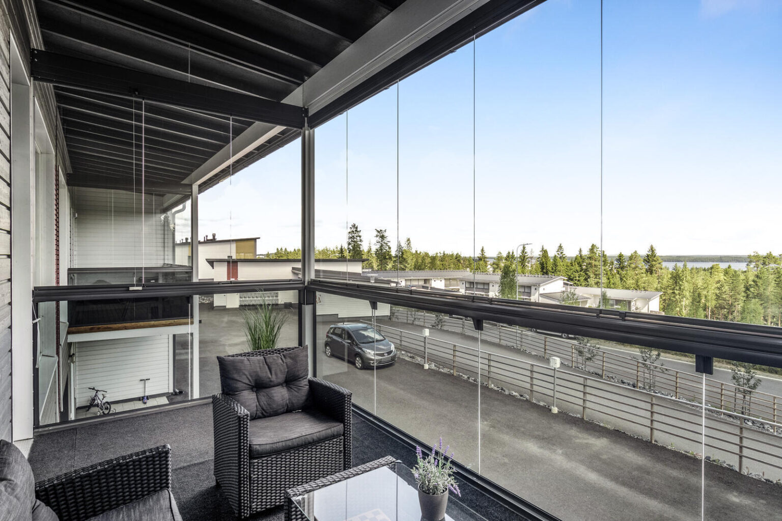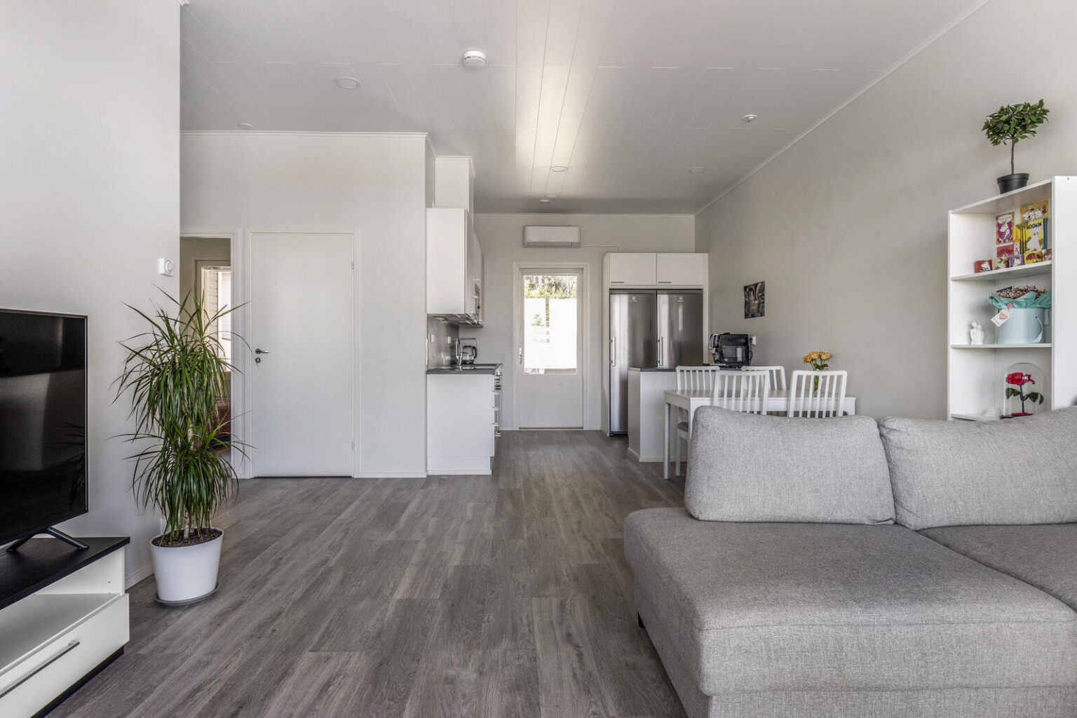 Avara olohuone ja keittiö muodostavat hyvän kokonaisuuden. Olohuoneesta on käynti lasitetulle parvekkeelle ja keittiöstä on kulku lasitetulle terassille ja piha-alueelle.