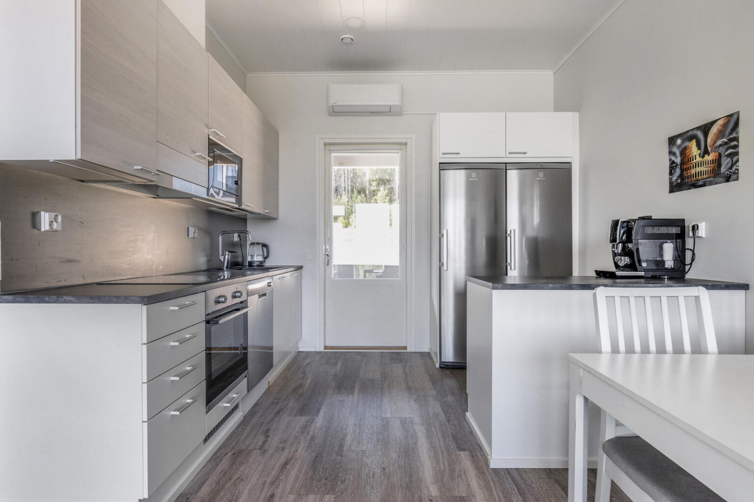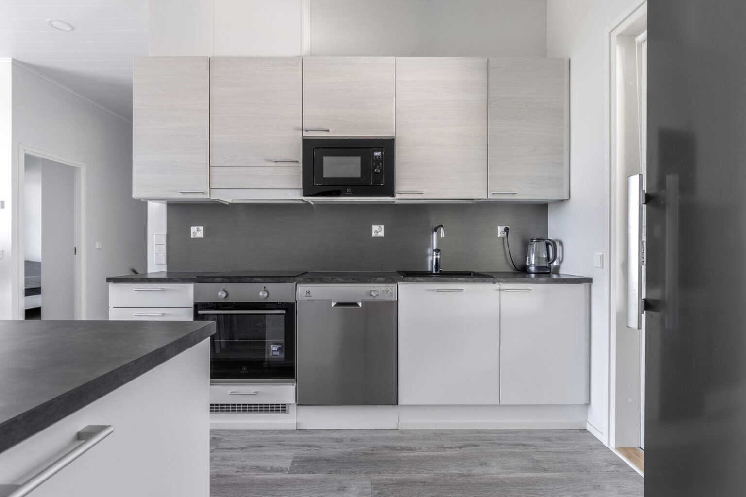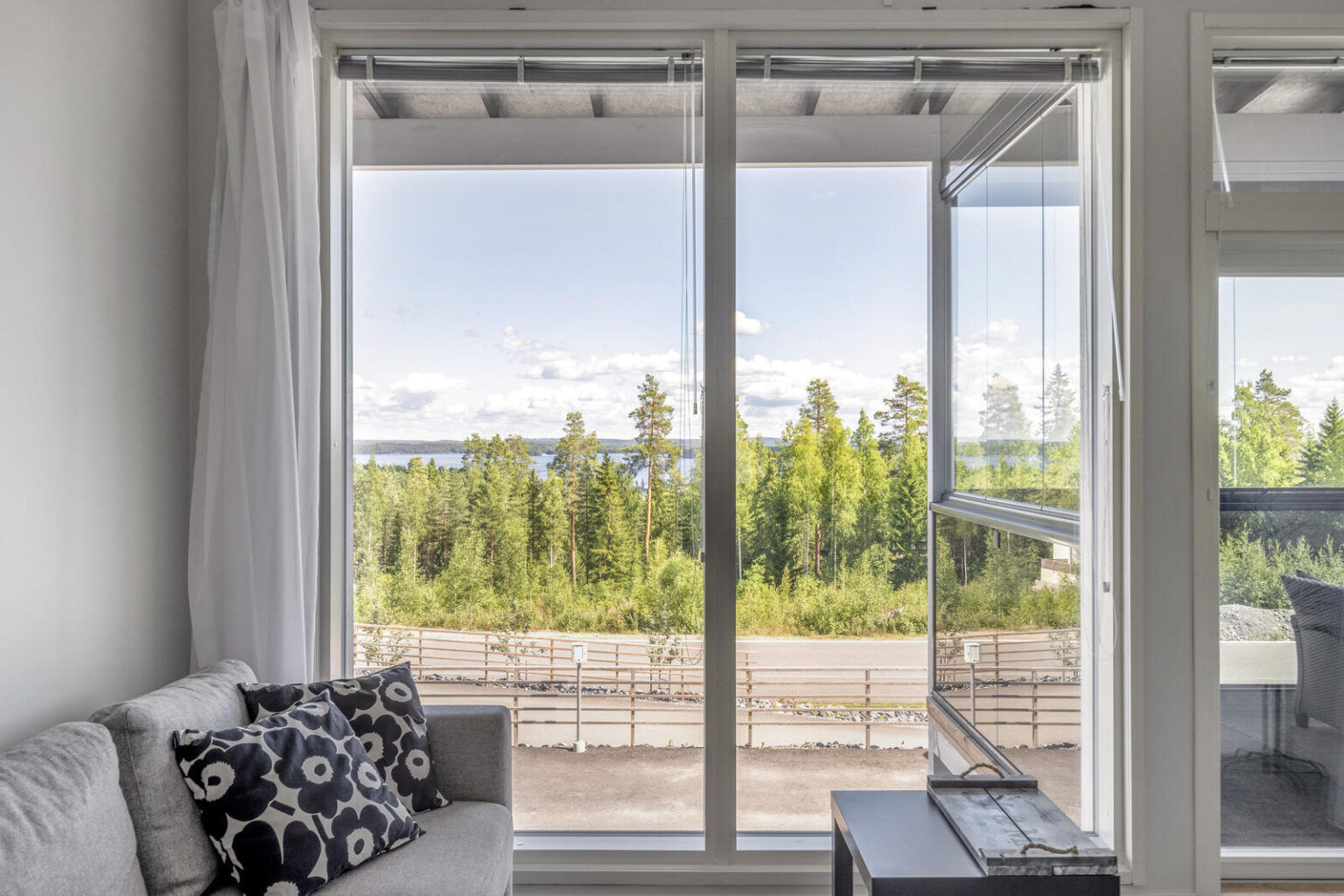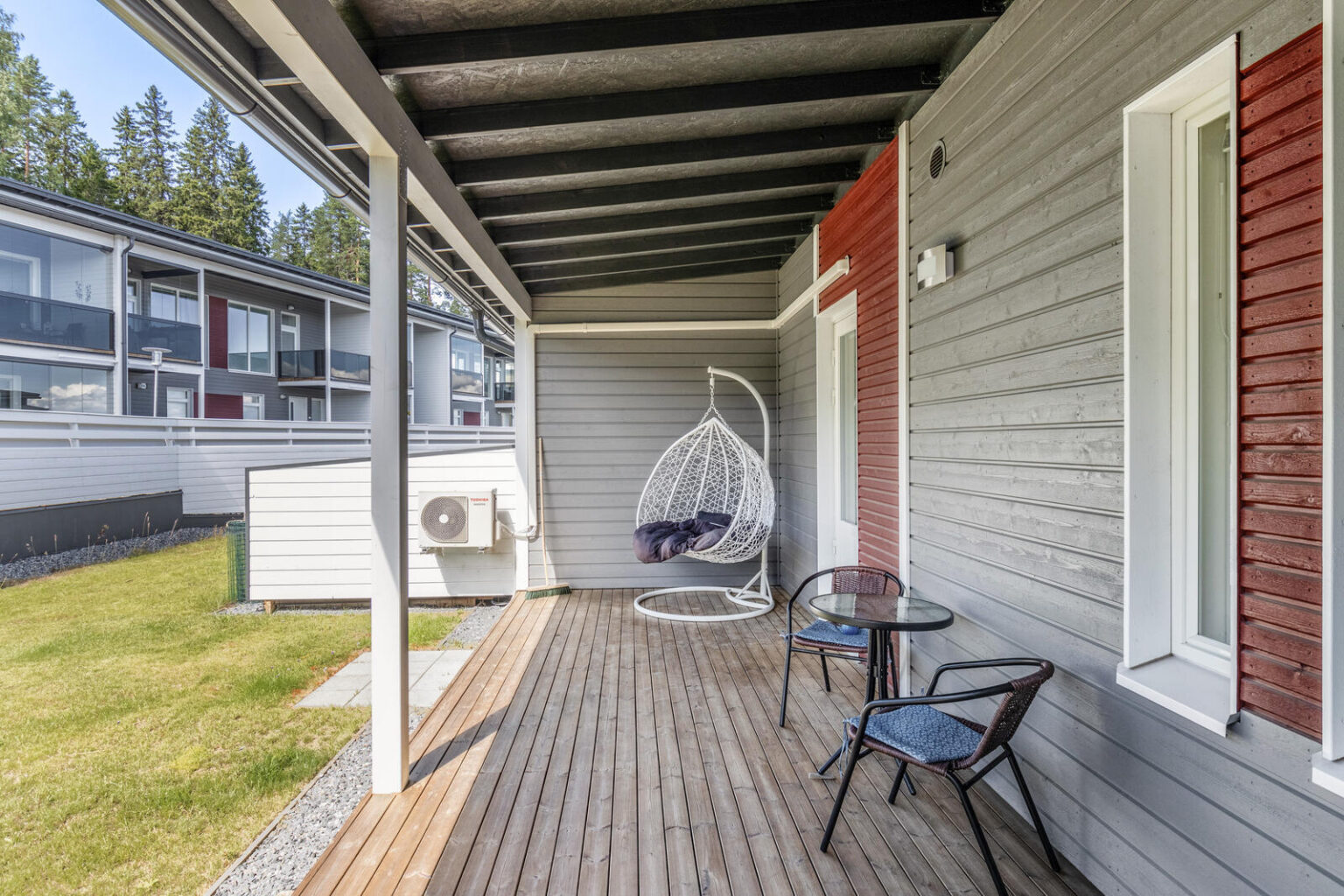 Avara olohuone ja keittiö muodostavat hyvän kokonaisuuden. Olohuoneesta on käynti lasitetulle parvekkeelle ja keittiöstä on kulku lasitetulle terassille ja piha-alueelle.