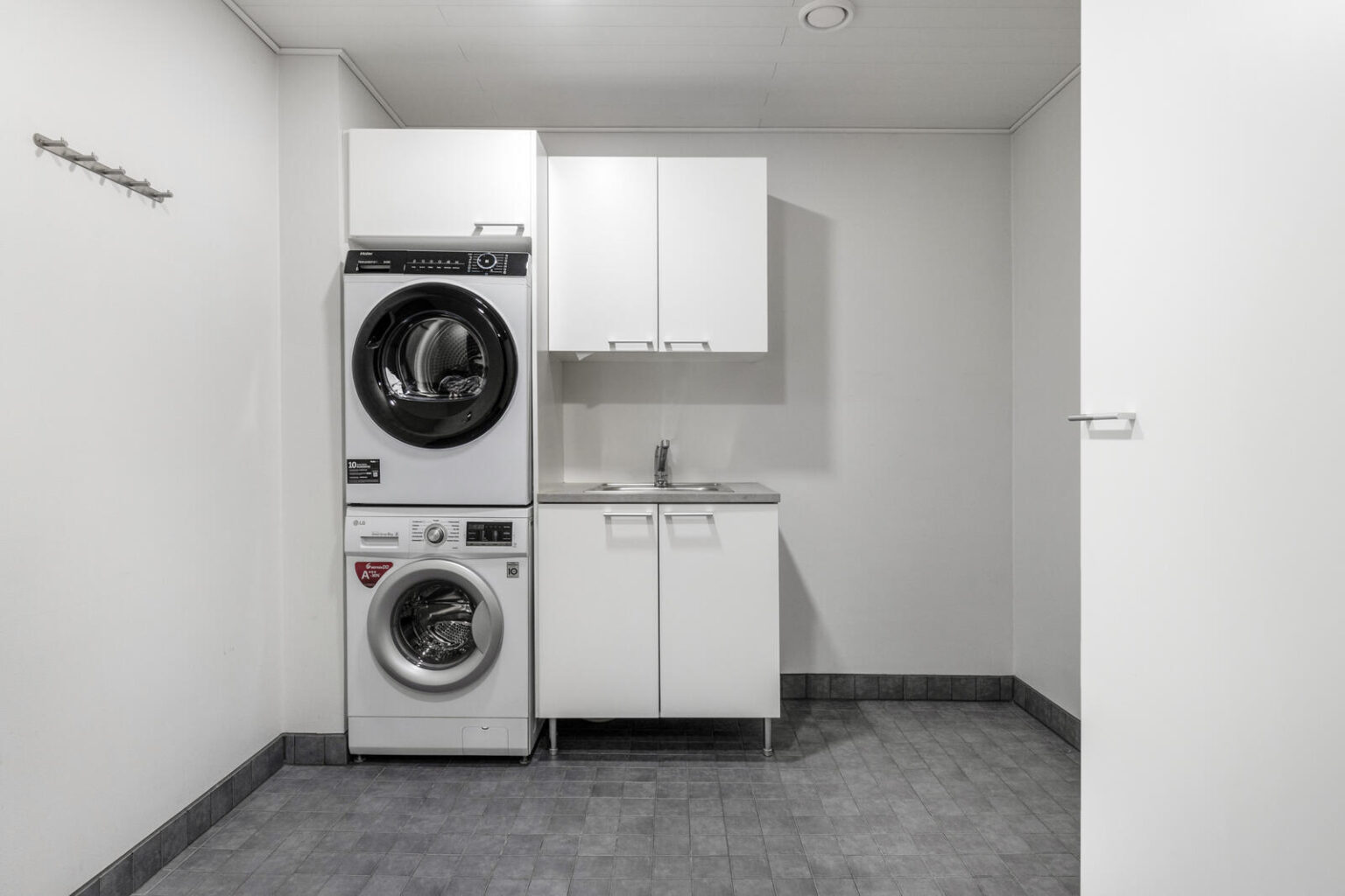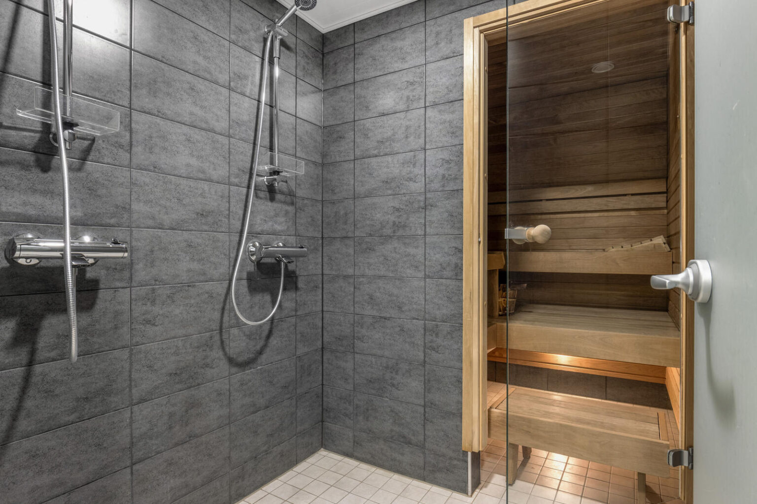 Kodin alakerrassa on autotallin ja varaston lisäksi yksi makuuhuone, hyvä kodinhoitohuone ja sauna/pesuhuonetilat. Saunassa on lämpökäsitelty haapapanelointi ja pesuhuoneessa on tietysti kaksi suihkua.