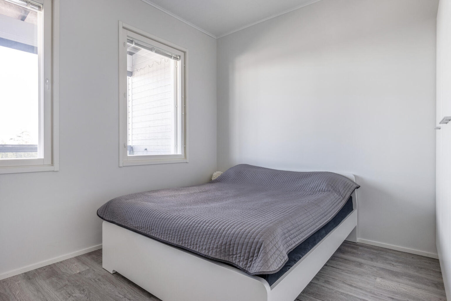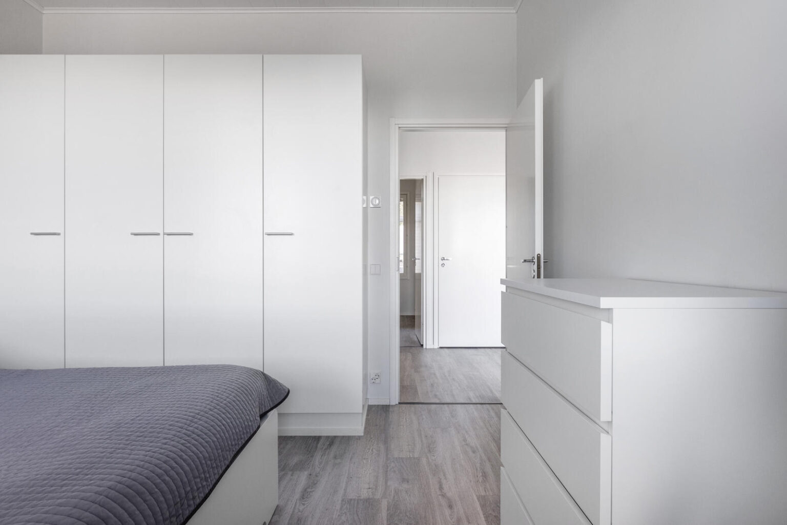 Yläkerrassa on kaksi hyvänkokoista makuuhuonetta, toisessa on kaapistoja ja toisessa on vaatehuone.