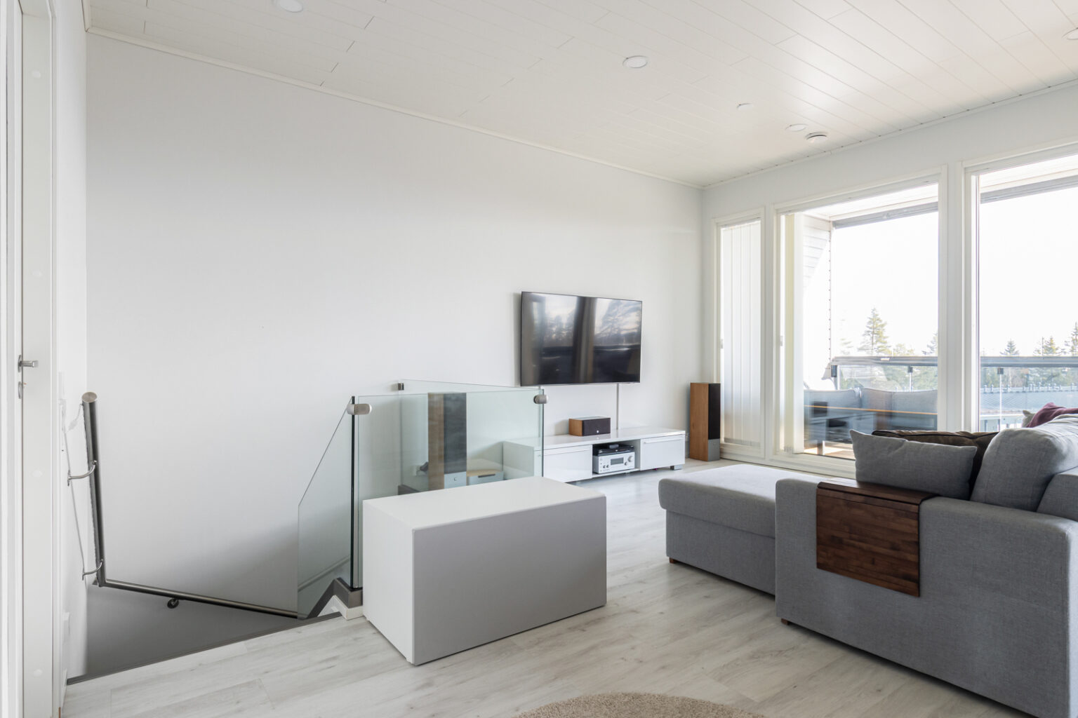Kodin yläkerrassa on kaksi makuuhuonetta, iso yhtenäinen olohuone-keittiö, WC sekä koko huoneiston levyinen lasitettu parveke. Toisesta yläkerran makuuhuoneesta on käynti takapihalle.