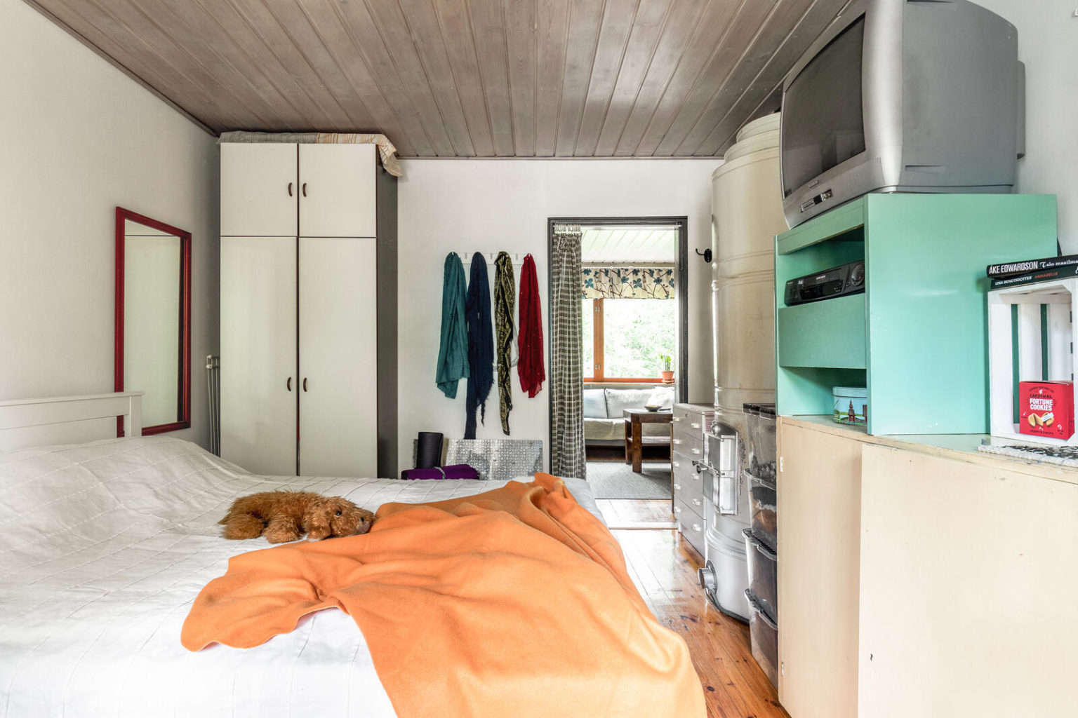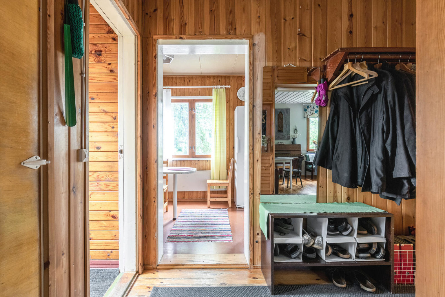 Sisääntulokerroksessa on eteisaula, wc, olohuone, makuuhuone ja keittiö. Yläkerrassa on kaksi makuuhuonetta ja wc-tila sekä vinttitilat. Kellarikerroksessa on yksi huonetila, wc, pesuhuone, sauna ja kodinhoitohuonetila sekä varastotilaa. Entinen autotalli on varastotilana.