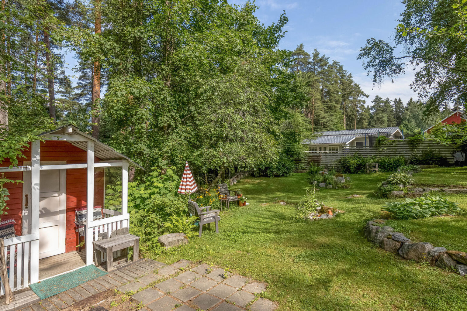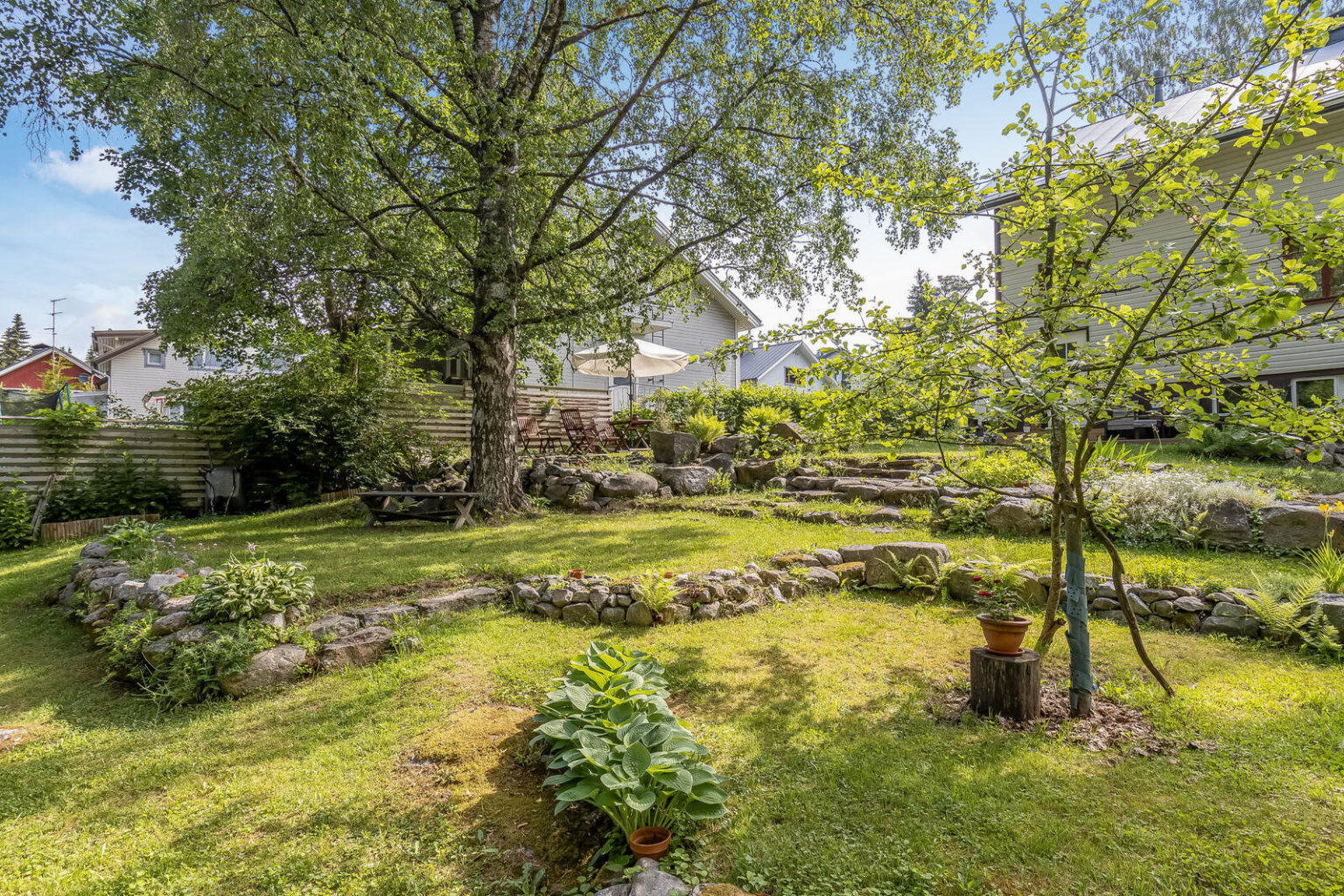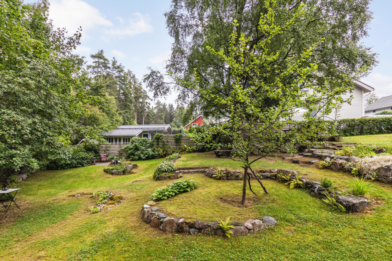 Ihana laitettu piha-alue, pihalla on leikkimökki.
