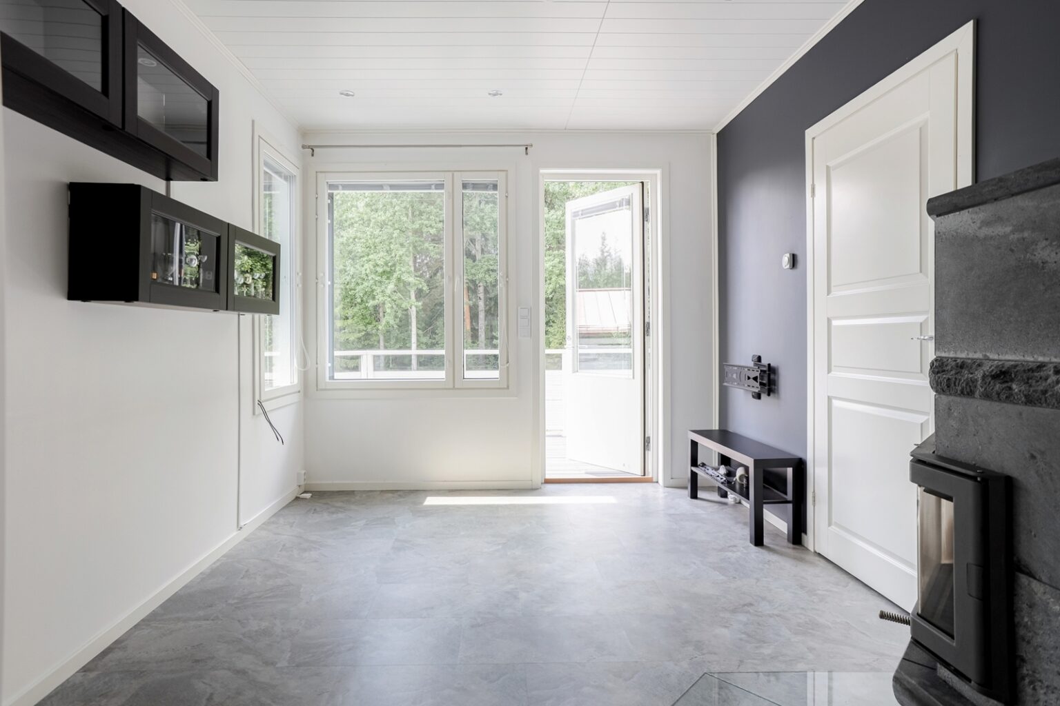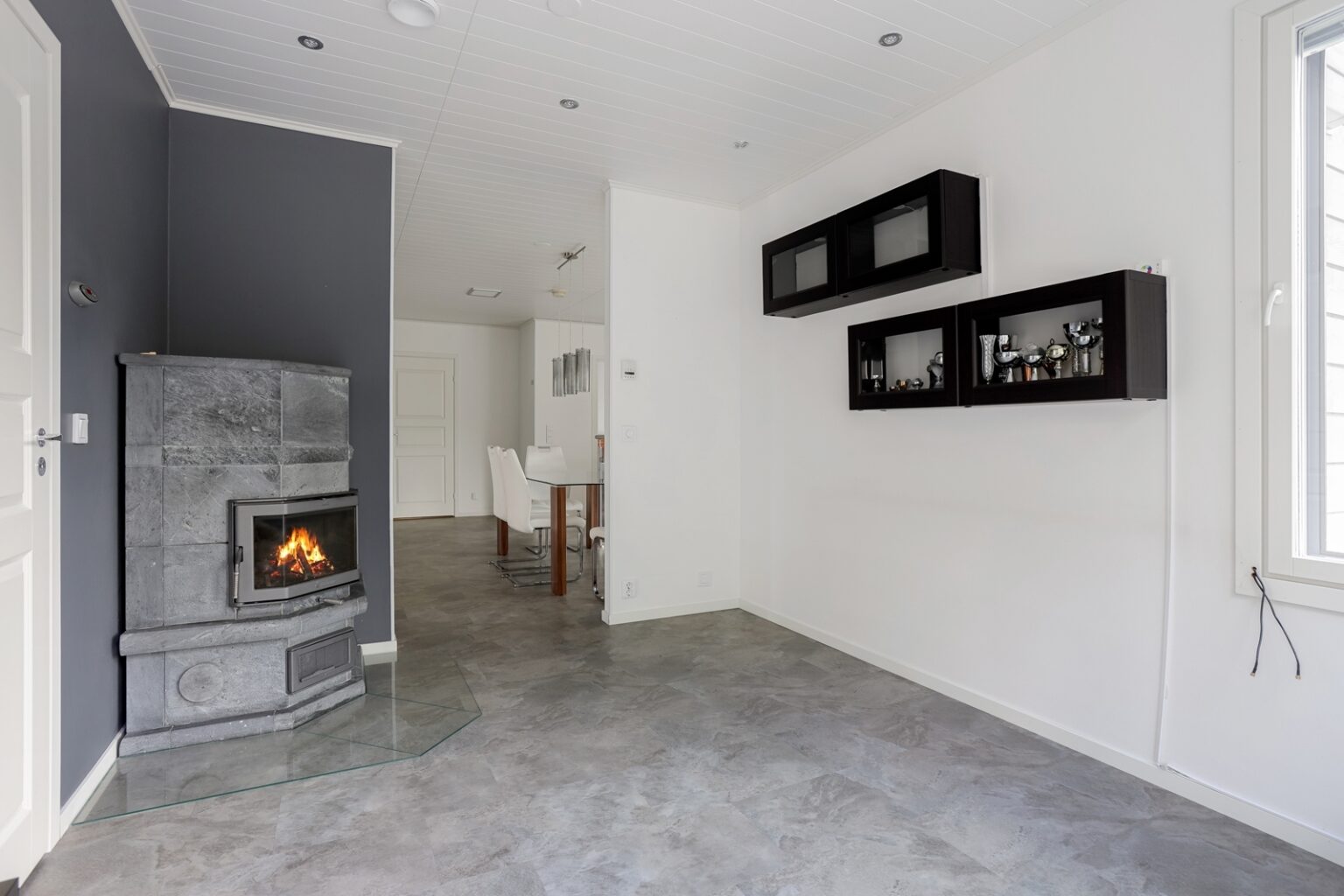 Tässä kodissa on varaava takka, joka tuo lämpöä talven pakkasille, ja ilmalämpöpumppu, joka säätelee mukavasti sisälämpötilaa ympäri vuoden. Lisäksi lattiat lämpiävät vesikiertoisella lattialämmityksellä (kaukolämpö).