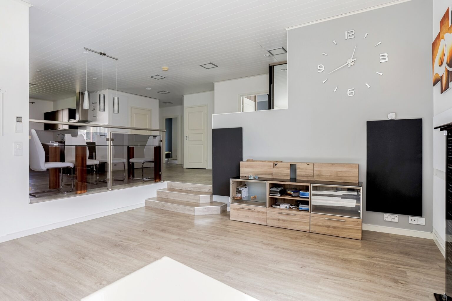 Olohuoneeseen laskee muutama porrasaskelma, joka lisää tilan ilmettä ja avaruutta.