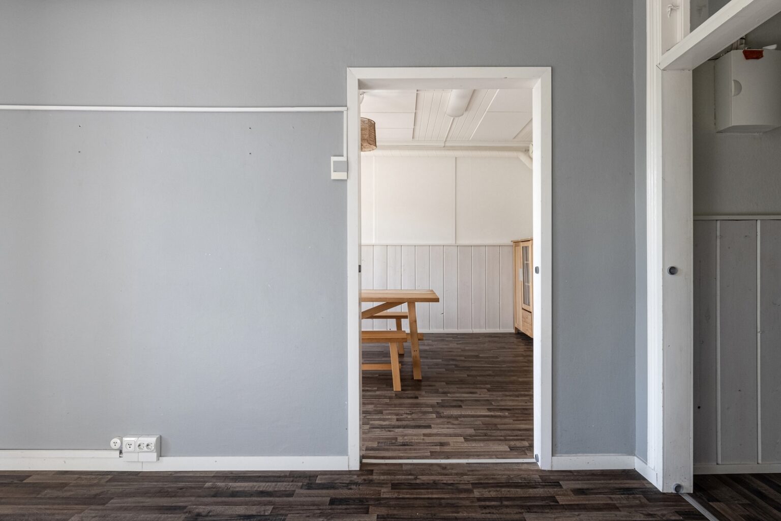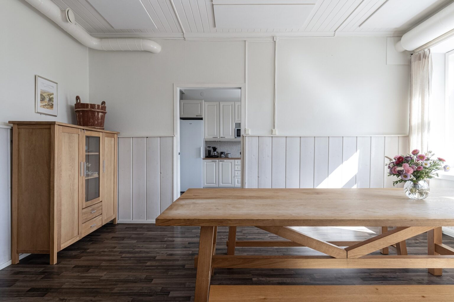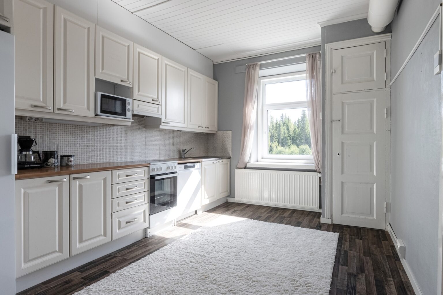 Yläkerta on nätisti remontoitu asuinkäyttöön 2012 – 2020. Sieltä löytyy tilava keittiö, ruokailuhuone, makuuhuoneita, olohuone, kylpyhuone, kodinhoitotila ja sauna.