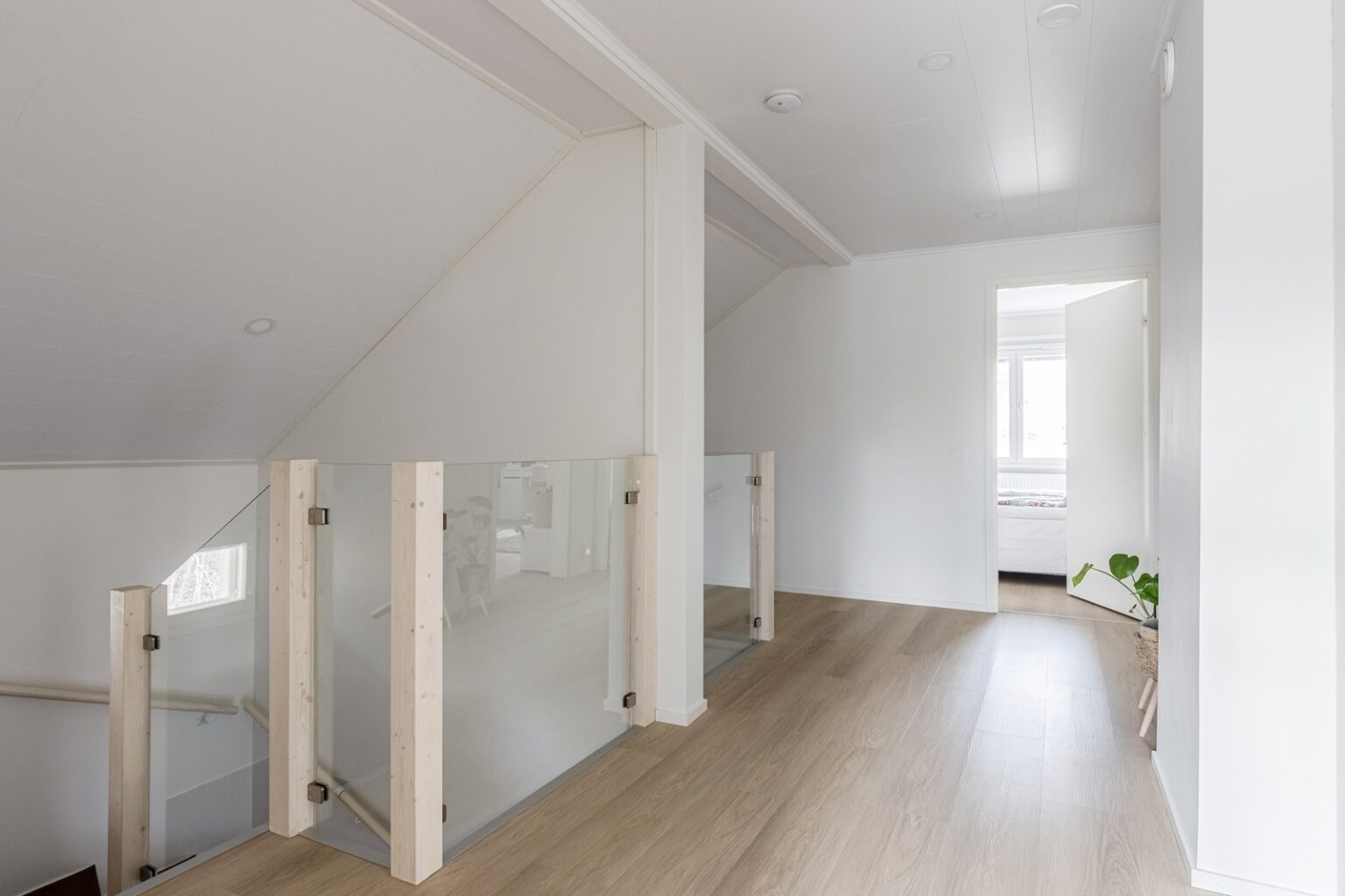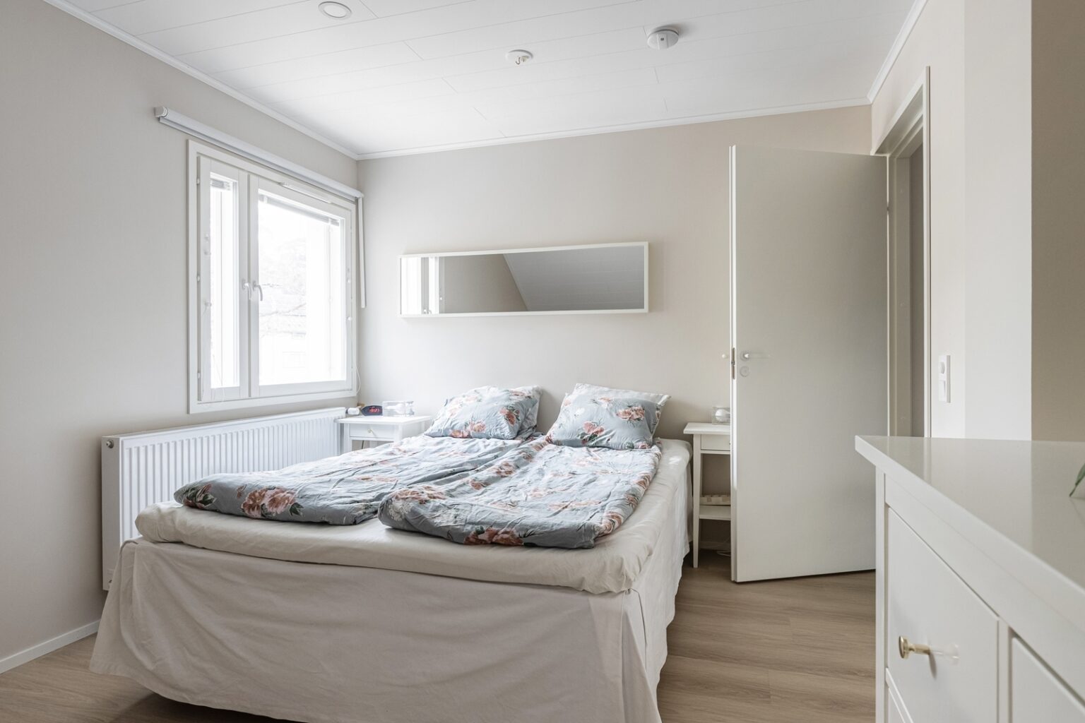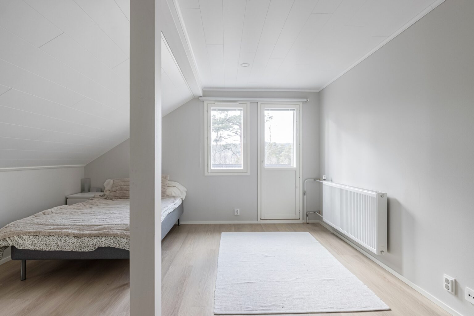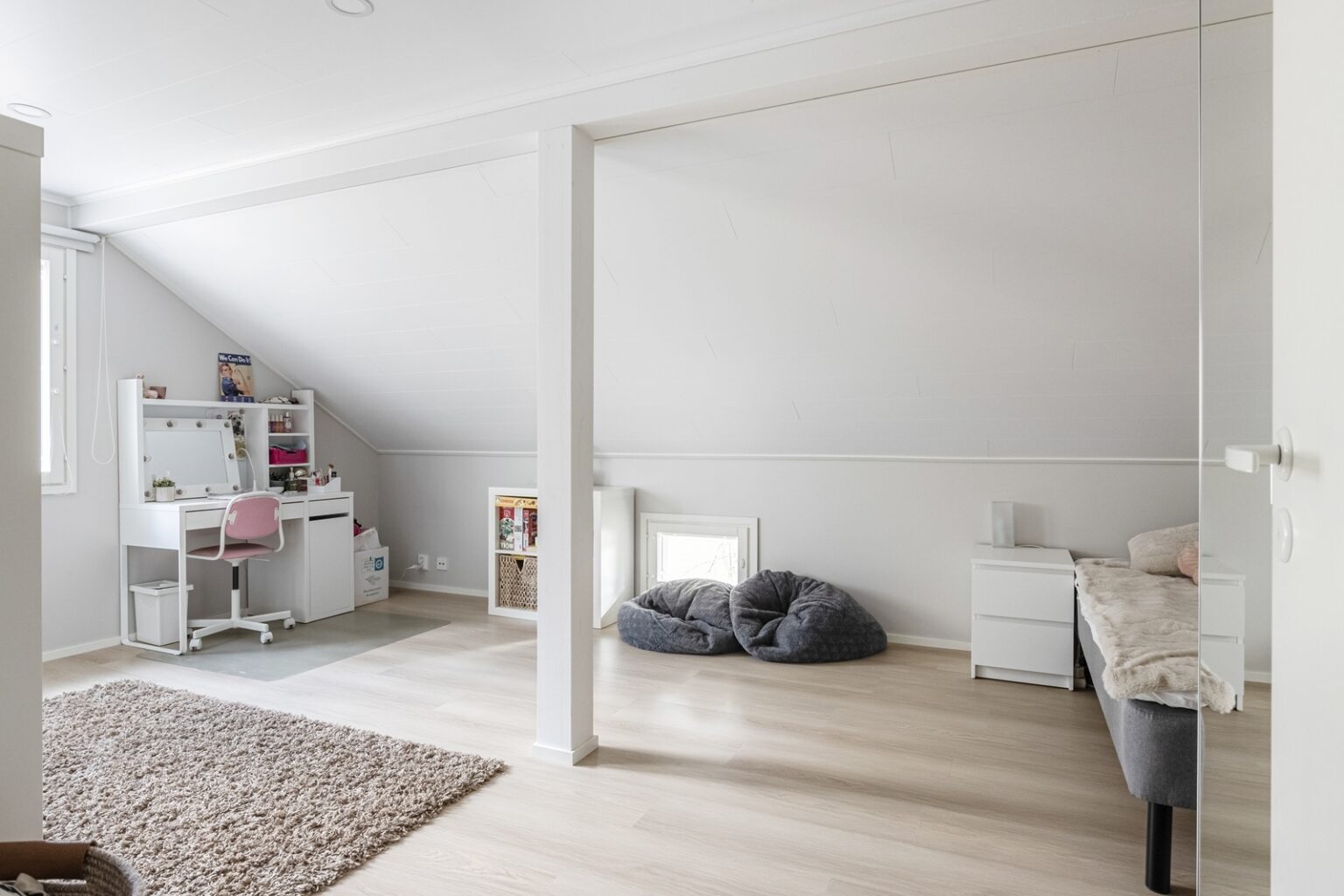 Yläkerta on kokonaisuudessaan uudistettu kattoa myöten ja tarjoaa neljä reilunkokoista makuuhuonetta sekä parvekkeen. Tilat ovat valoisat, toimivat ja helposti muunneltavissa perheen tarpeisiin.