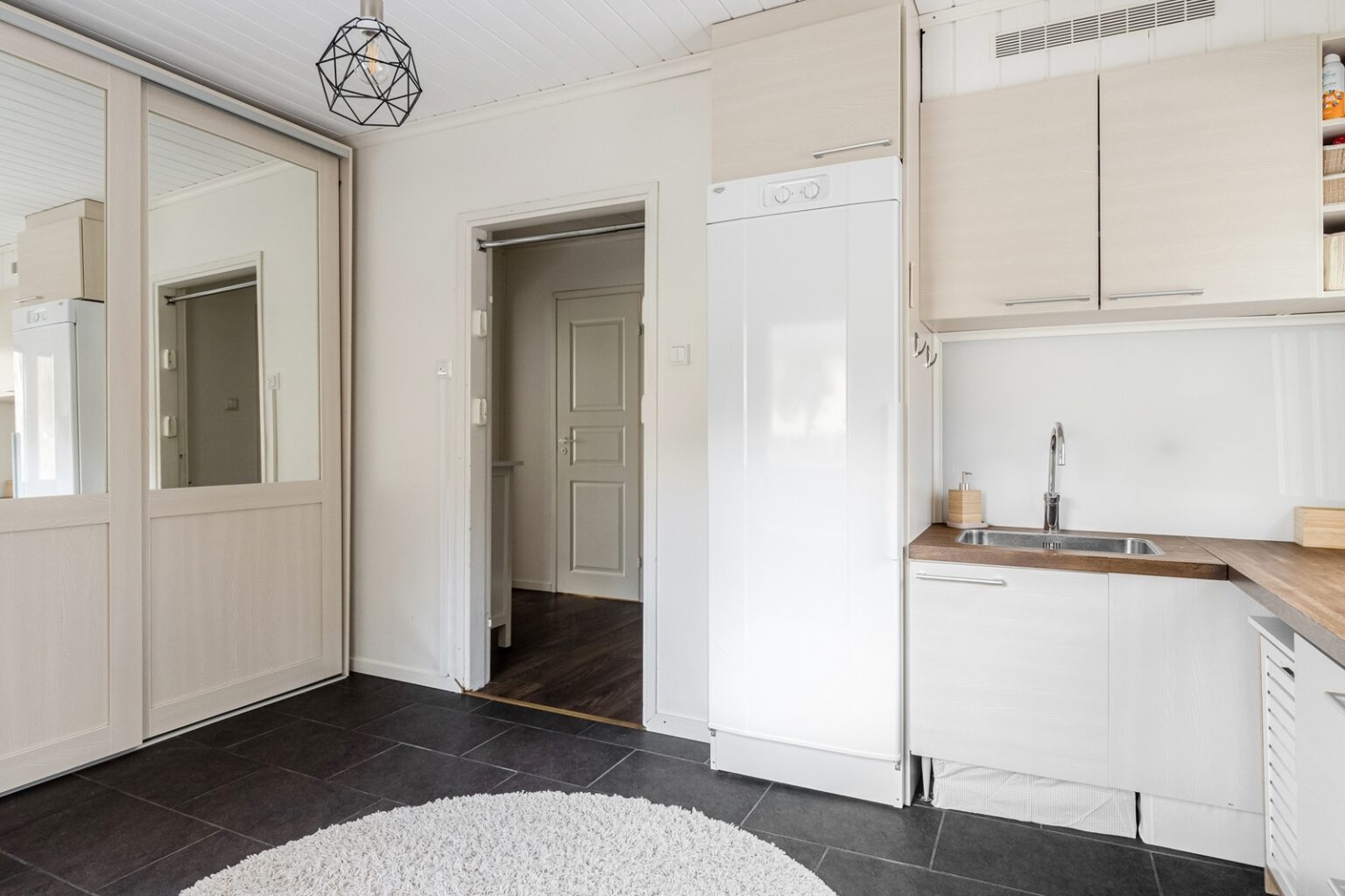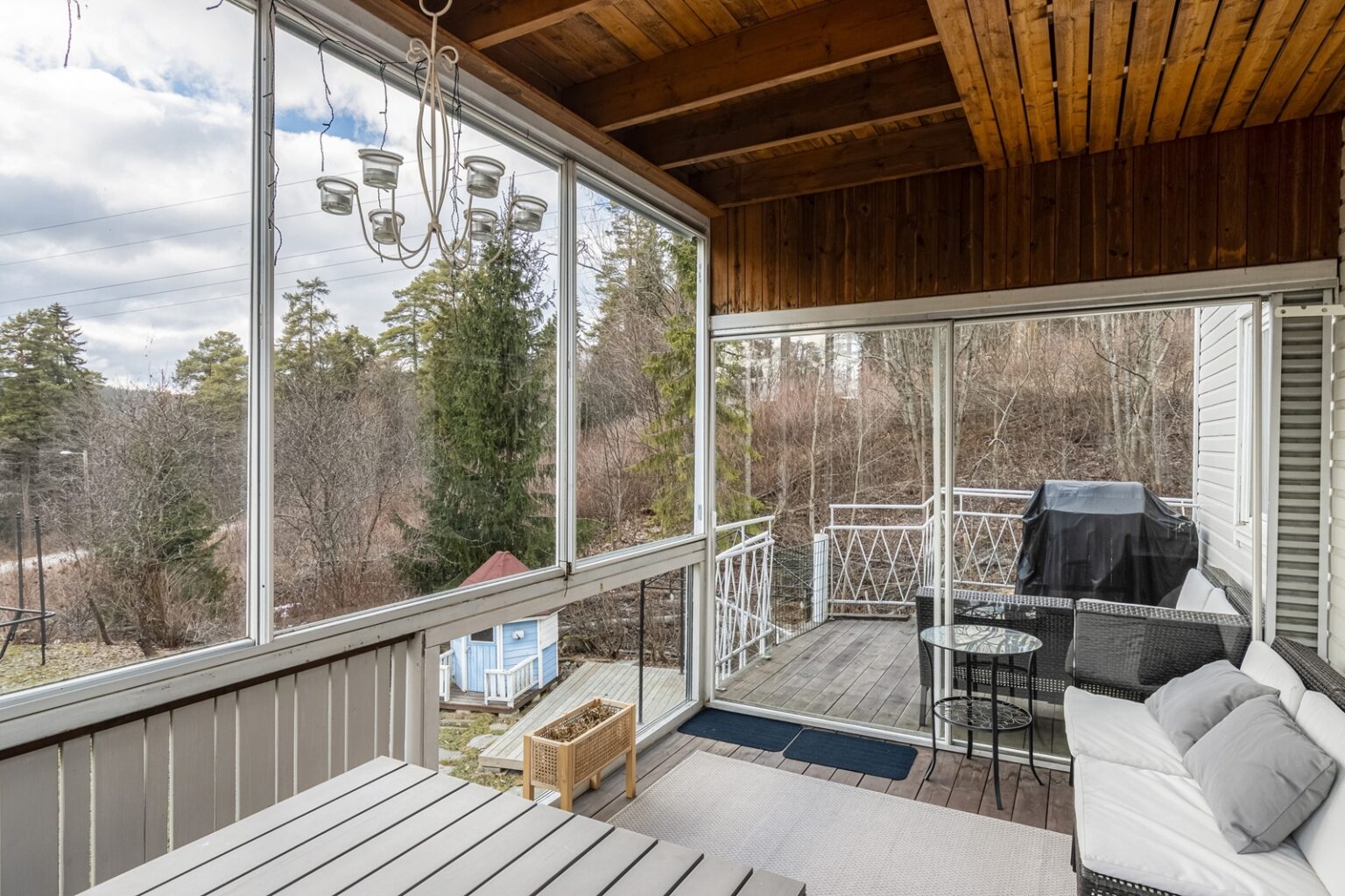 | Tilojen kuvaus | Lasitettu terassi ja avoterassi, josta on portaat pihalle. Yläkerran parvekkeella on markiisi. Apukeittiö, jossa on pesukoneliitäntä ja tilavaraus kuivausrummulle. Vesipiste. Kaapistot. Kuivauskaappi. |