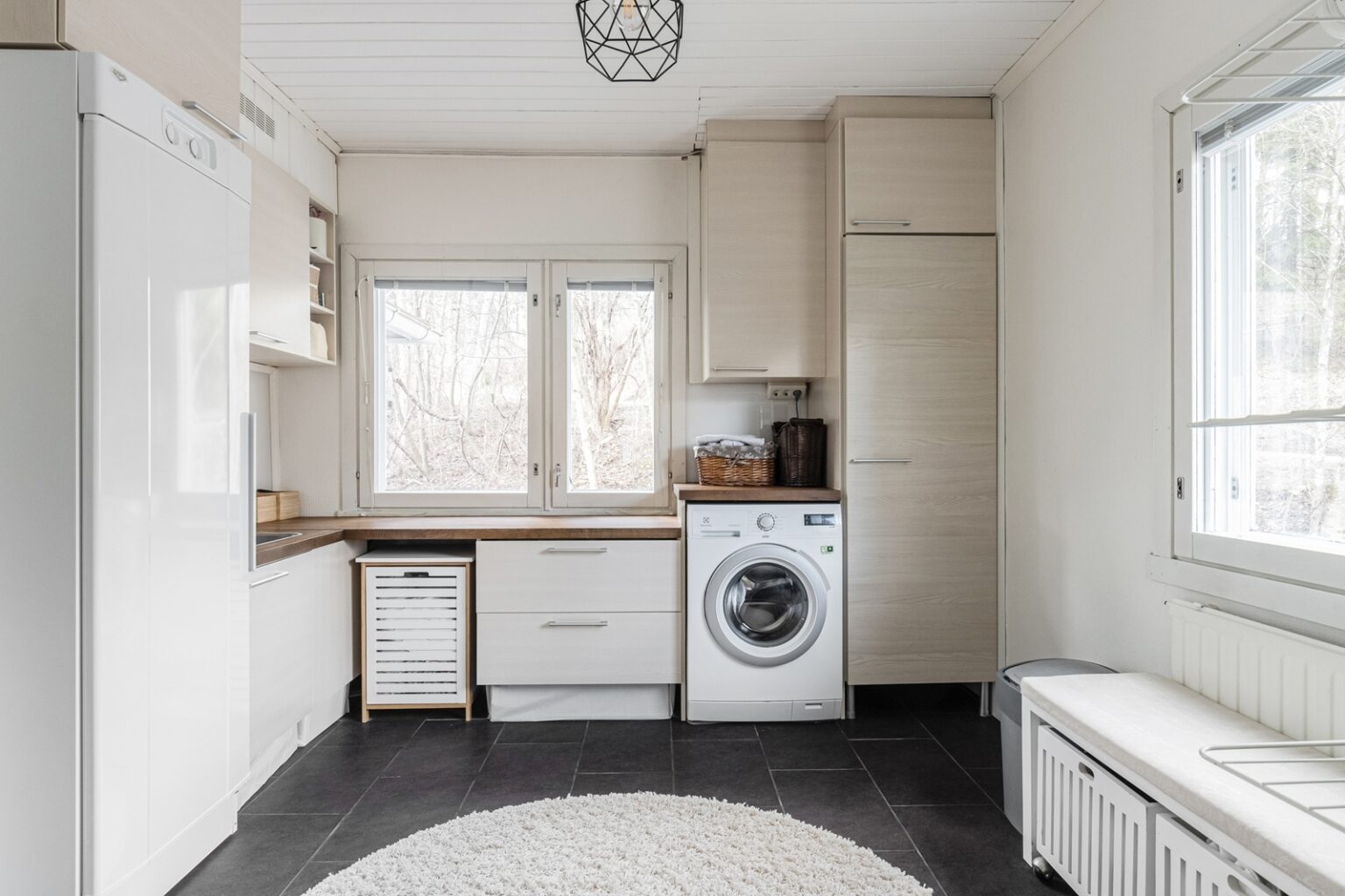 Kellarikerroksessa sijaitsevat tunnelmalliset sauna- ja pesutilat, joissa puukiuas tuo pehmeät löylyt. Lisäksi kerroksessa on wc pesukoneliitännällä, runsaasti varasto- ja harrastetilaa sekä erillinen huone, josta on käynti alakerran terassille.