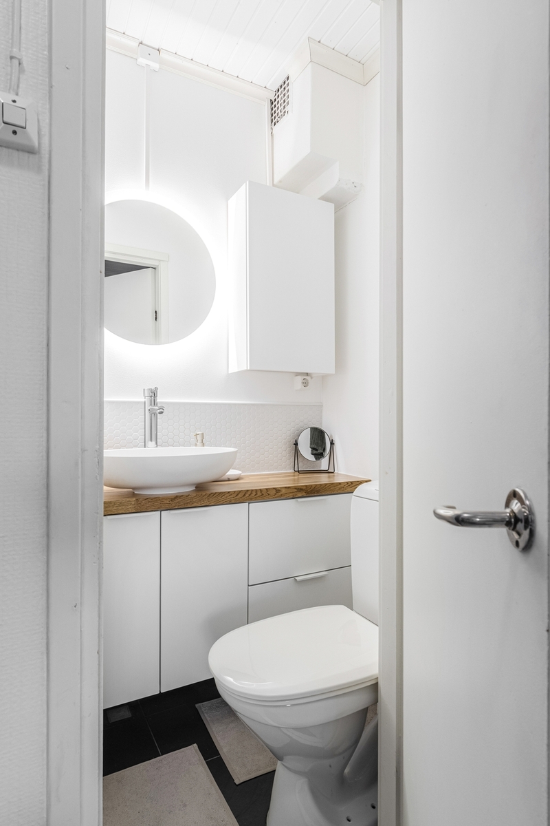 Keskikerros on suunniteltu arjen sujuvuutta ajatellen: käytössäsi on erinomainen apukeittiö, jossa pyykkihuolto hoituu vaivattomasti. Lisäksi kerroksessa on kaksi remontoitua wc-tilaa.