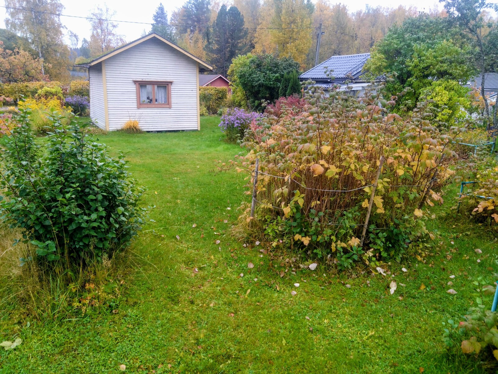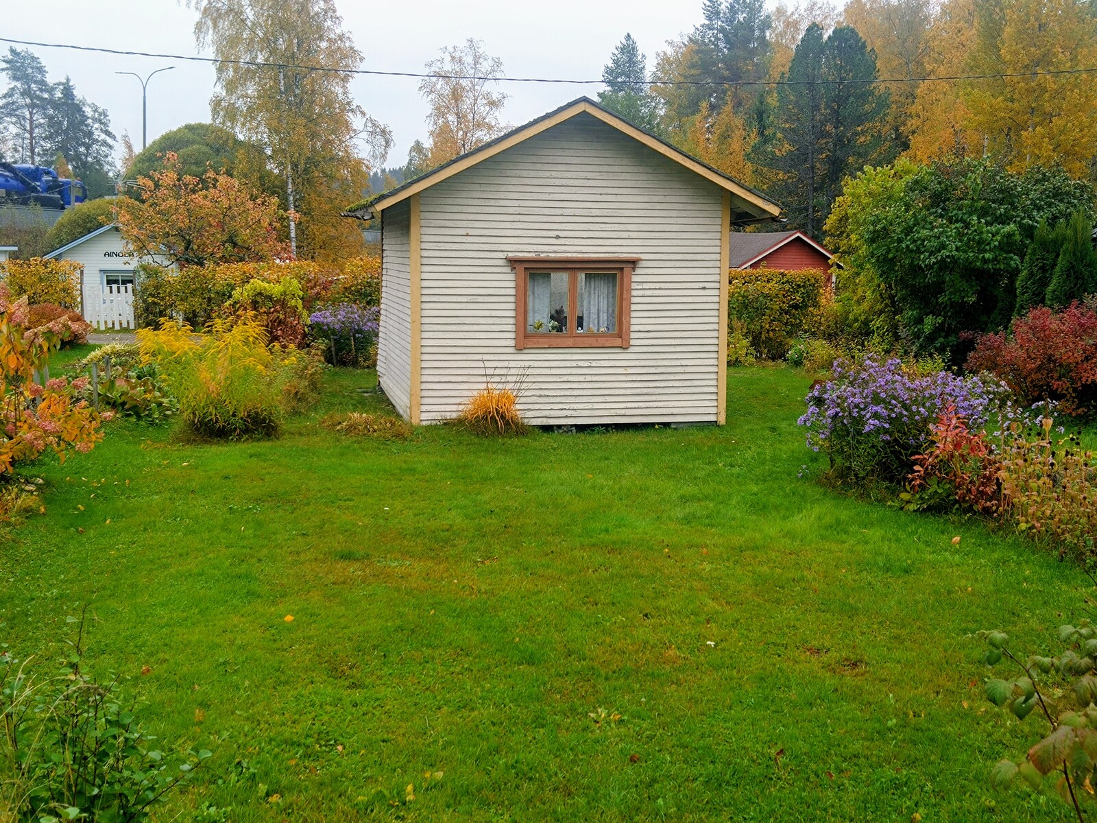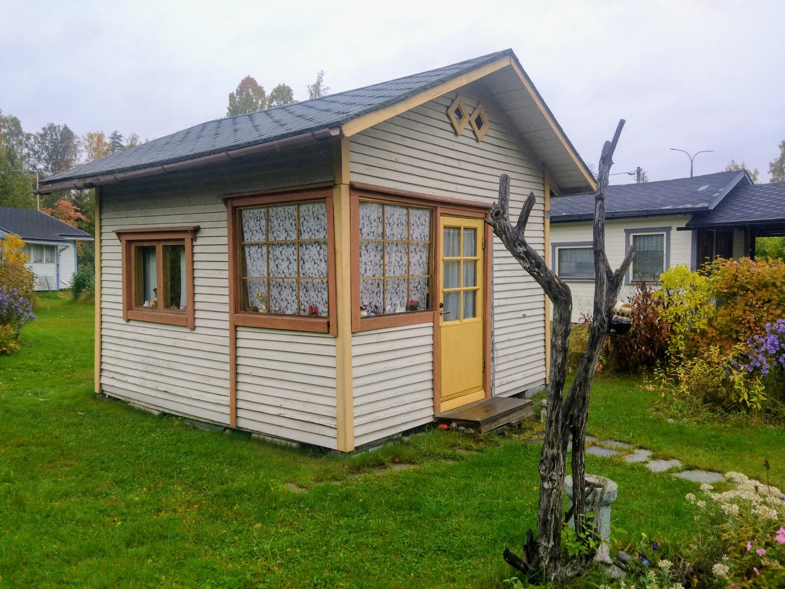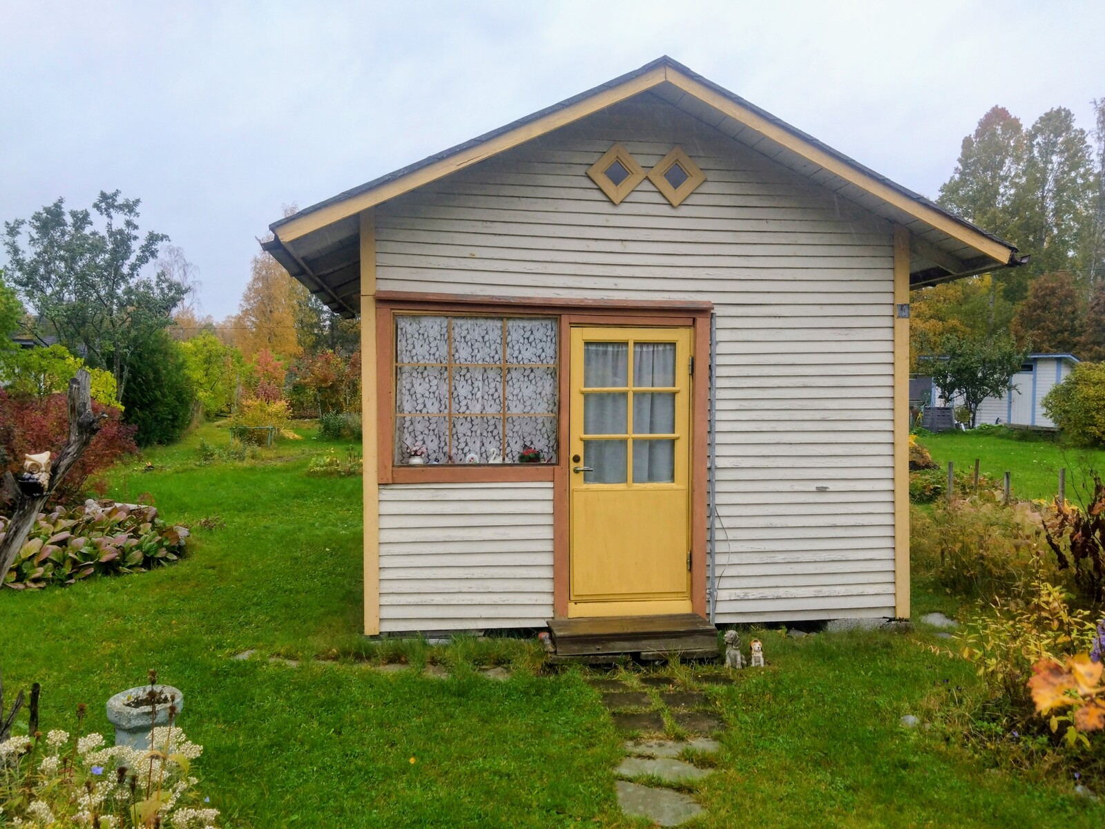 Nätillä pihalla varustettu vaatimaton siirtolapuutarhamökki Majaniemen Siirtolapuutarha-alueella Iso-Valkeisen rantamaisemissa.
