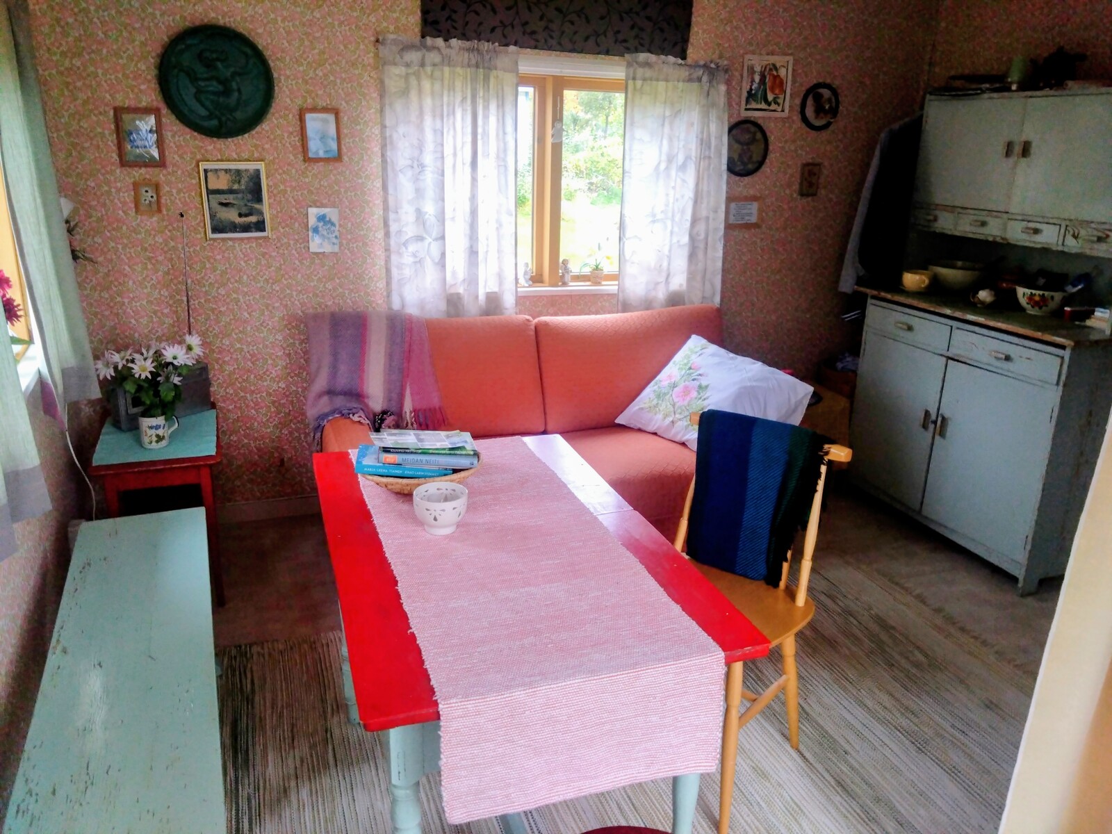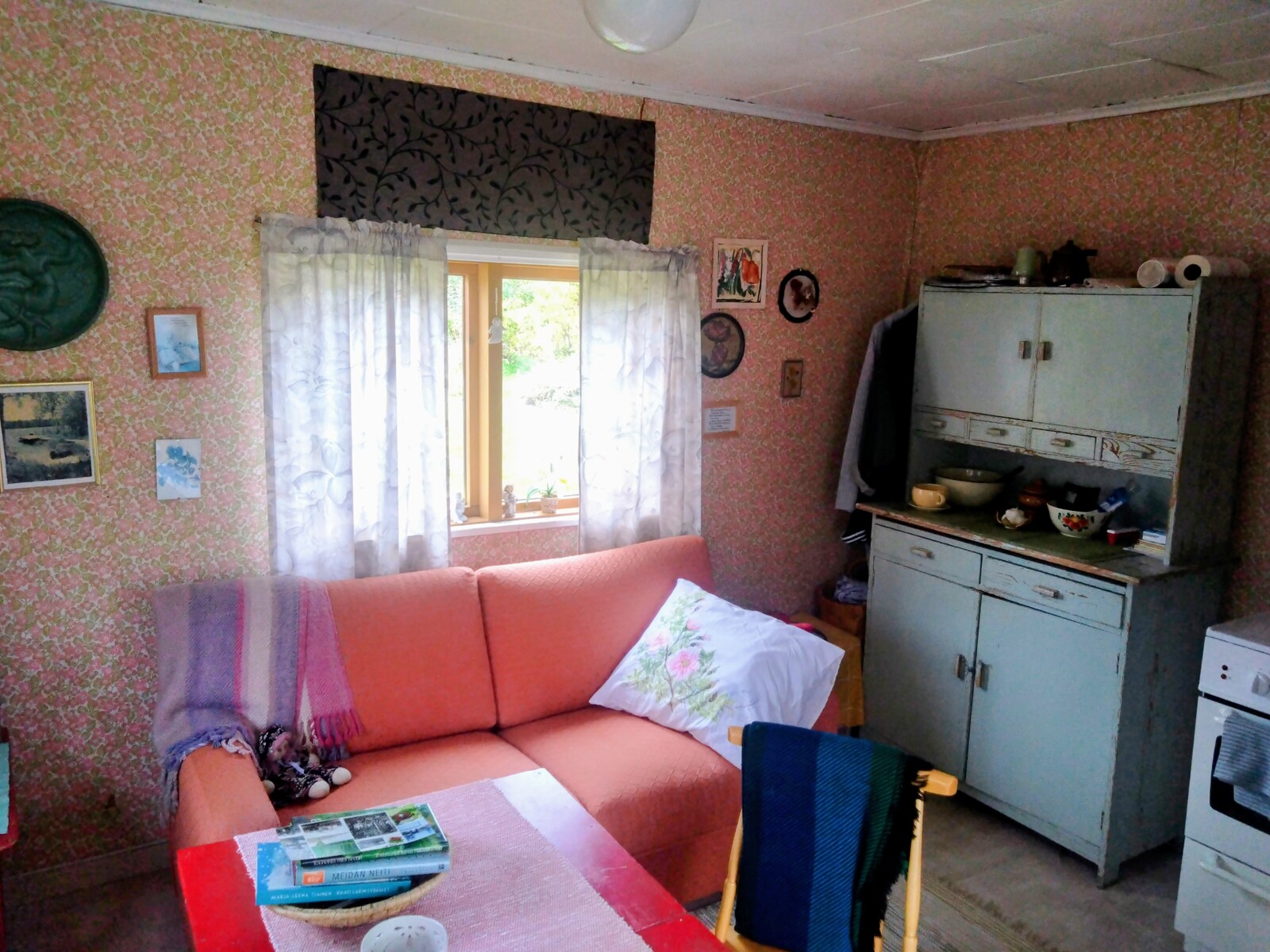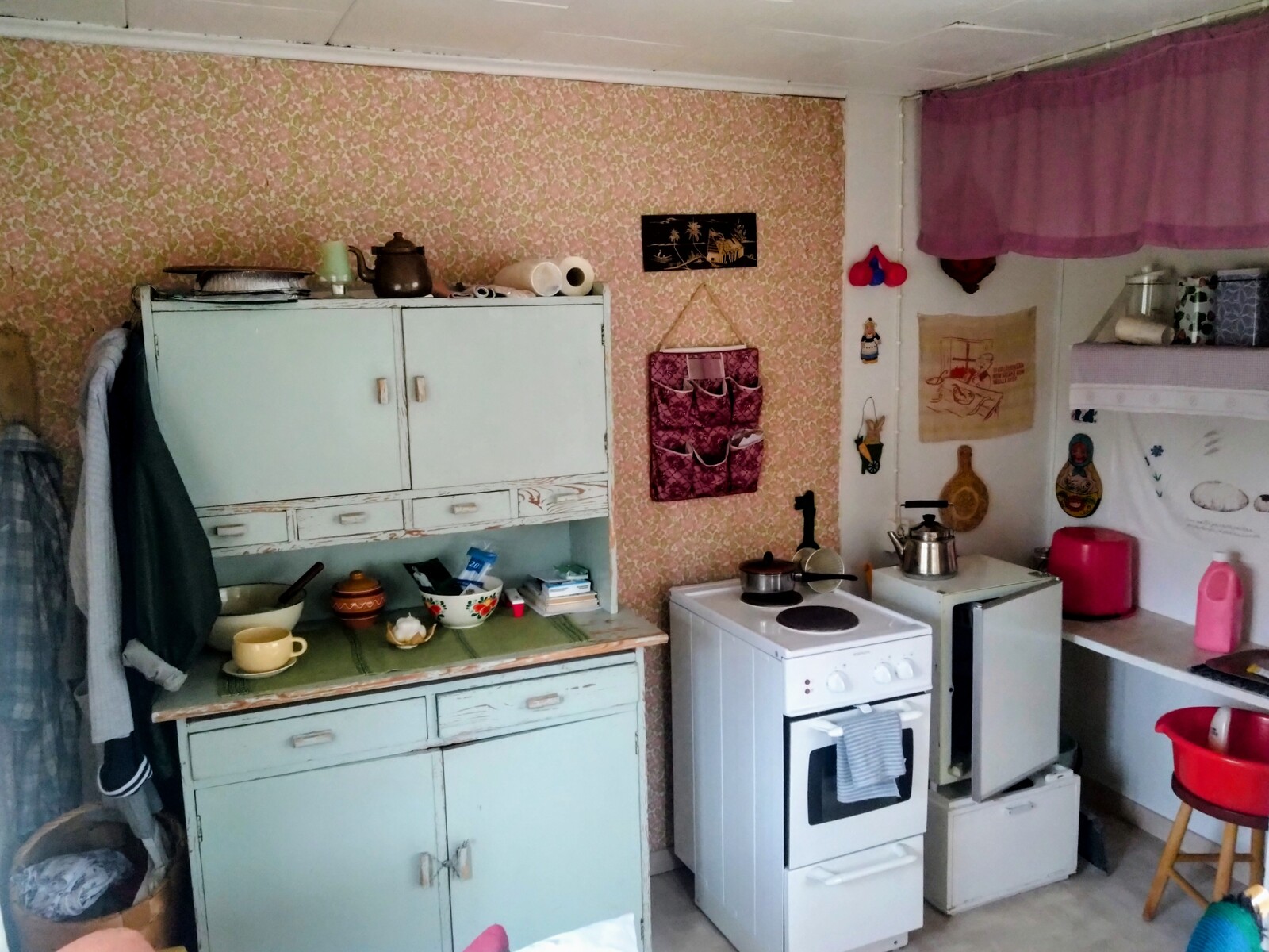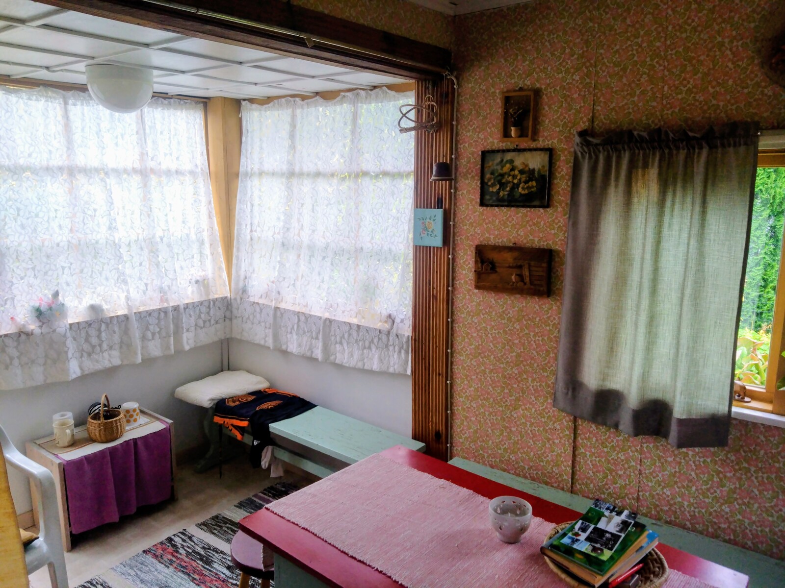 Nätillä pihalla varustettu vaatimaton siirtolapuutarhamökki Majaniemen Siirtolapuutarha-alueella Iso-Valkeisen rantamaisemissa.