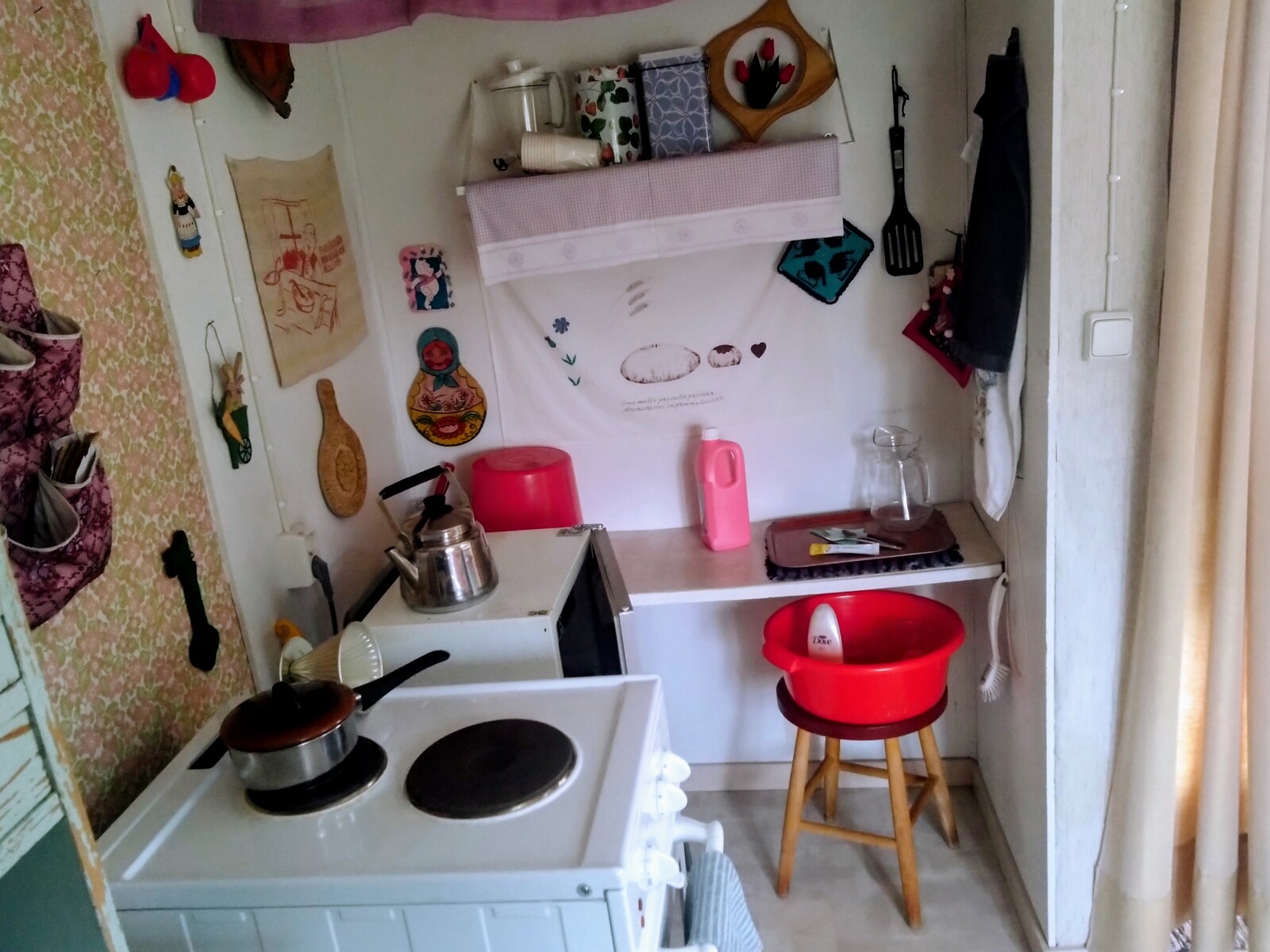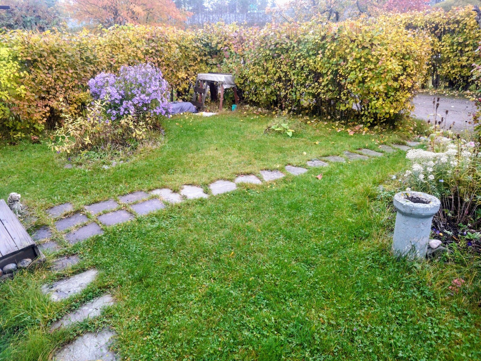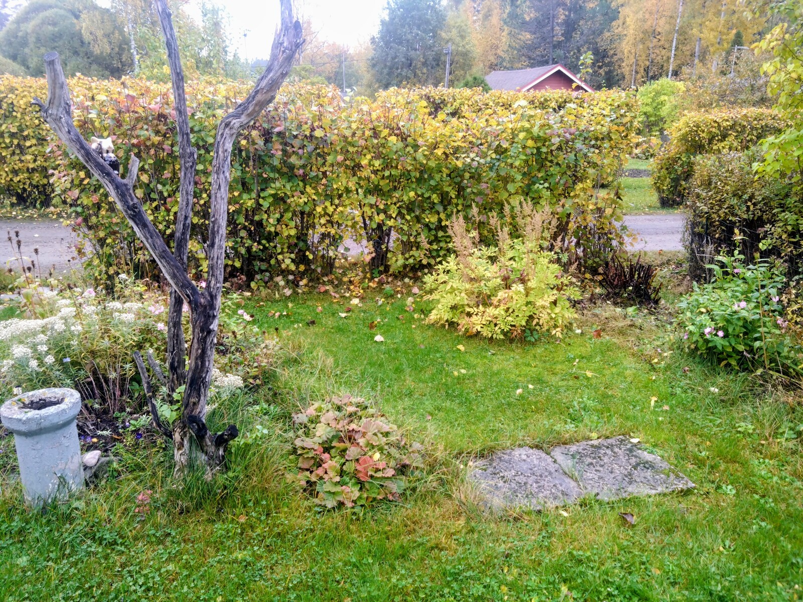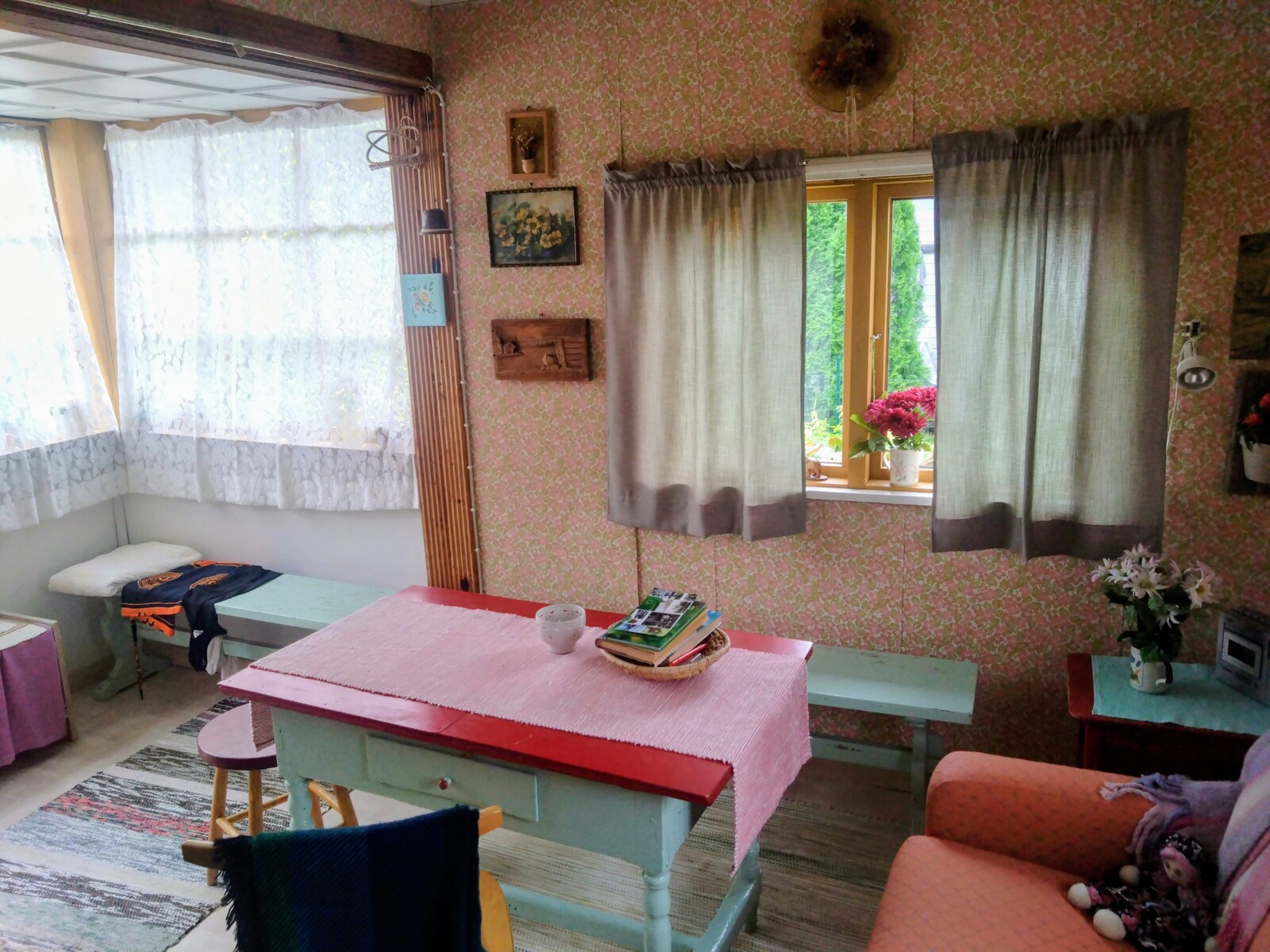Nätillä pihalla varustettu vaatimaton siirtolapuutarhamökki Majaniemen Siirtolapuutarha-alueella Iso-Valkeisen rantamaisemissa.